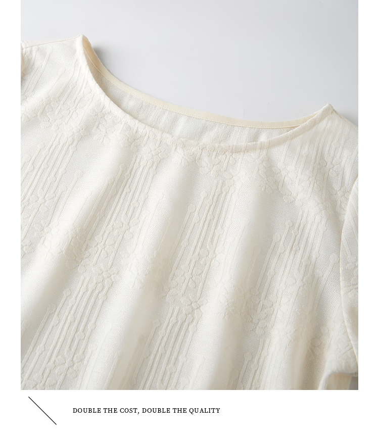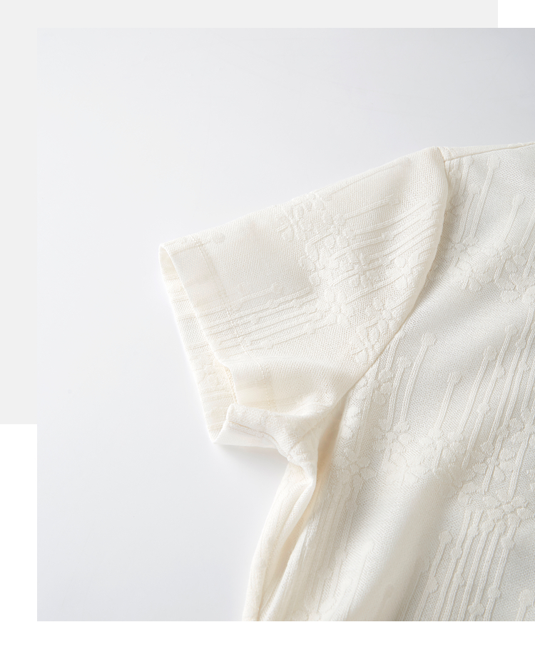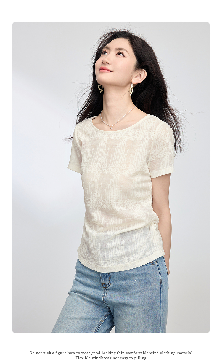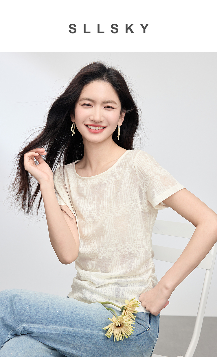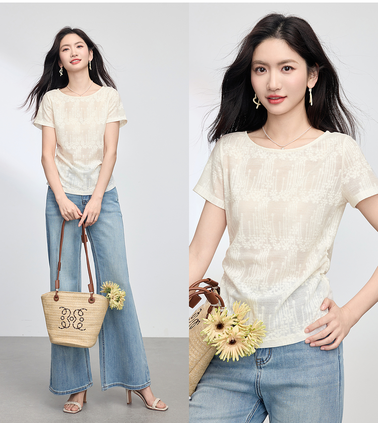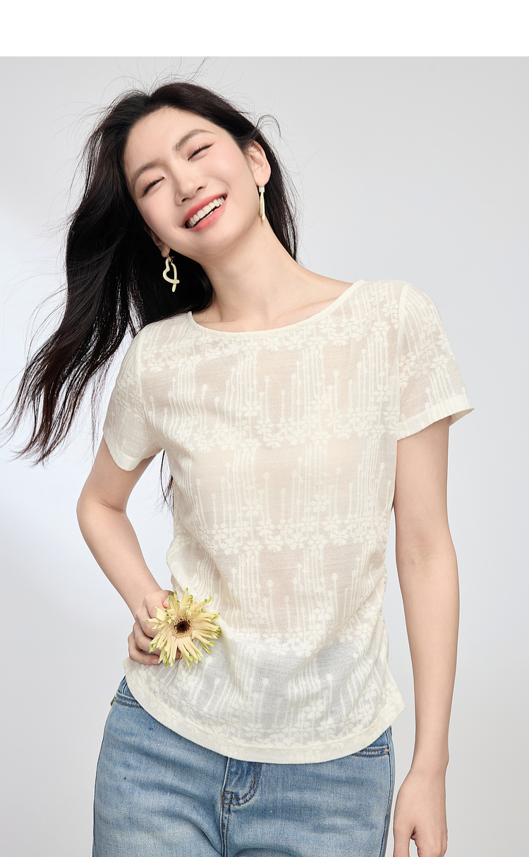 【周四狂欢价】熙世界波嬉风抽褶收腰T恤女短袖夏季新款设计感船领提花显瘦上衣