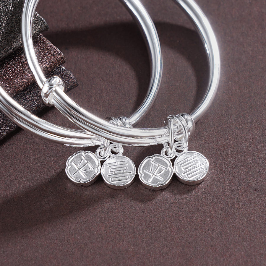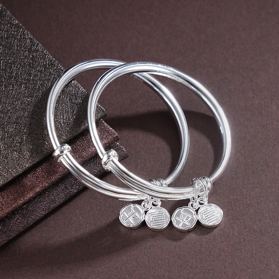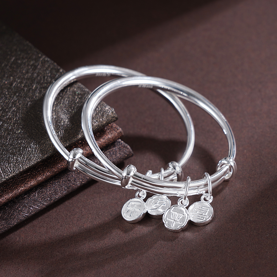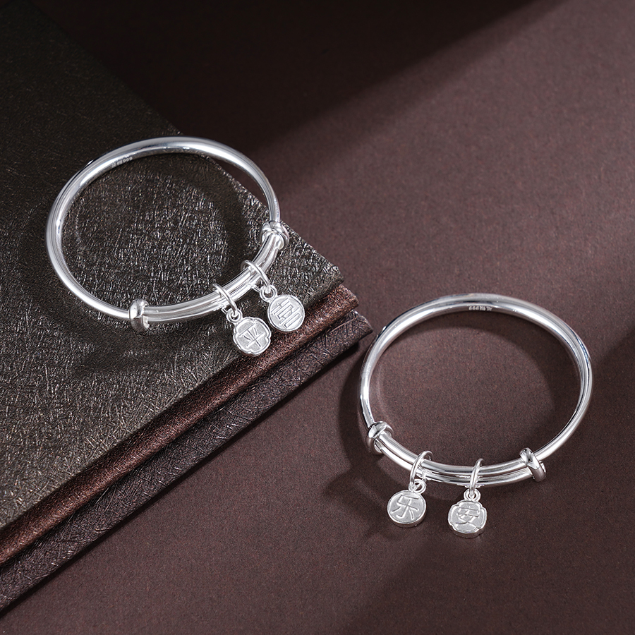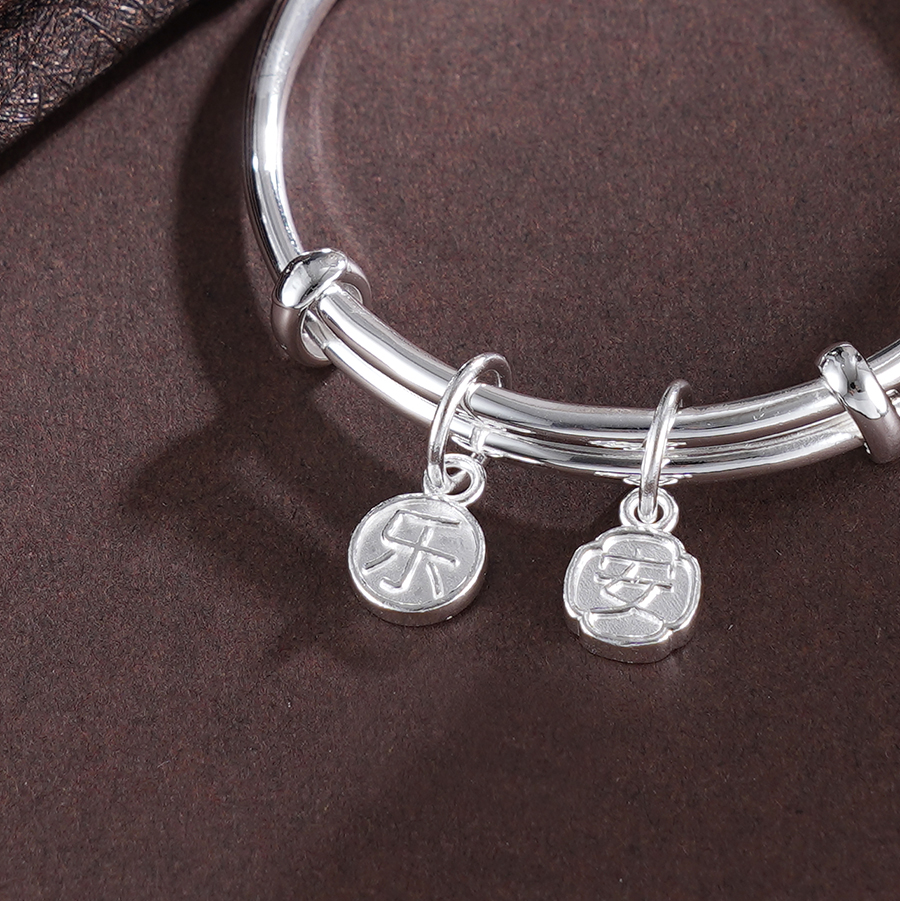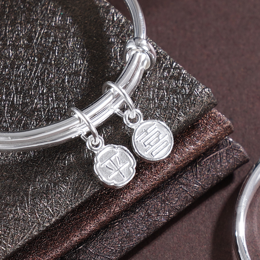 【寓意】:纯银推拉手镯。通体抛光打磨,光滑细腻,点缀“平安喜乐”小坠饰,增添了一抹灵动之美,更寓意平安喜乐,永远相随。