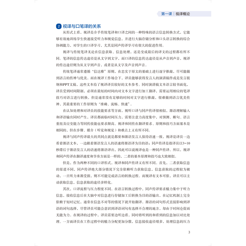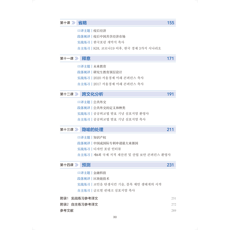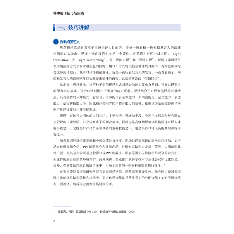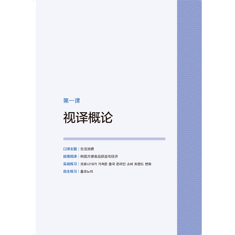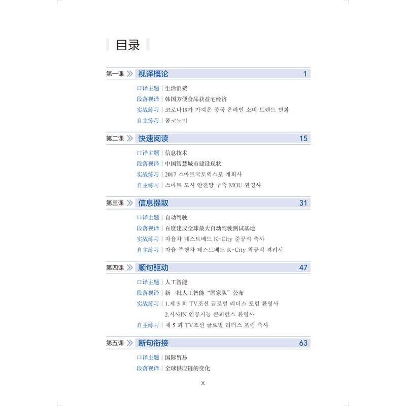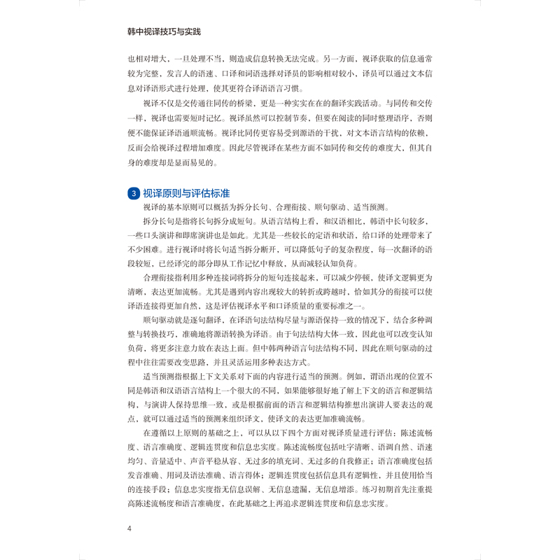 《韩中视译技巧与实践》由十四课组成,口译技巧与主题训练相结合。每课由四部分组成:技巧讲解、段落视译、实战练习、自主练习。技巧讲解部分针对视译的常用技巧进行详细讲解,每课突出一个重点,分别介绍不同类型的句型在视译中的常用技巧,并通过解析大量代表性例句进行示范和具体讲解。段落视译选取学生相对熟悉的相关内容,使学生可以在练习过程中逐步提高速度。针对同一段源语,展现交传和视译的不同处理方法,使学生逐步适应视译的思维特点,为实战练习做准备。实战练习和自主练习以正式的会议演讲为主。实战练习选取课文中的难句进行讲解,展示如何运用所学技巧进行分解处理,帮助学生顺利完成完整语篇的视译。自主练习通过同一主题的语篇加大训练量,学生在课下运用所学技巧。实战练习和自主练习均附有参考译文,供学生参考。
