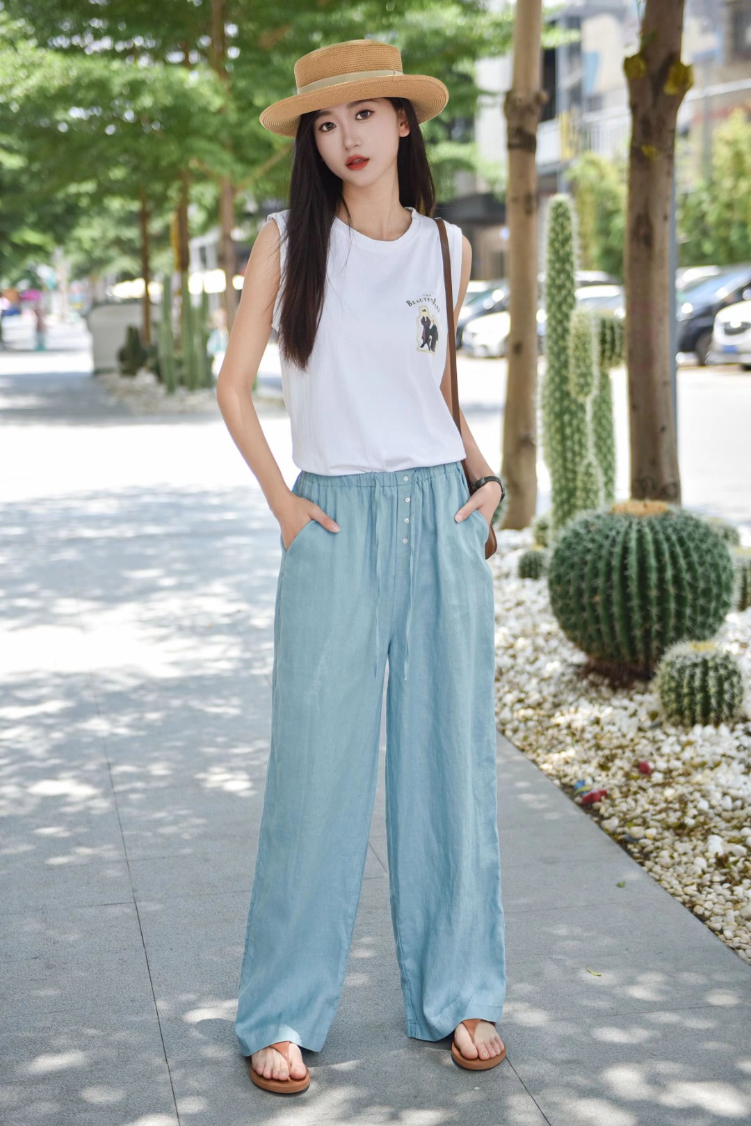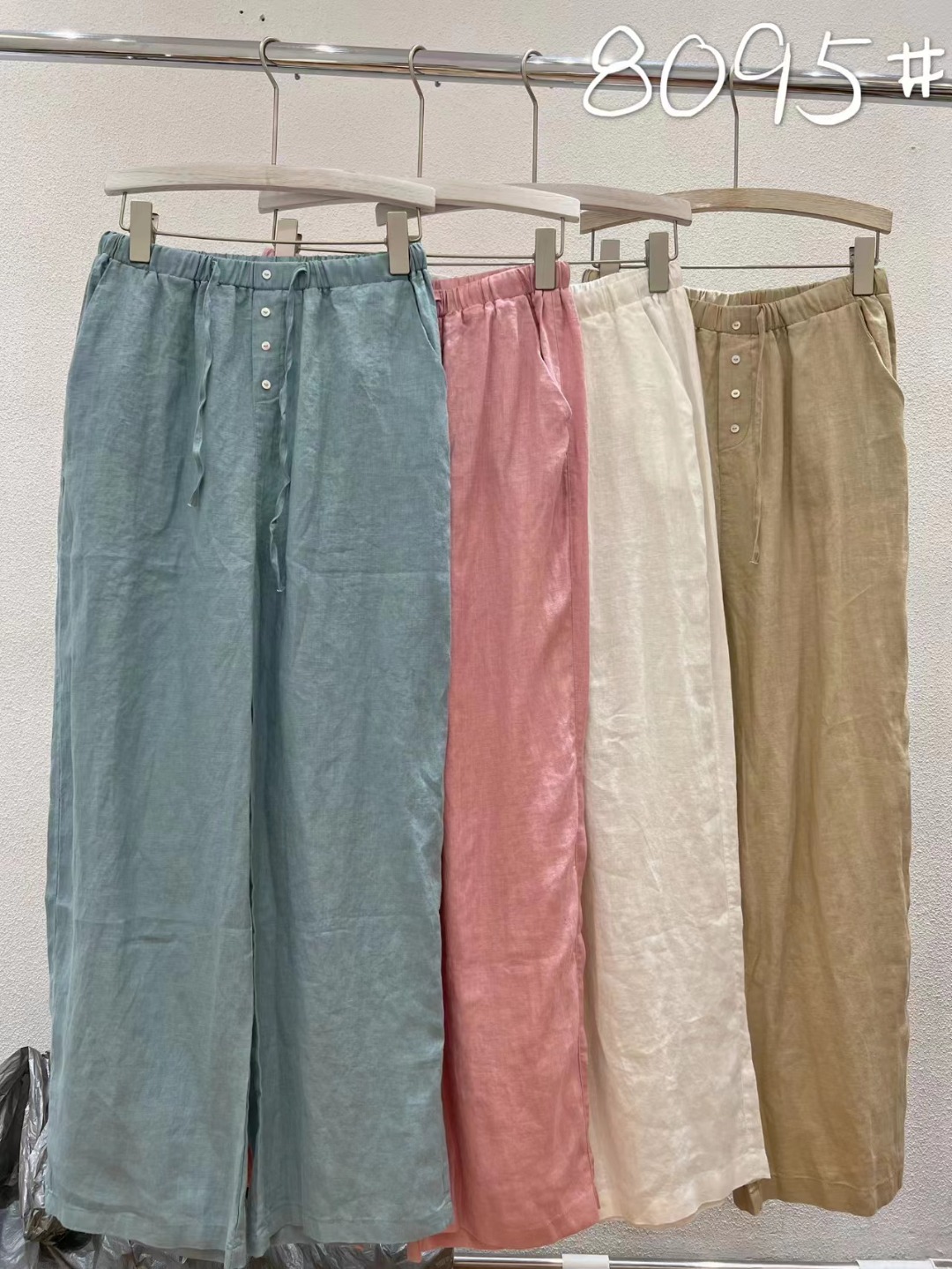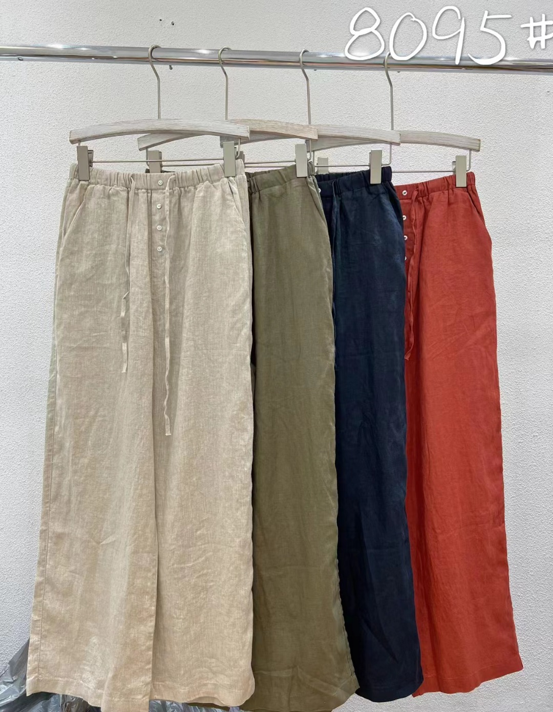 8095 # 图片色 M L 新款时髦百搭松紧腰直筒裤 亚麻抽绳阔腿长裤休闲显瘦 实物颜色超好看