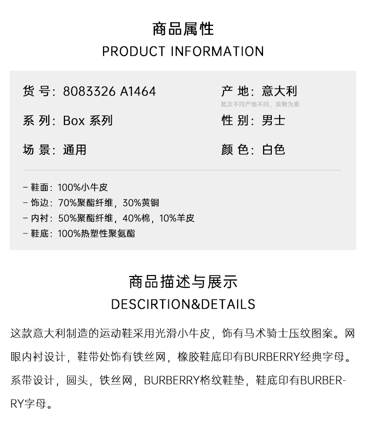 【一】BURBERRY 巴宝莉 男士马术骑士徽标压花皮革 Box 休闲运动鞋 白色 8083326 A1464