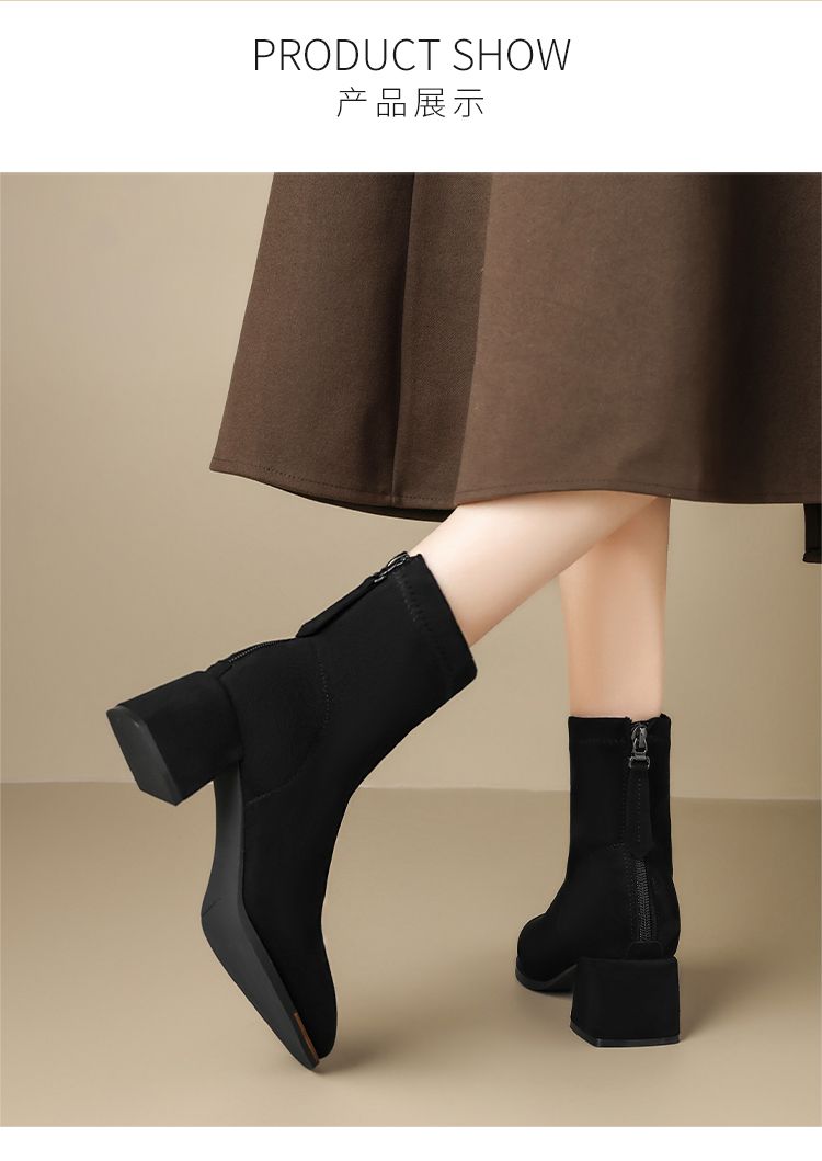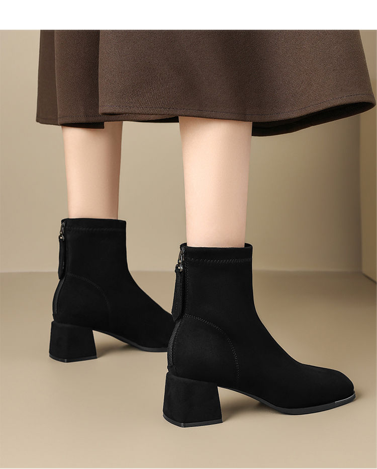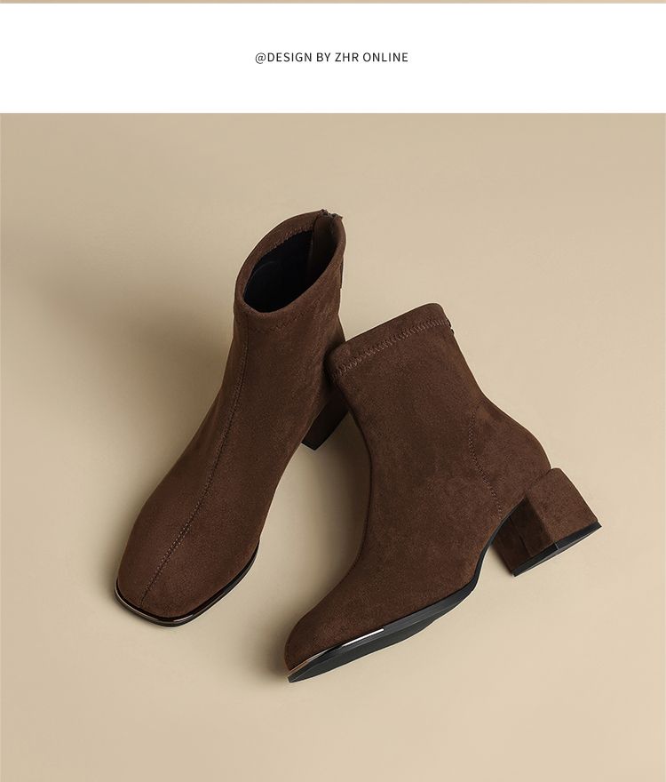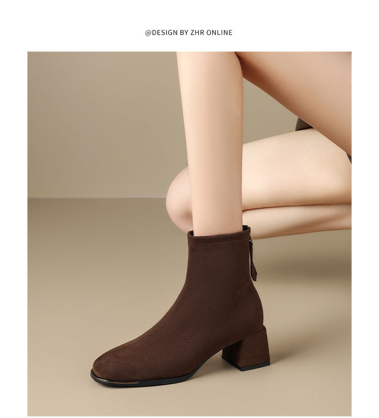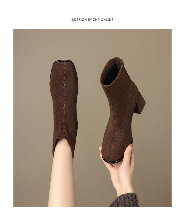 ZHR则则百搭绒面短靴女2024新款方头时装靴粗跟美拉德瘦瘦靴女靴