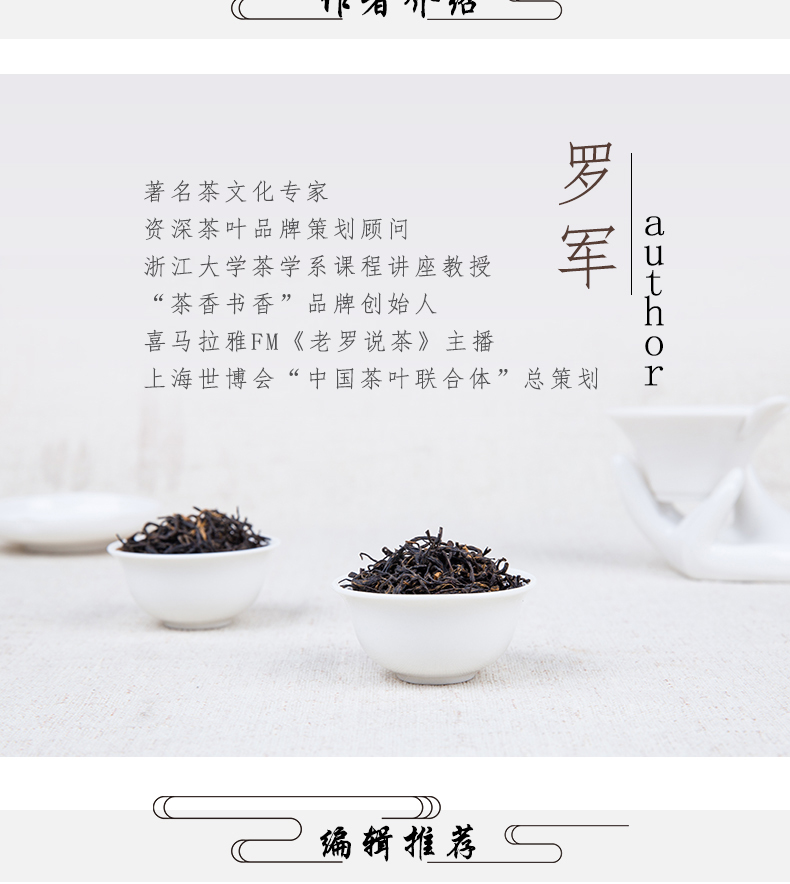 罗军:著名茶文化专家资深茶叶品牌策划顾问浙江大学茶学系课程讲座教授“茶香书香”品牌创始人喜马拉雅FM《老罗说茶》主播上海世博会“中国茶叶联合体”总策划