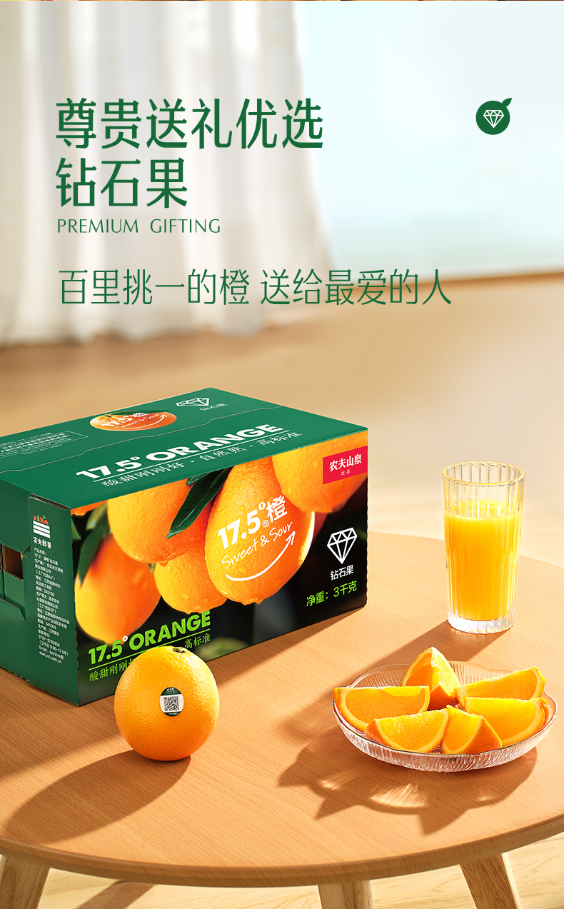 农夫山泉17.5°脐橙铂金果/钻石果鲜橙酸甜可口25年鲜采水果礼盒6斤/10斤