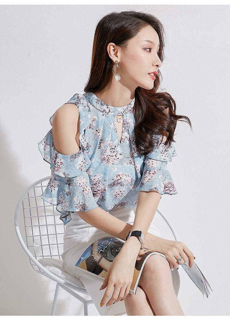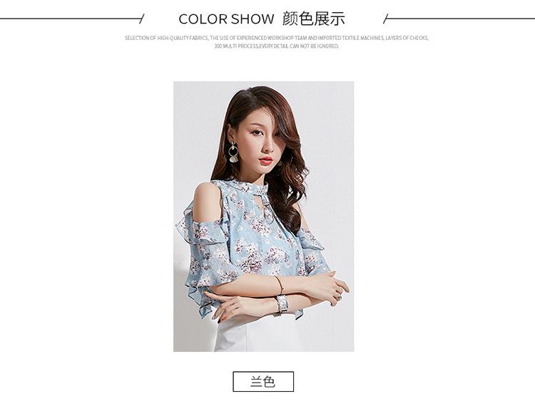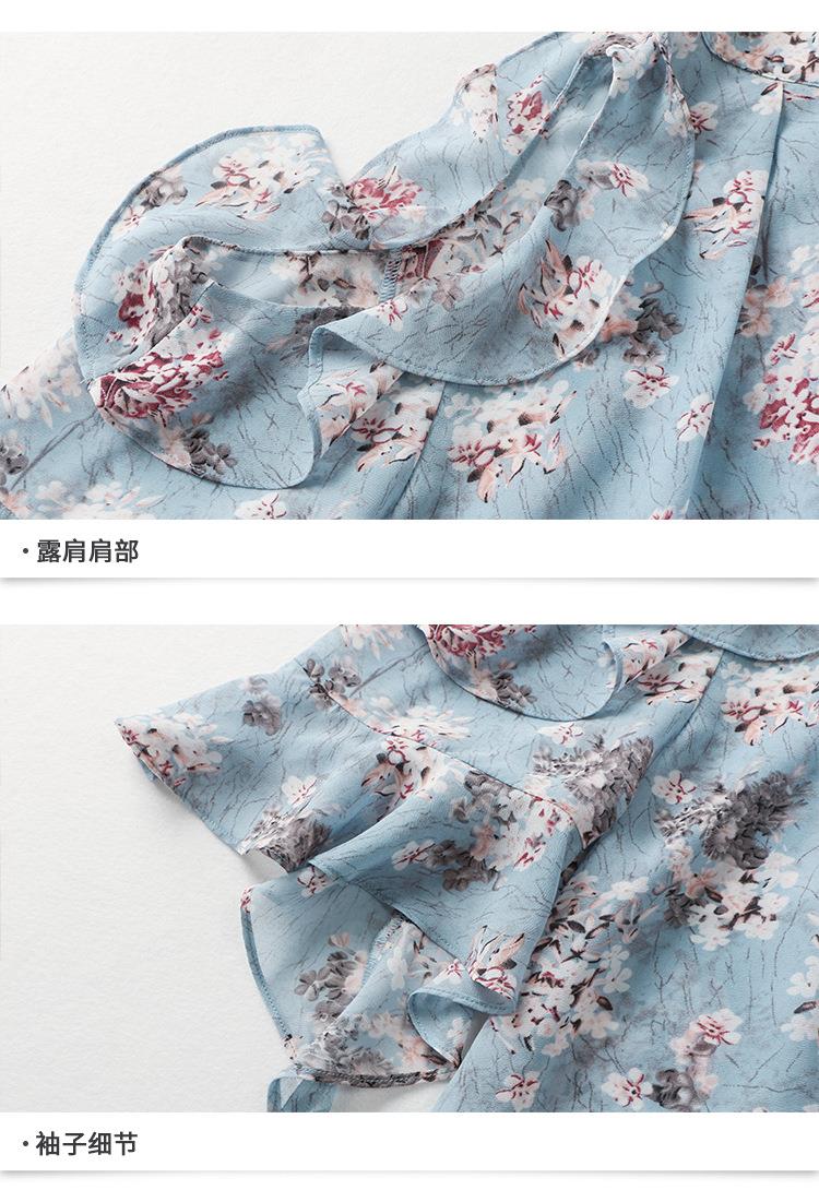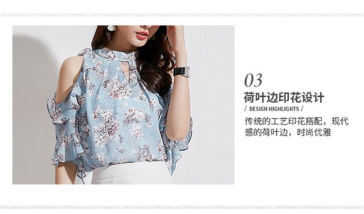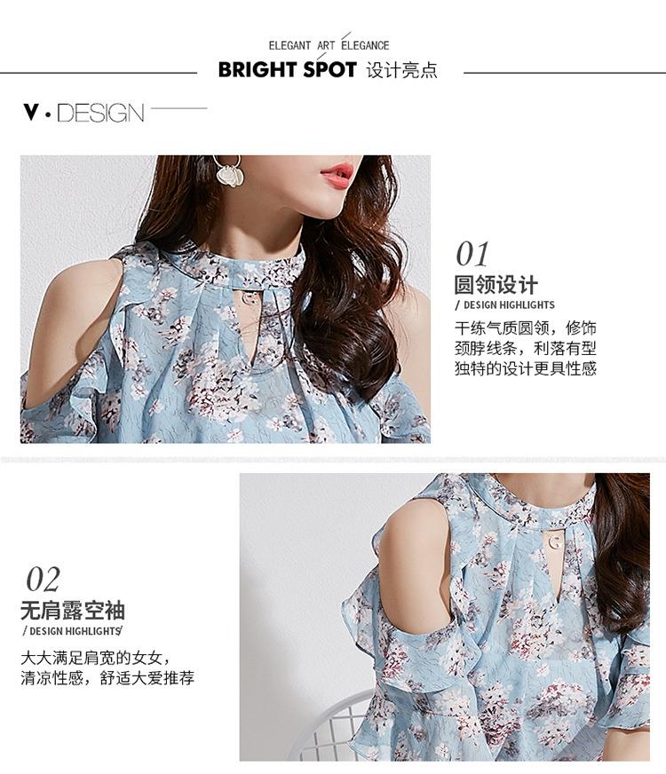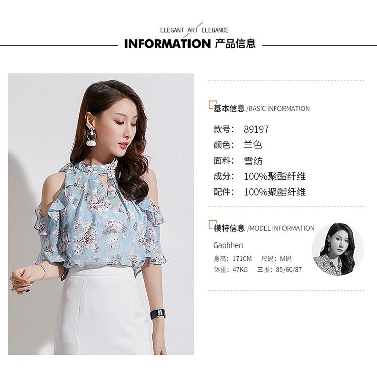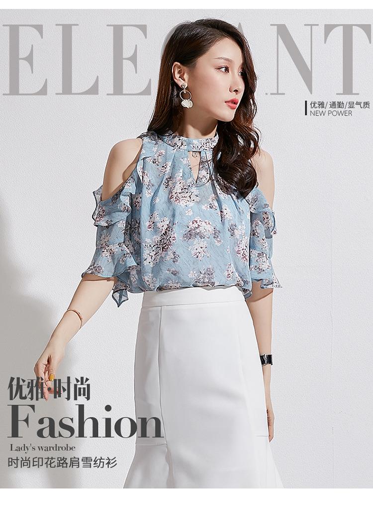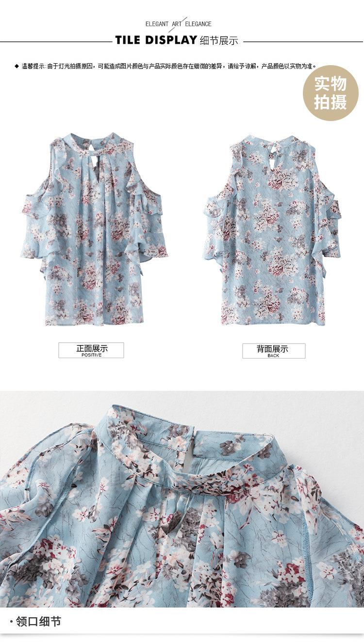 百姿 新款蓝色套头露肩雪纺衫印花衬衫荷叶边女装上衣