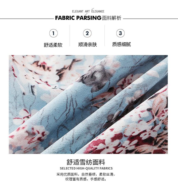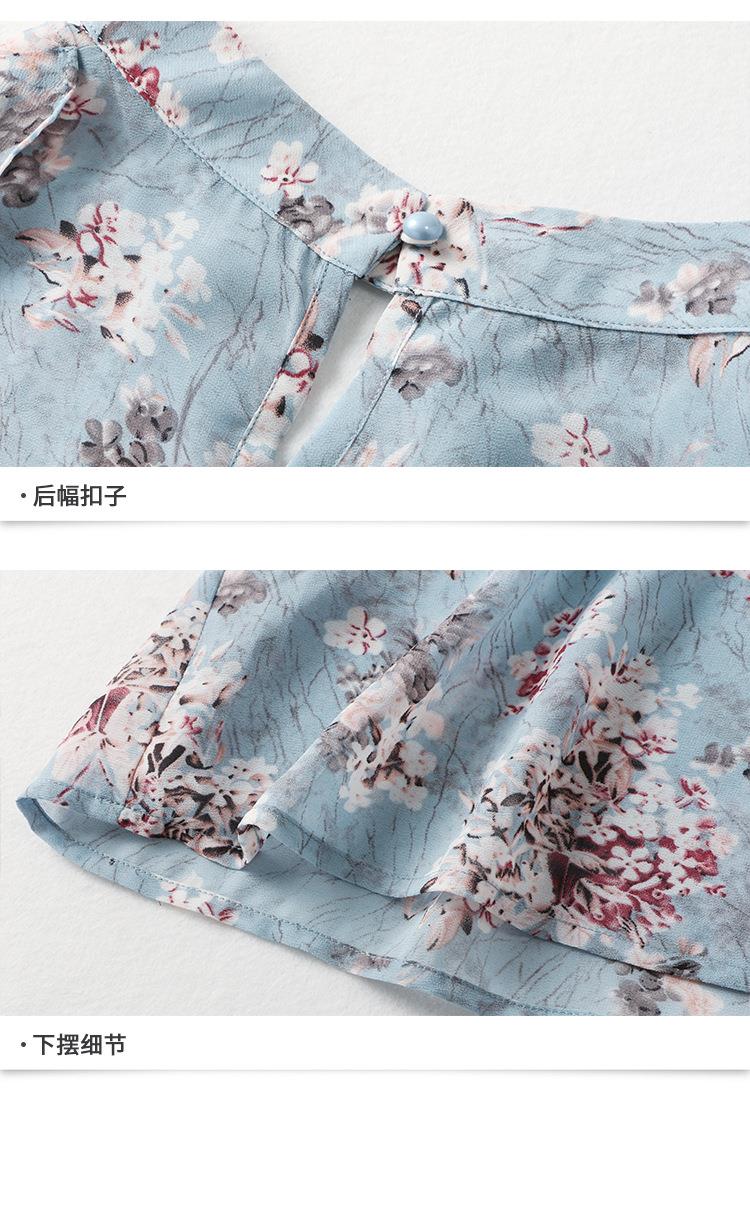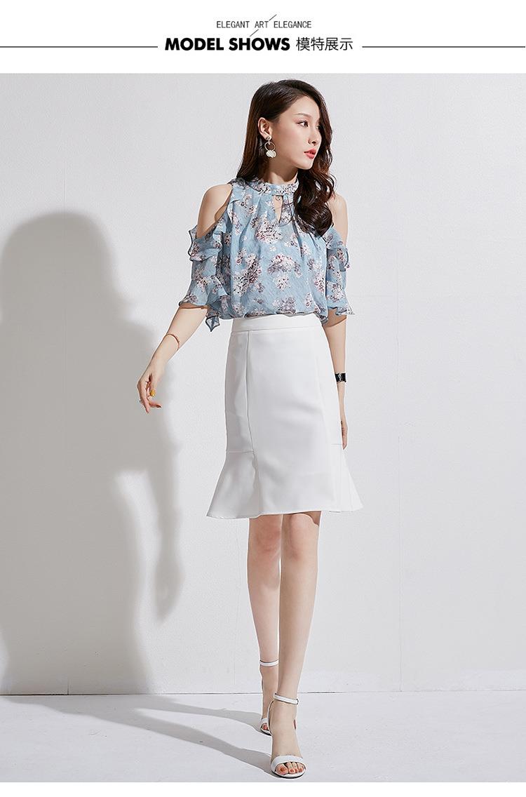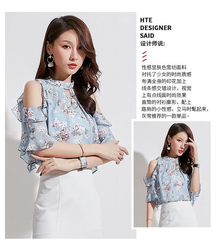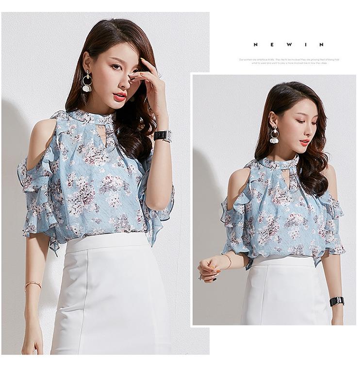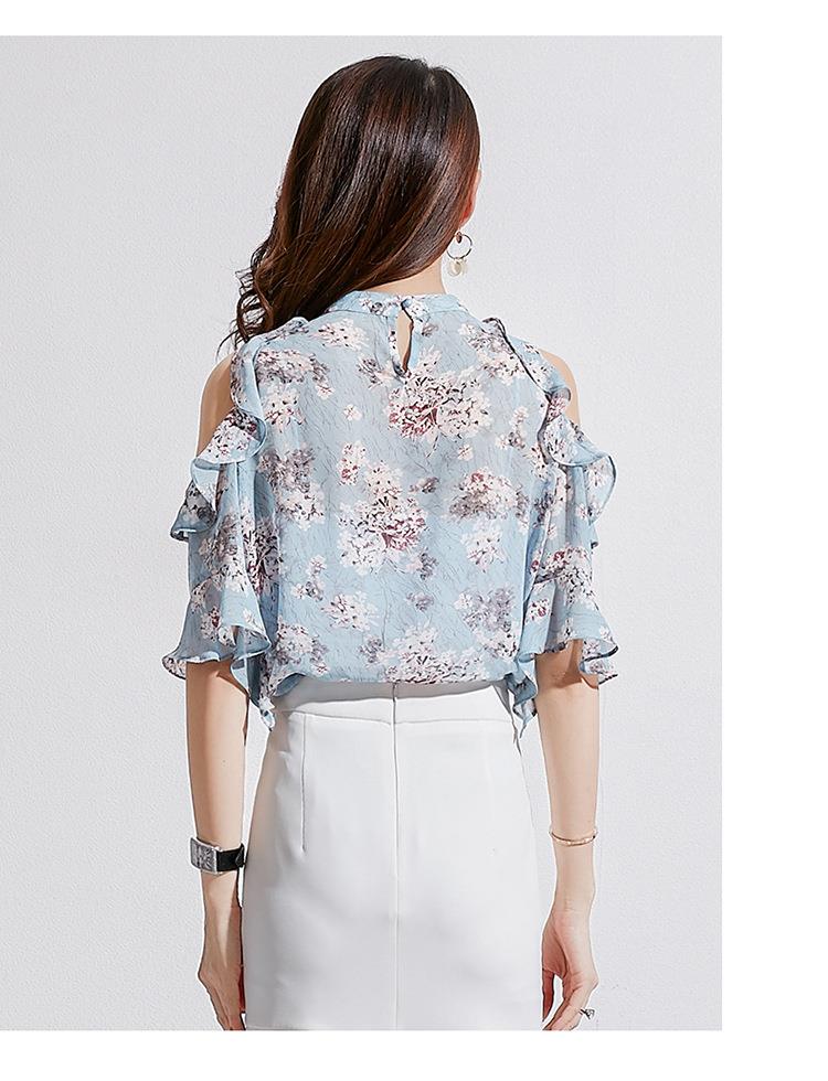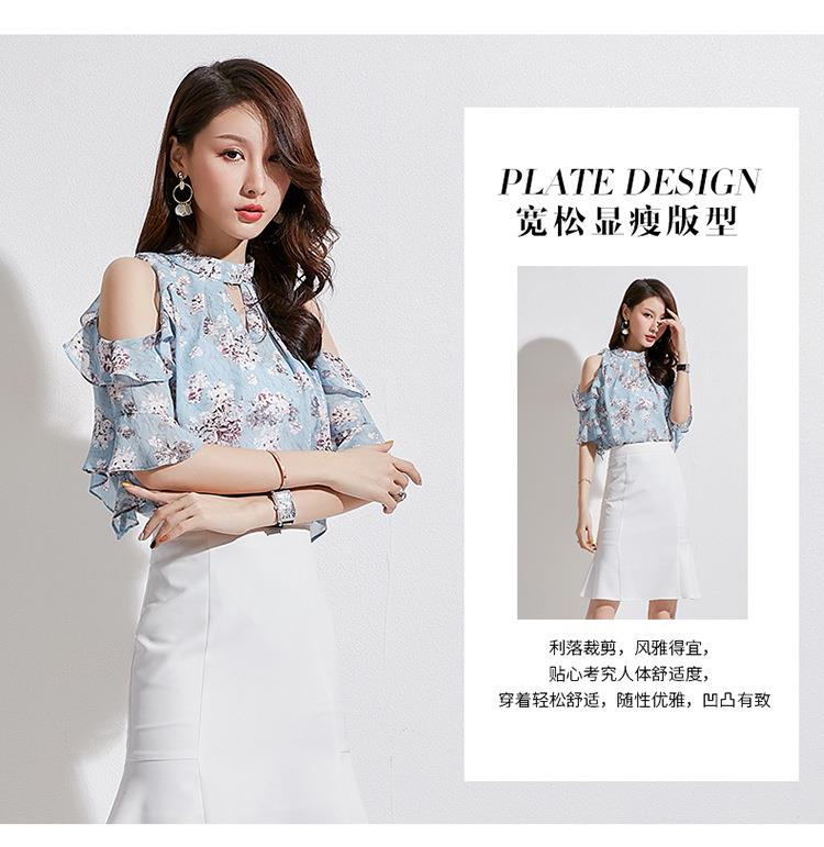 百姿 新款蓝色套头露肩雪纺衫印花衬衫荷叶边女装上衣