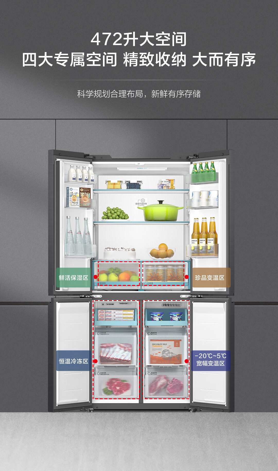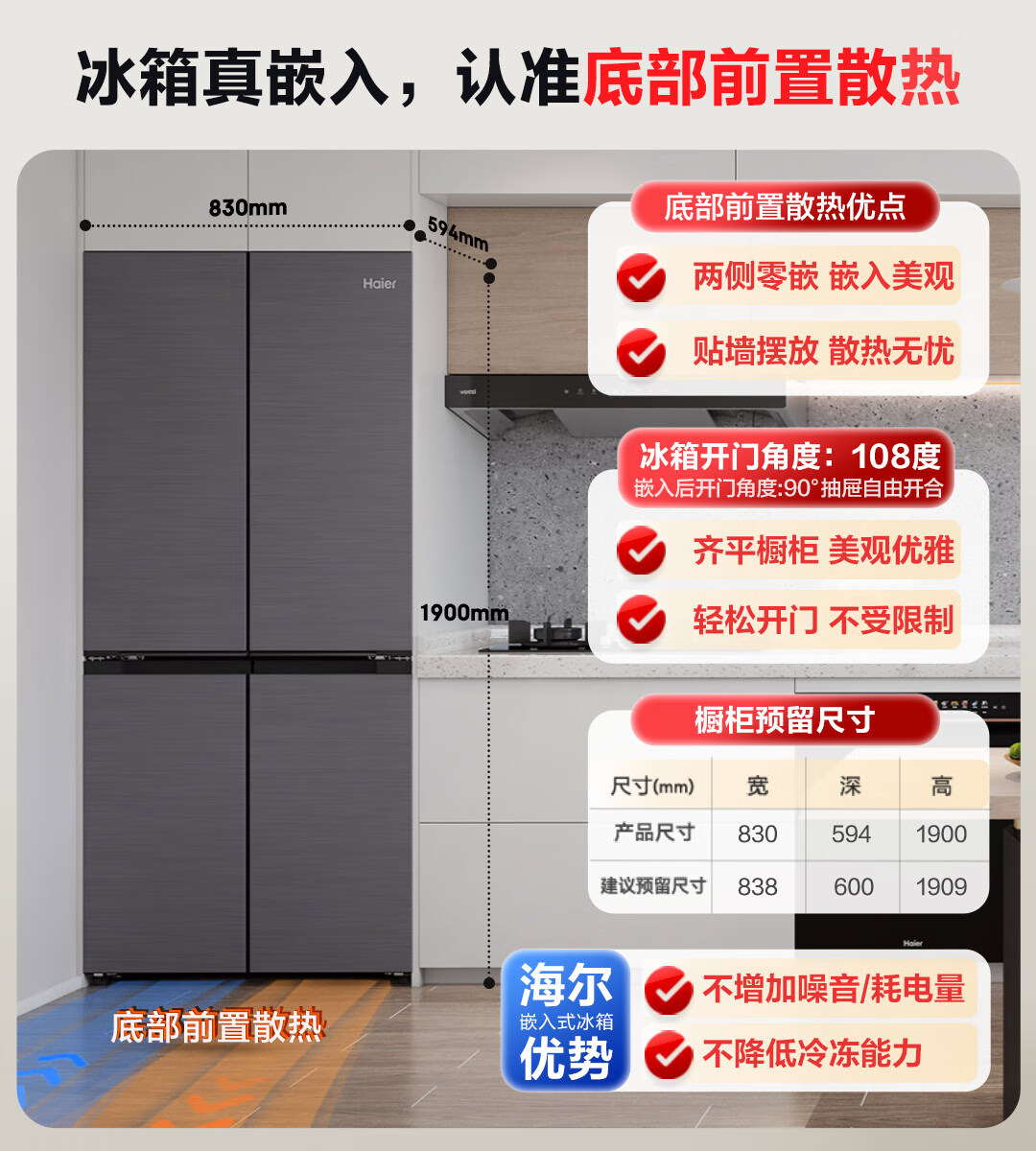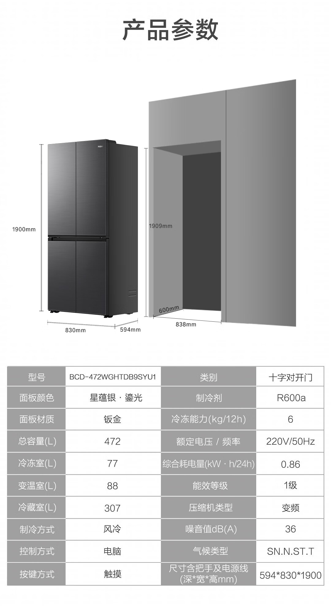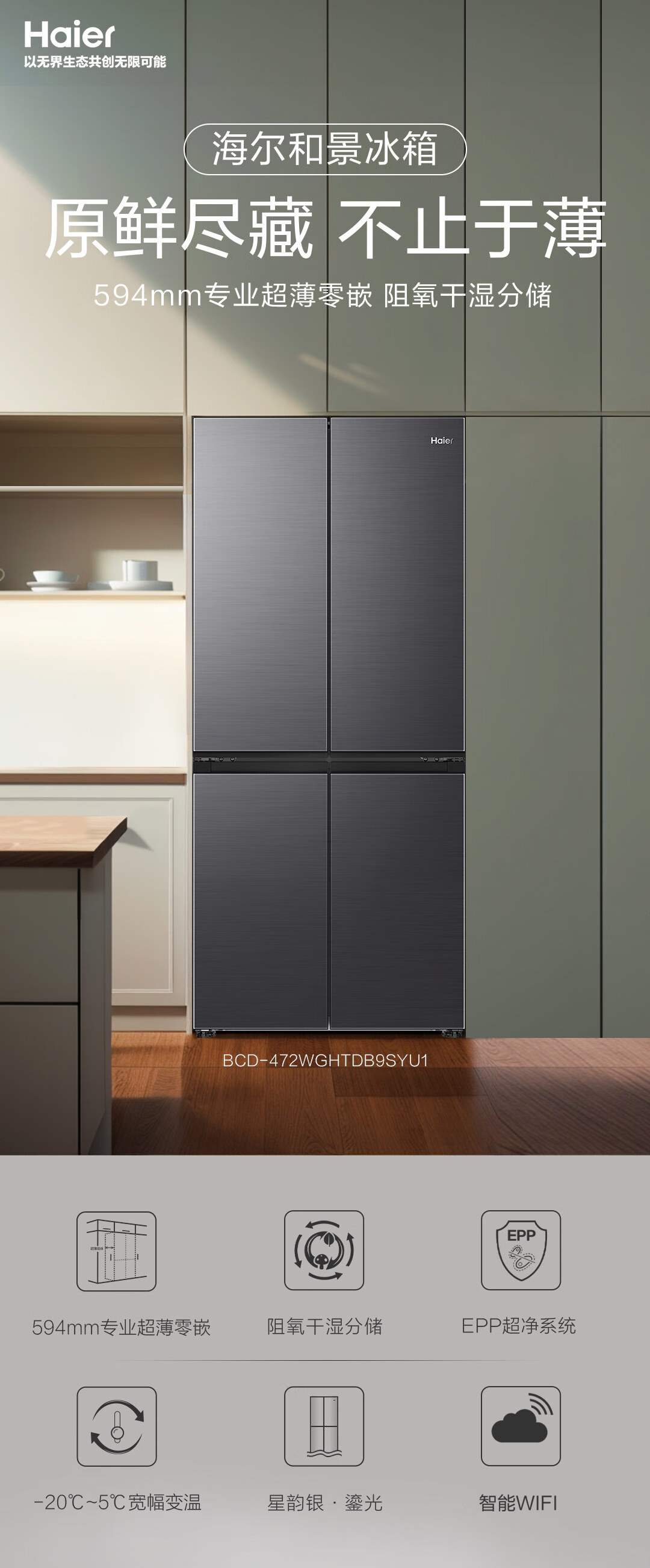 海尔(Haier)472升和景594mm专业超薄零嵌十字T型四开门家用电冰箱无霜除菌大容量嵌入式BCD-472WGHTDB9SYU1