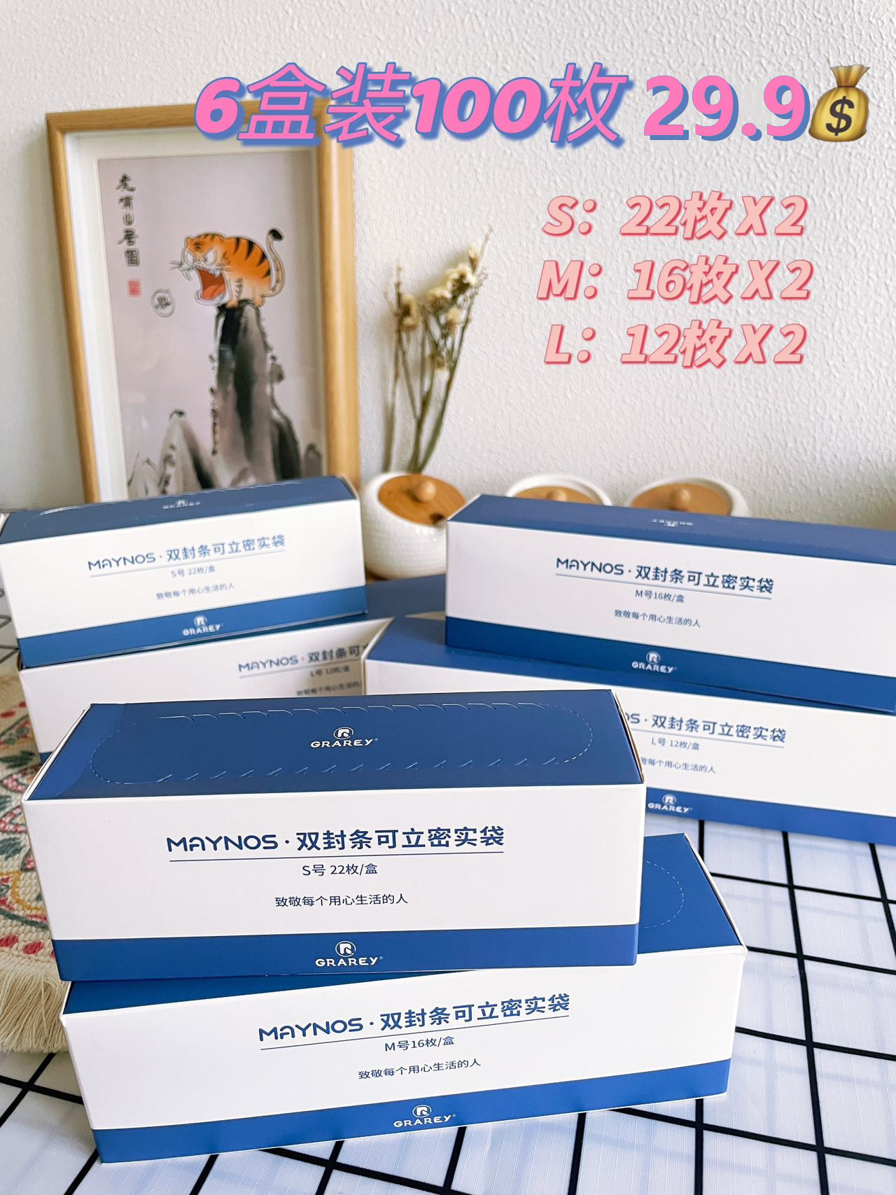 100枚=小号22枚/盒*2+中号16枚/盒*2+大号12枚/盒*2