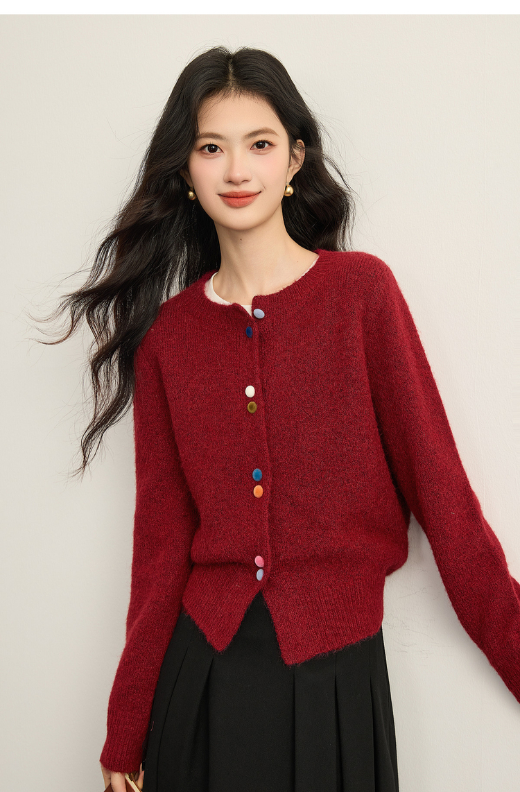 【周四狂欢价】熙世界含羊毛红色厚毛衣女新年穿搭2025秋冬复古长袖圆领针织开衫