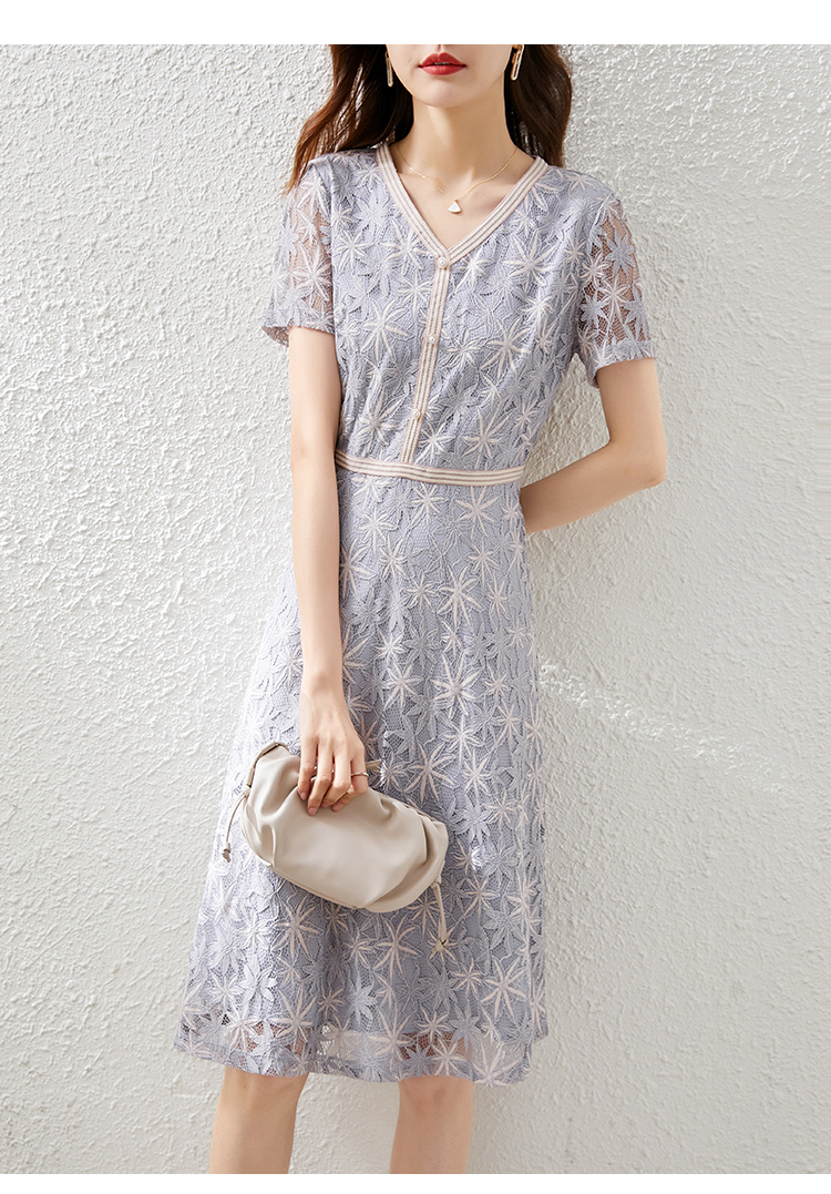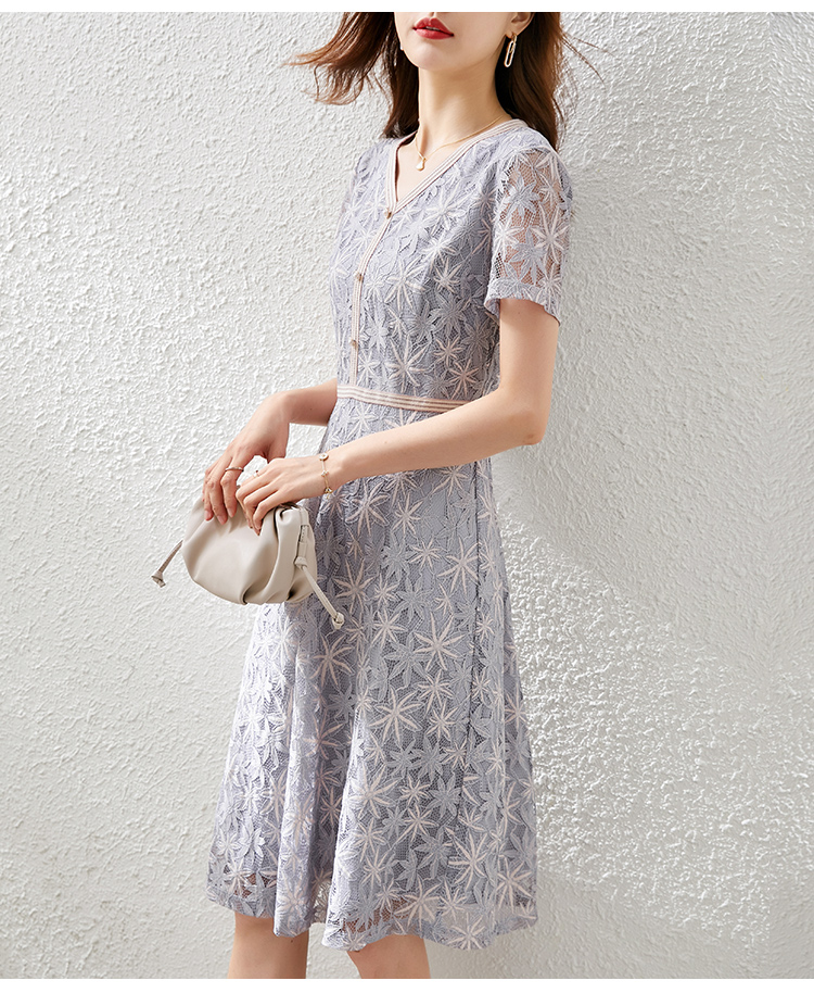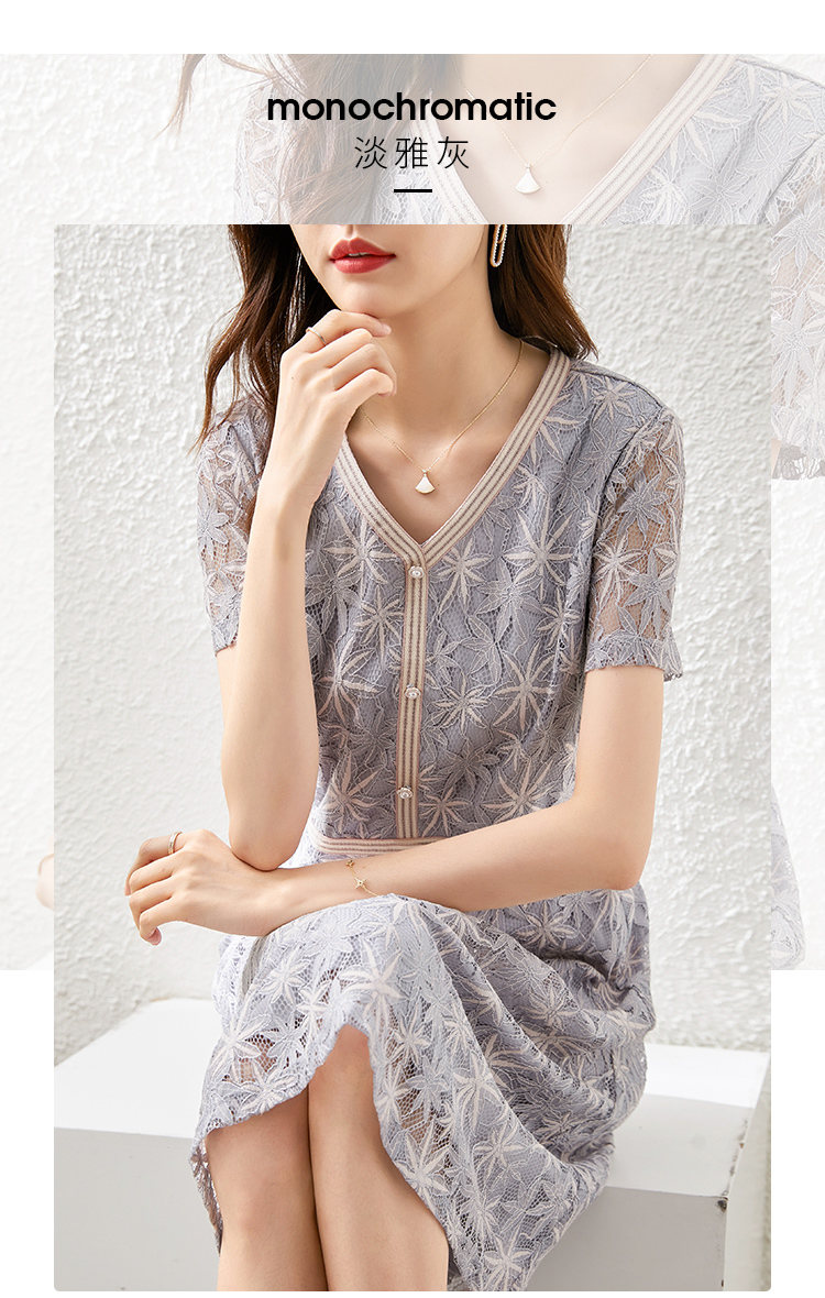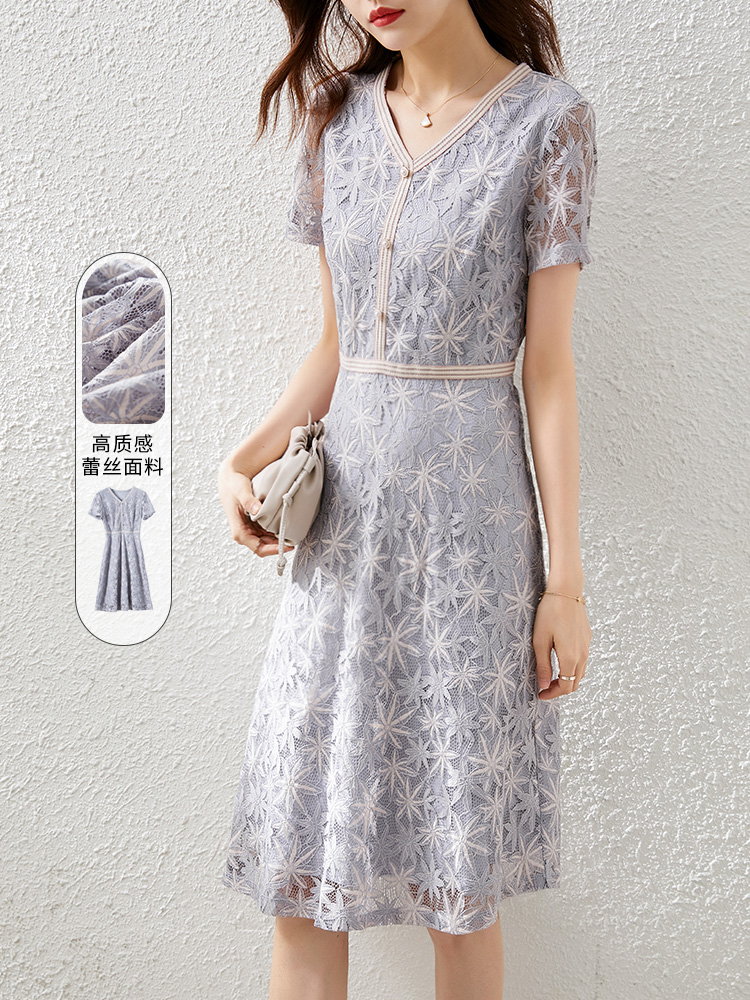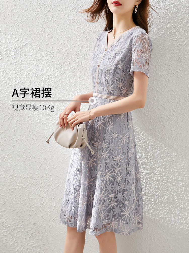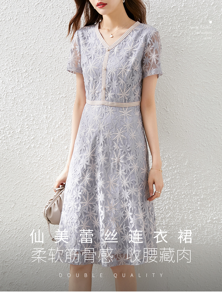 【熙世界】夏装新款优雅气质蕾丝V领短袖连衣裙子女收腰显瘦藏肉