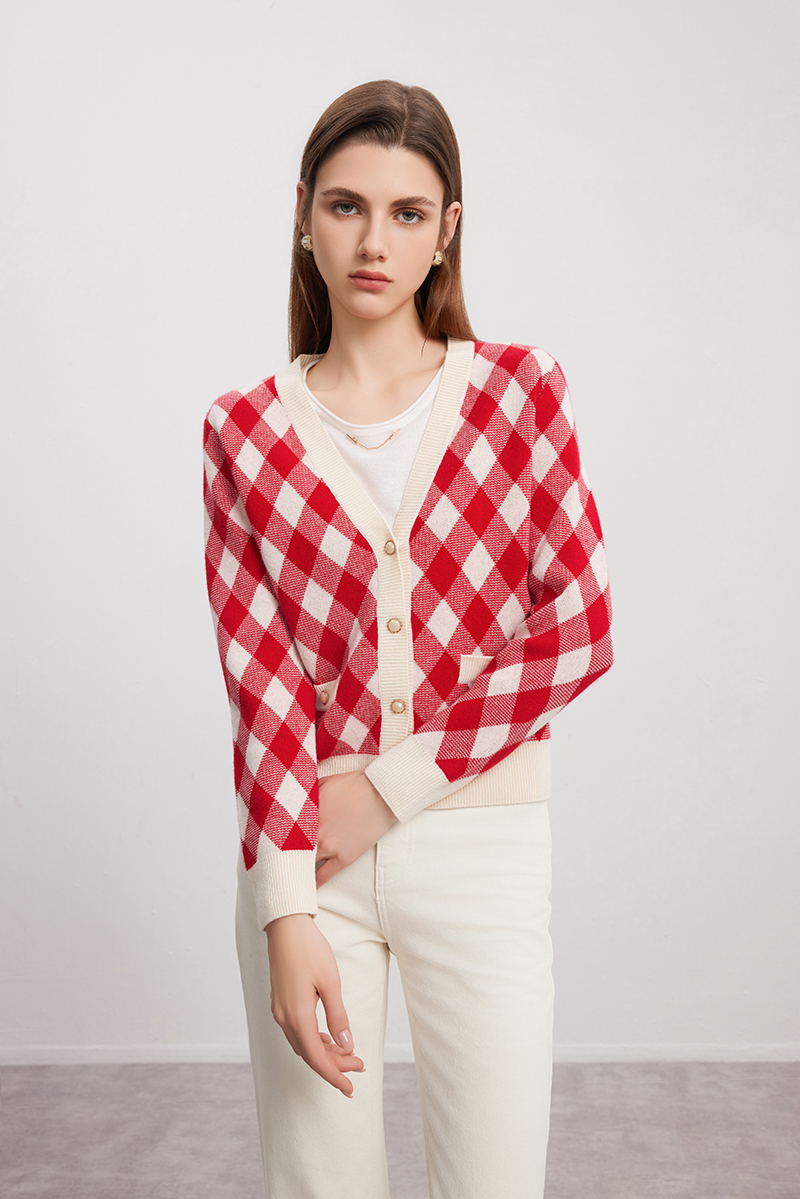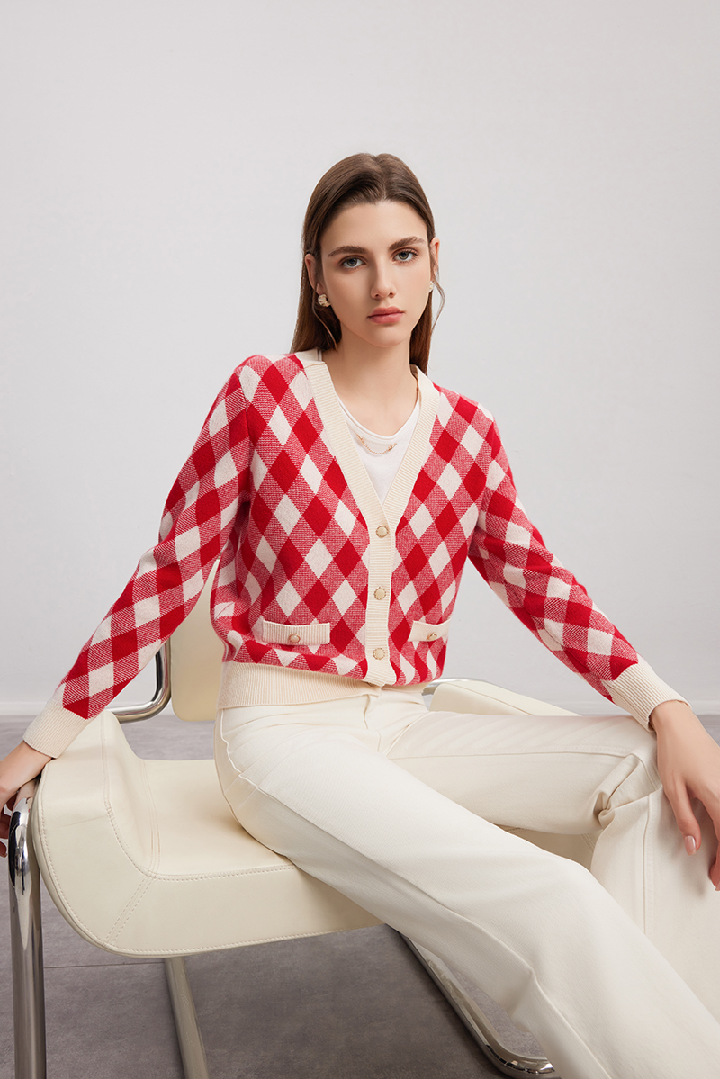 【菱形格纹V领开衫】羊绒世家秋冬新品100%山羊绒衫红白撞色针织外套