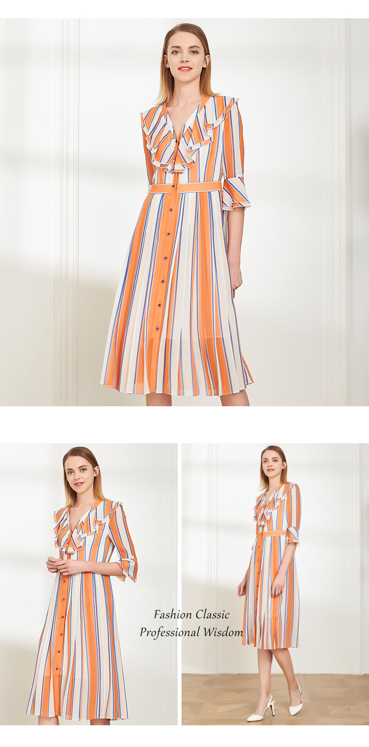 QG8A5斯尔丽夏季新品时尚优雅条纹纽扣修身短袖中长款连衣裙