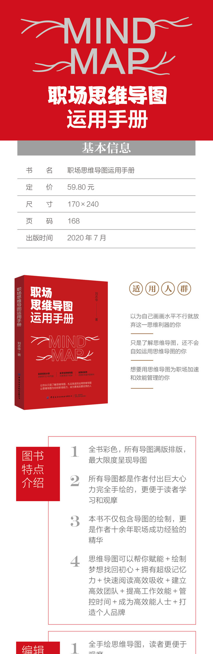 思维导图如今风靡职场,一张合格、有效的思维导图可以为职场助力,实现能力的跃升和职场的晋升。有着十几年培训经验,且是英国官方思维导图授权注册讲师的刘志华老师,用几十幅花费了巨大心力、完全手绘的导图,在《职场思维导图运用手册》向读者细致分享了怎样走进思维导图,如何启动大脑的创造力画出一幅思维导图。运用思维导图,不仅可以做到高效阅读以吸收更多信息,提高学习效能,让终身学习成为可能,还能建立高效团队,实现职场晋升,打造个人品牌,从而成为高效能人士,成就自己的梦想。