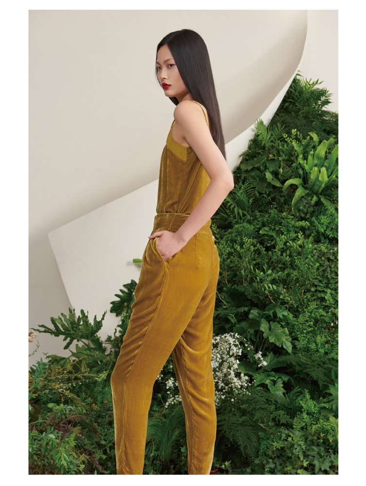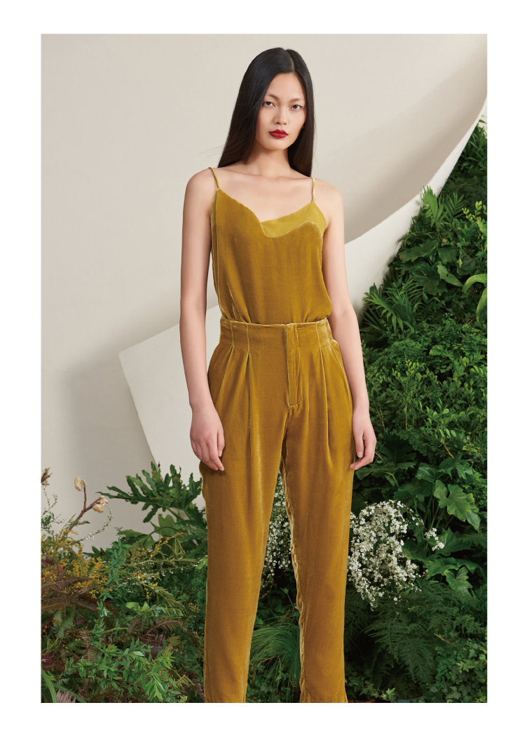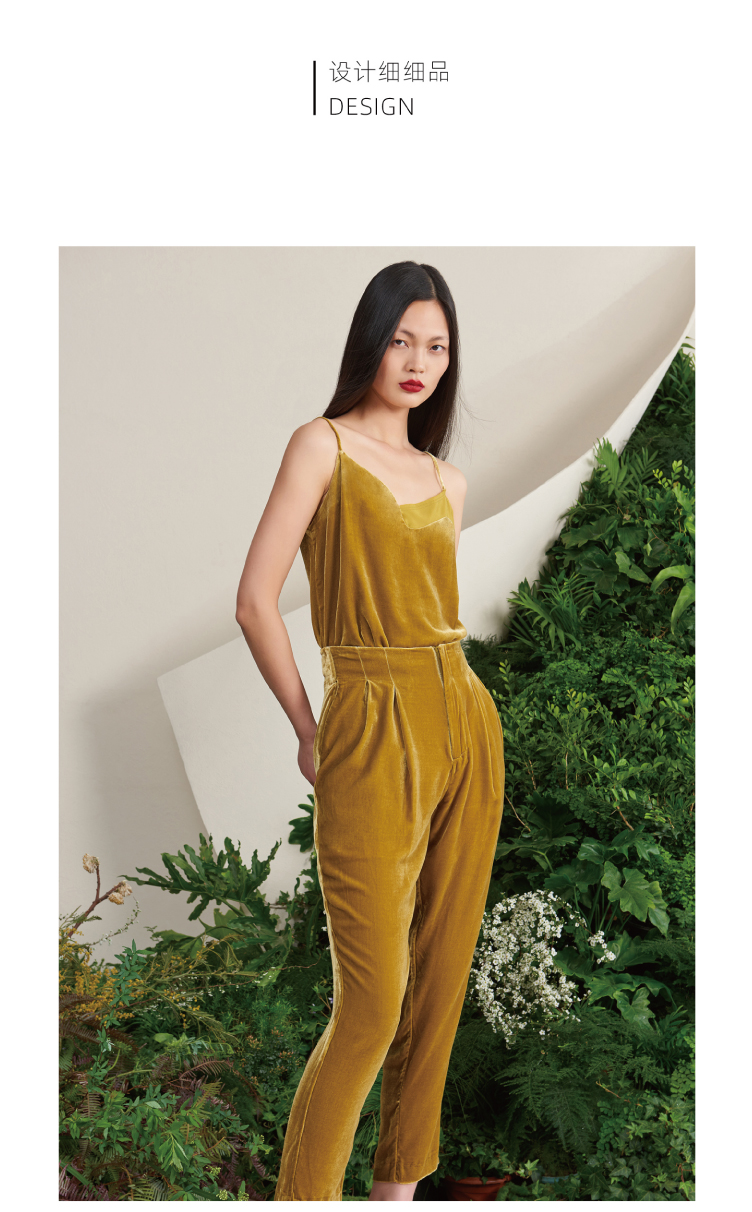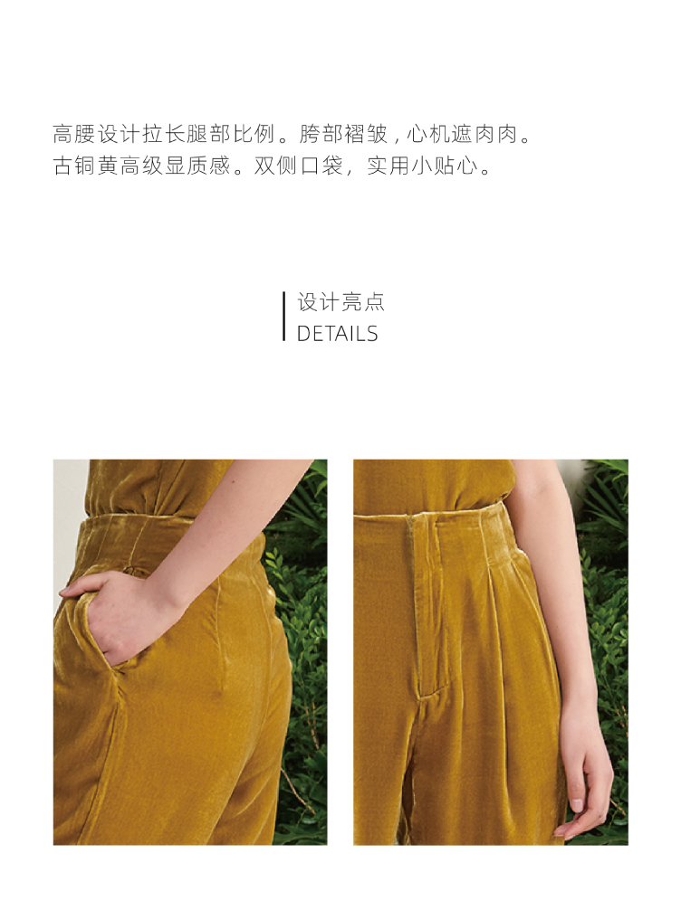 【胡枝子】古铜黄真丝丝绒高腰烟管长裤/00094A