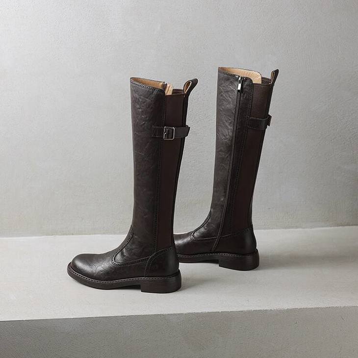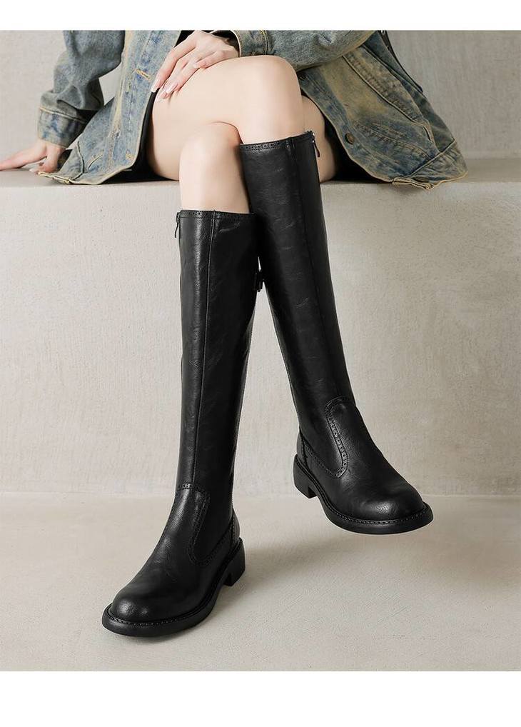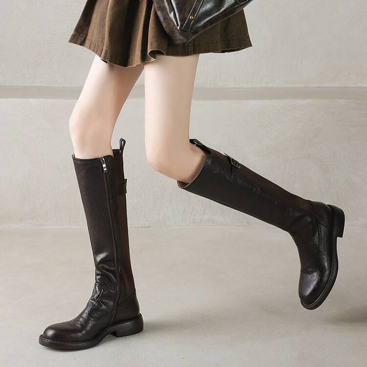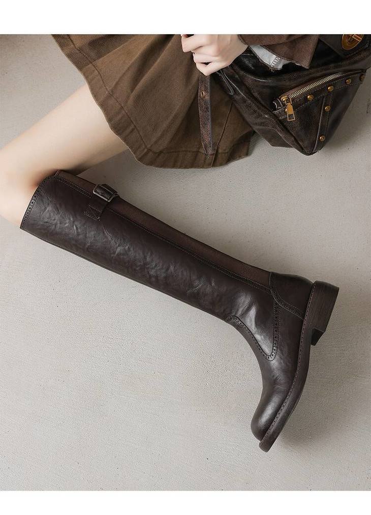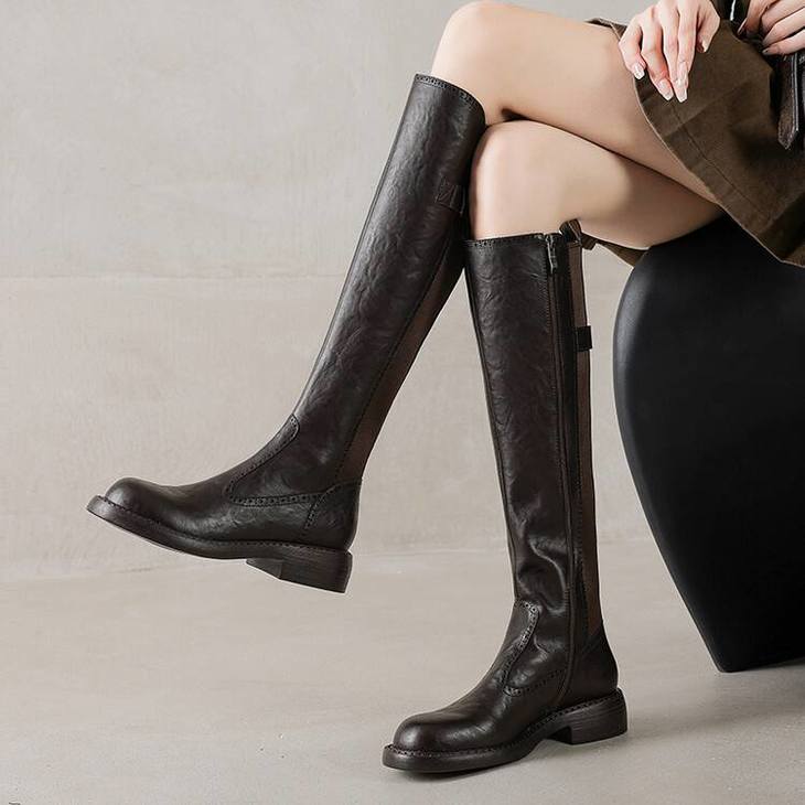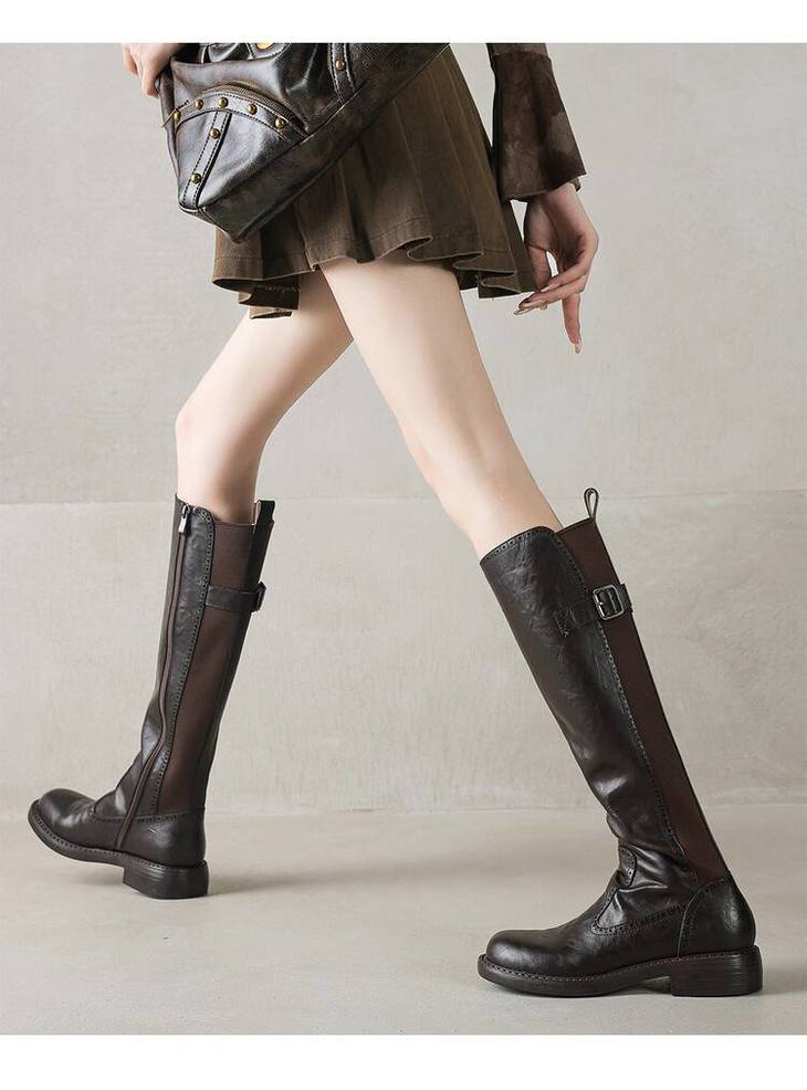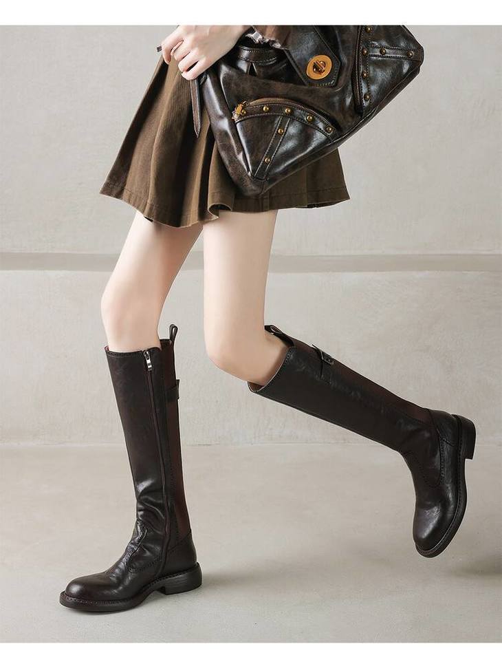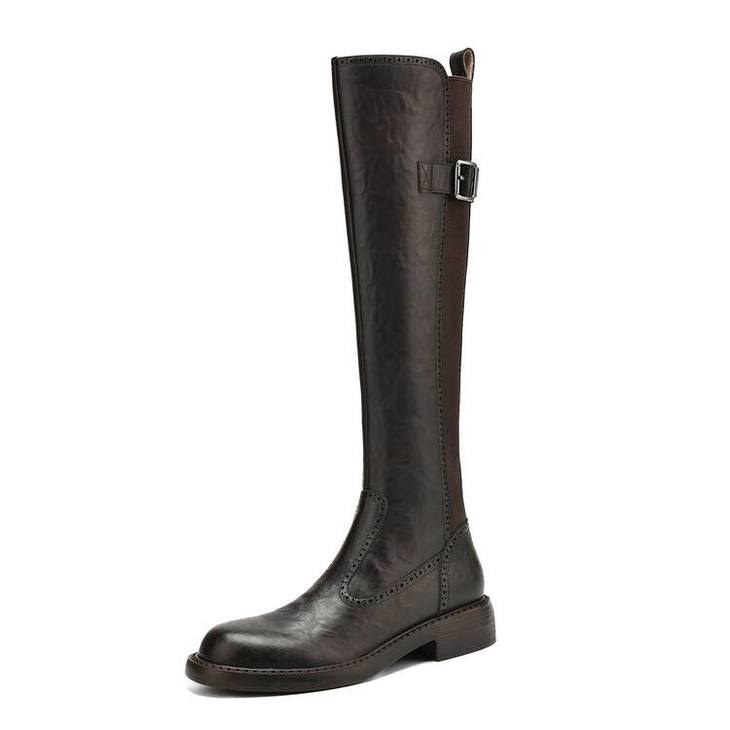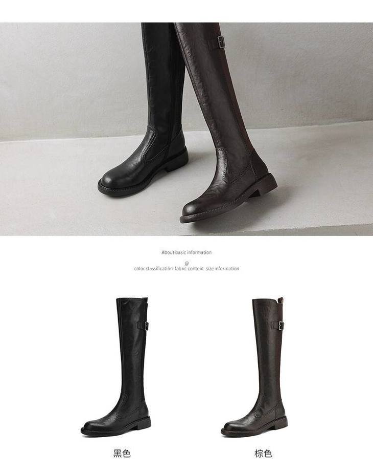 【预售7天】里外全皮棕色新品骑士靴秋冬圆头粗跟侧拉链长靴女KYD&KK9566