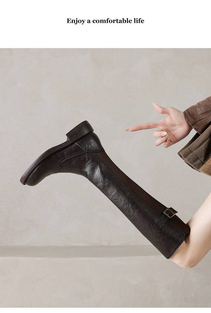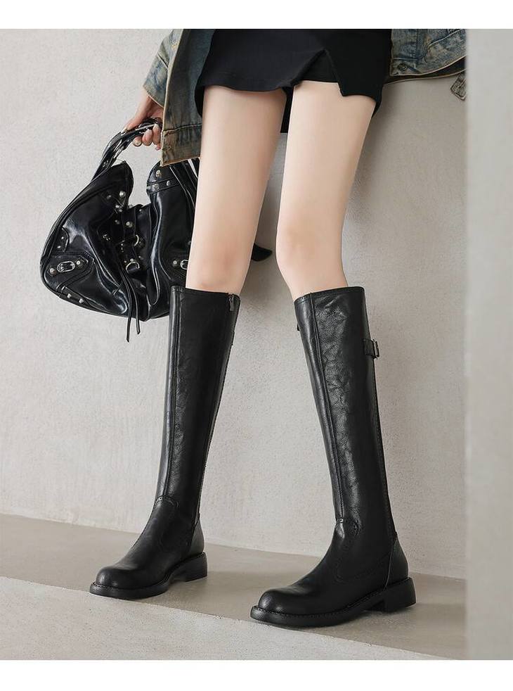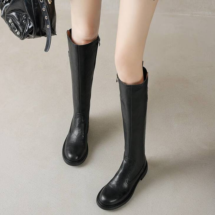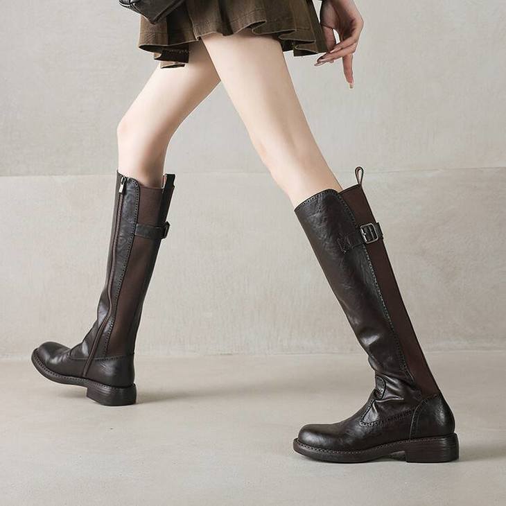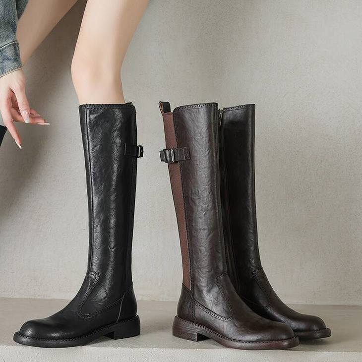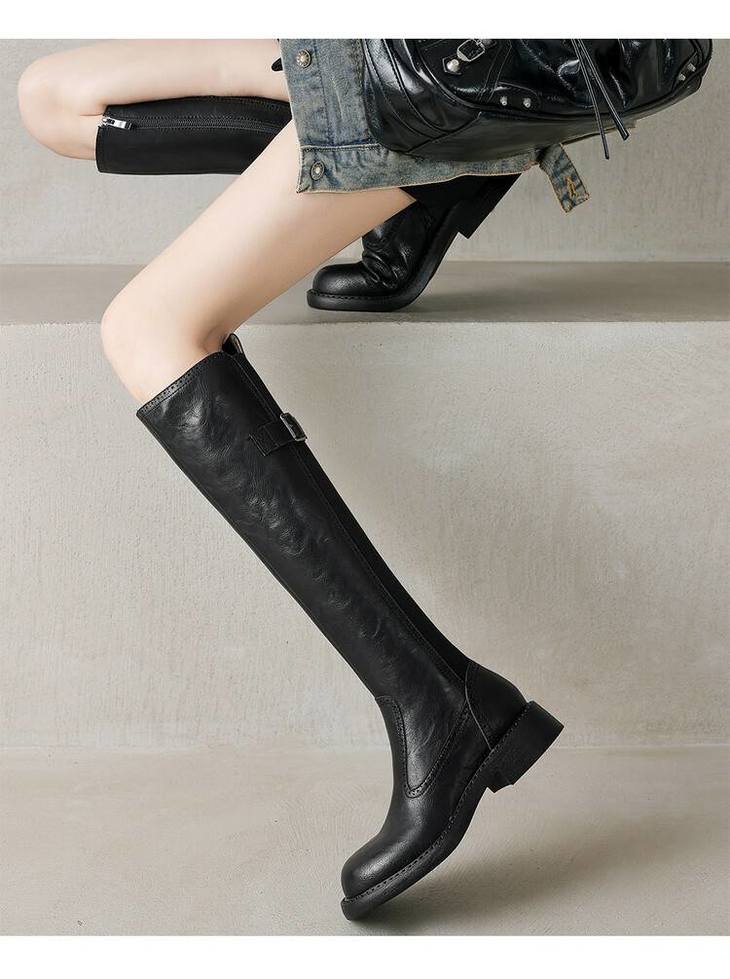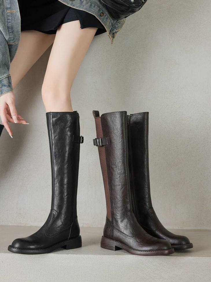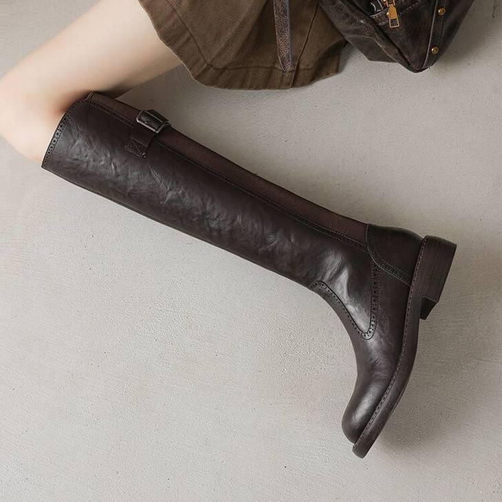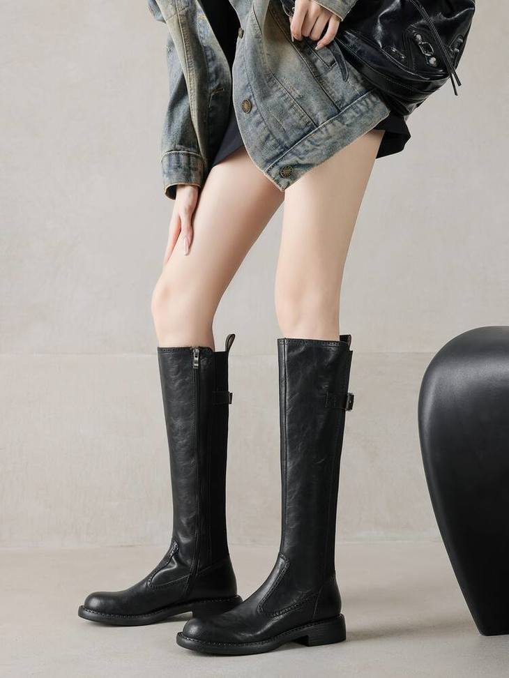 【预售7天】里外全皮棕色新品骑士靴秋冬圆头粗跟侧拉链长靴女KYD&KK9566