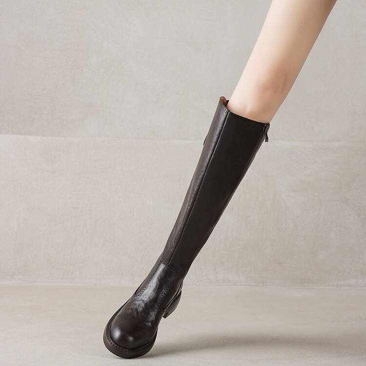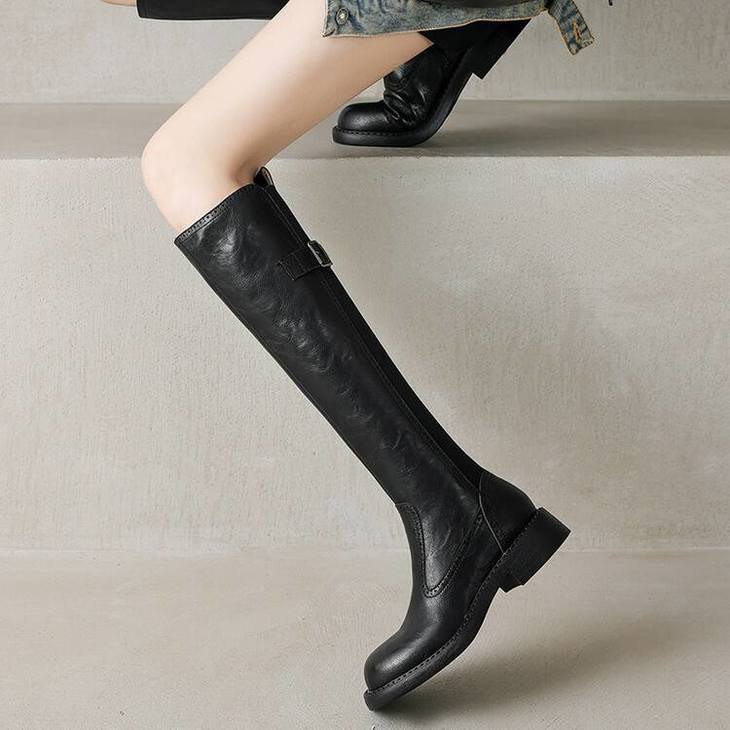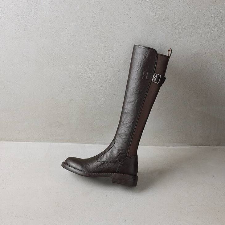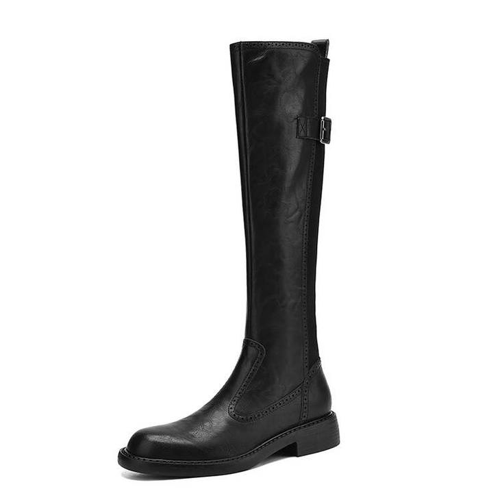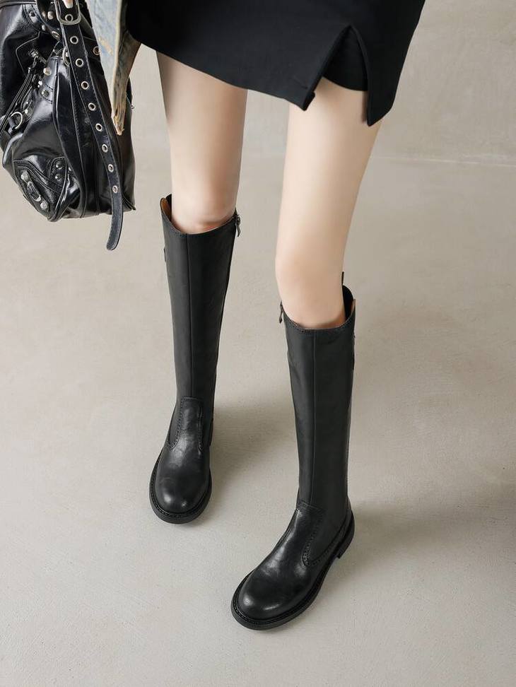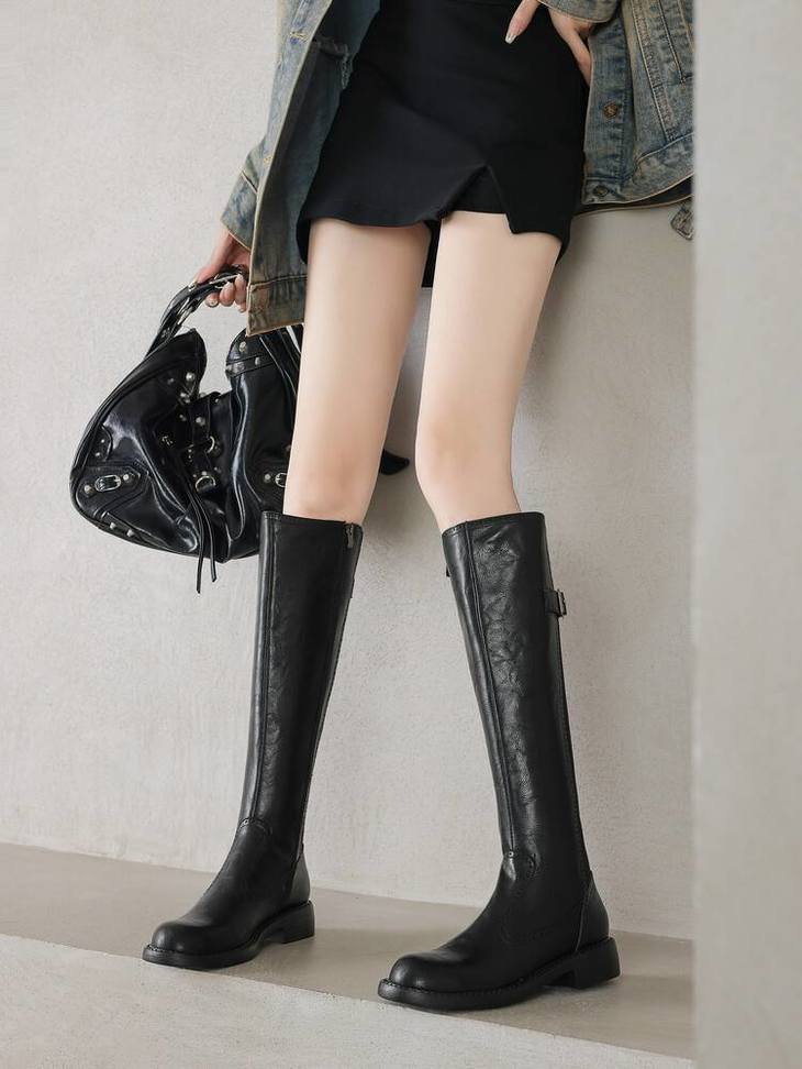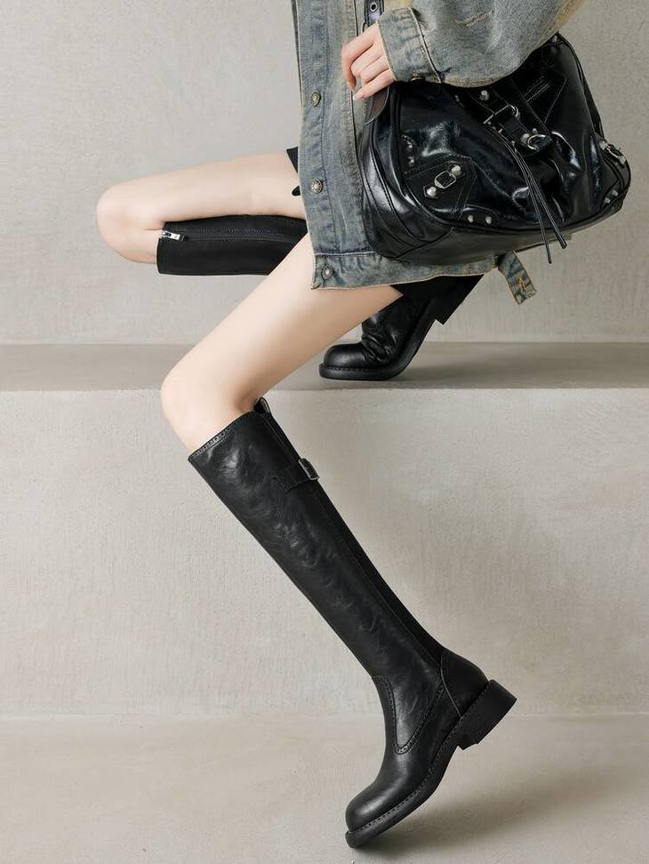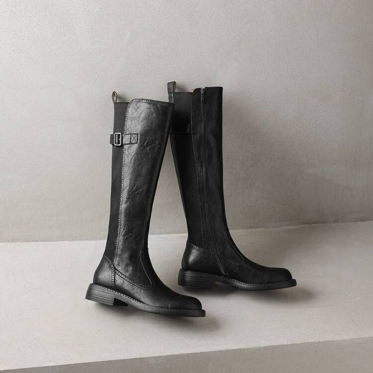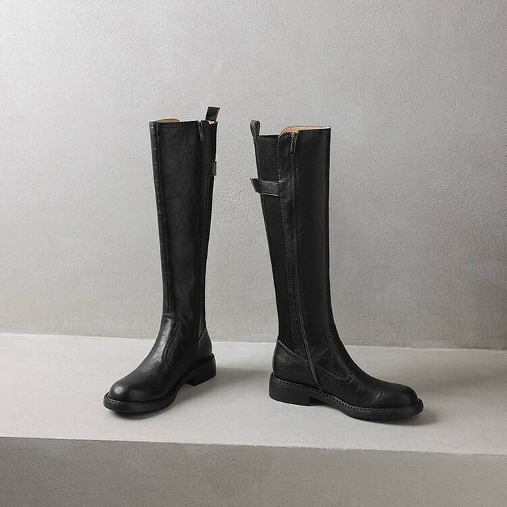 【预售7天】里外全皮棕色新品骑士靴秋冬圆头粗跟侧拉链长靴女KYD&KK9566