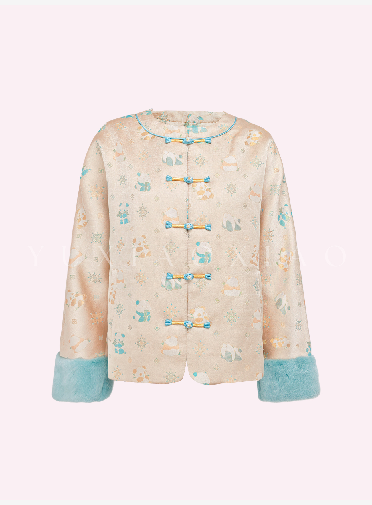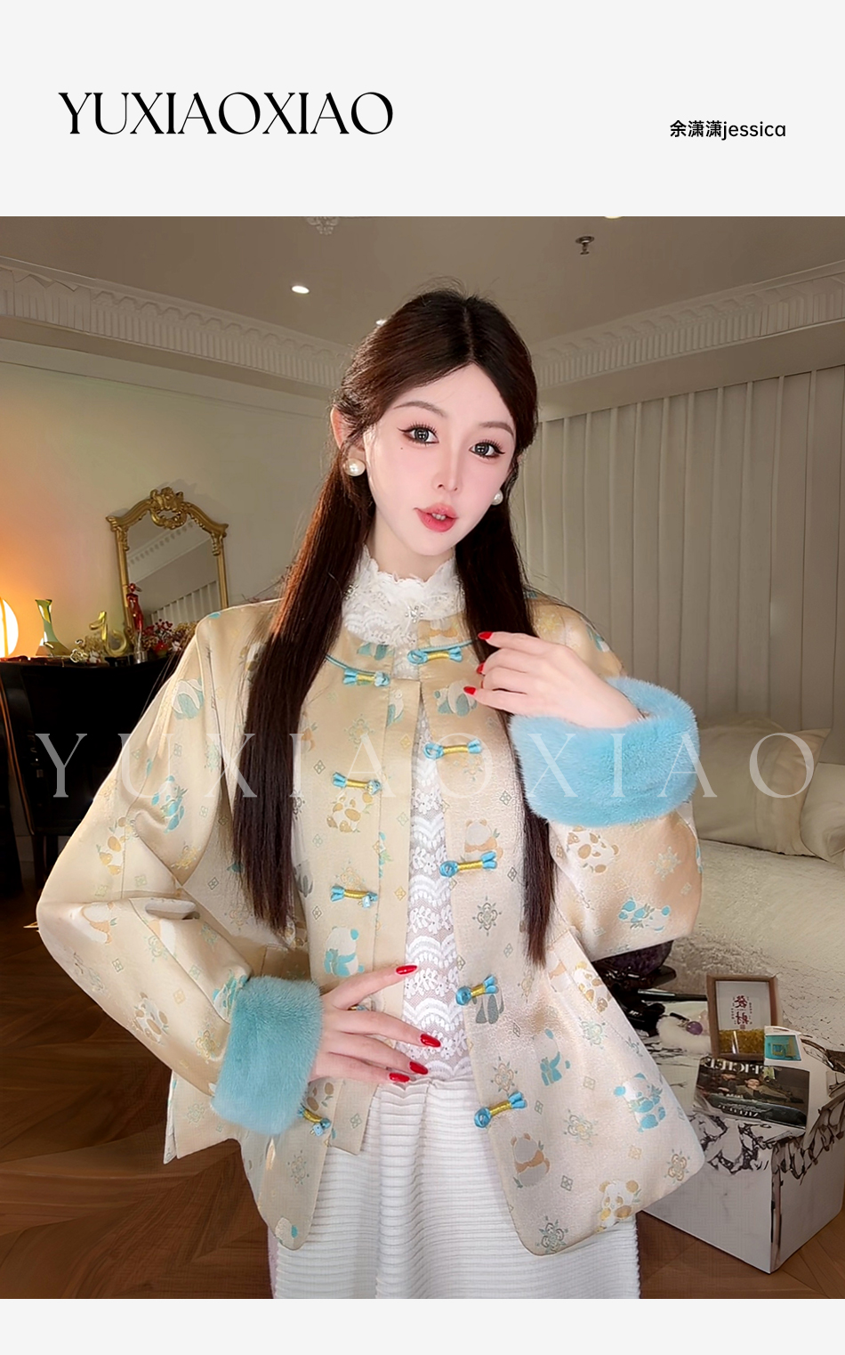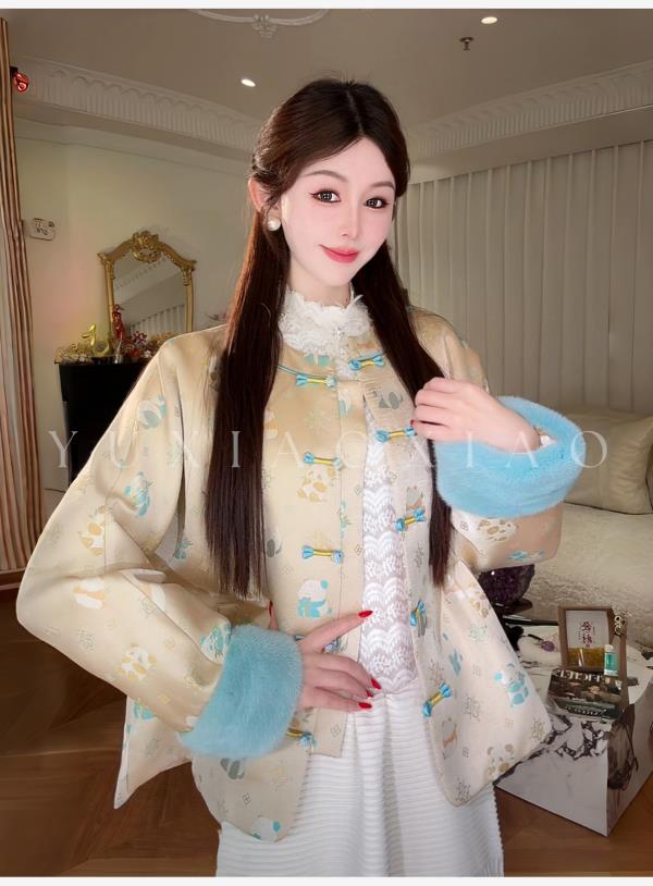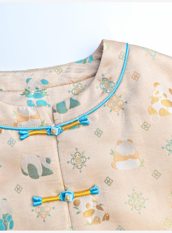 余潇潇【古韵熊猫】桑蚕丝混纺提花撞色水貂袖口盘扣圆领国风外套