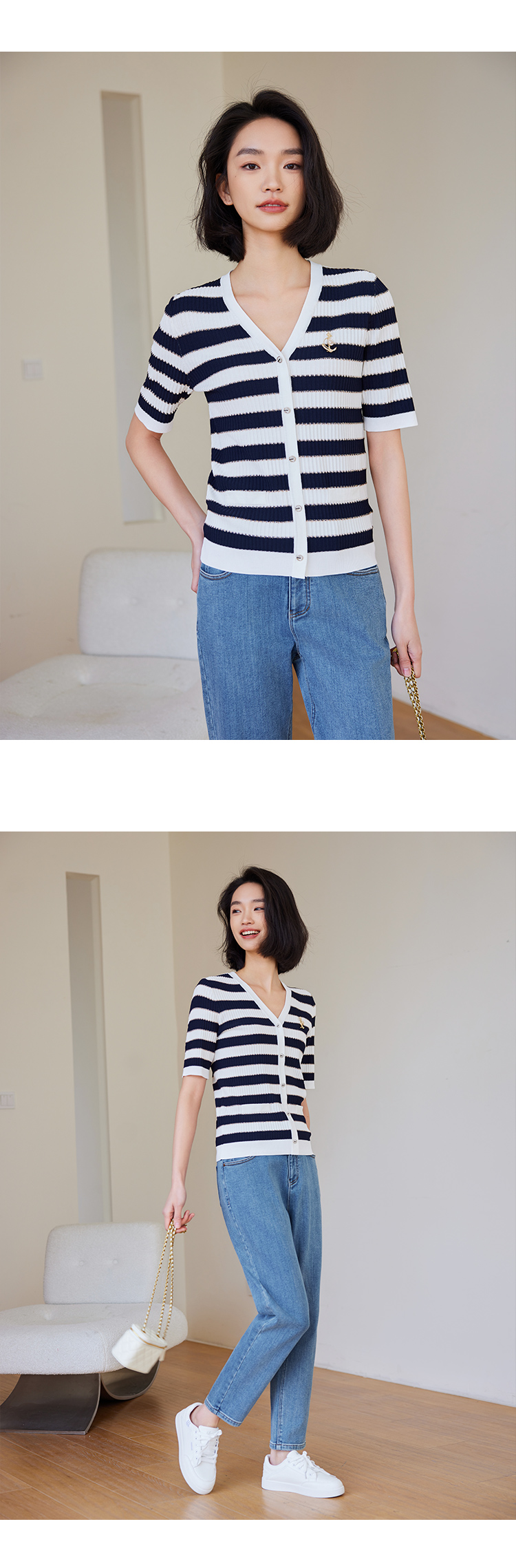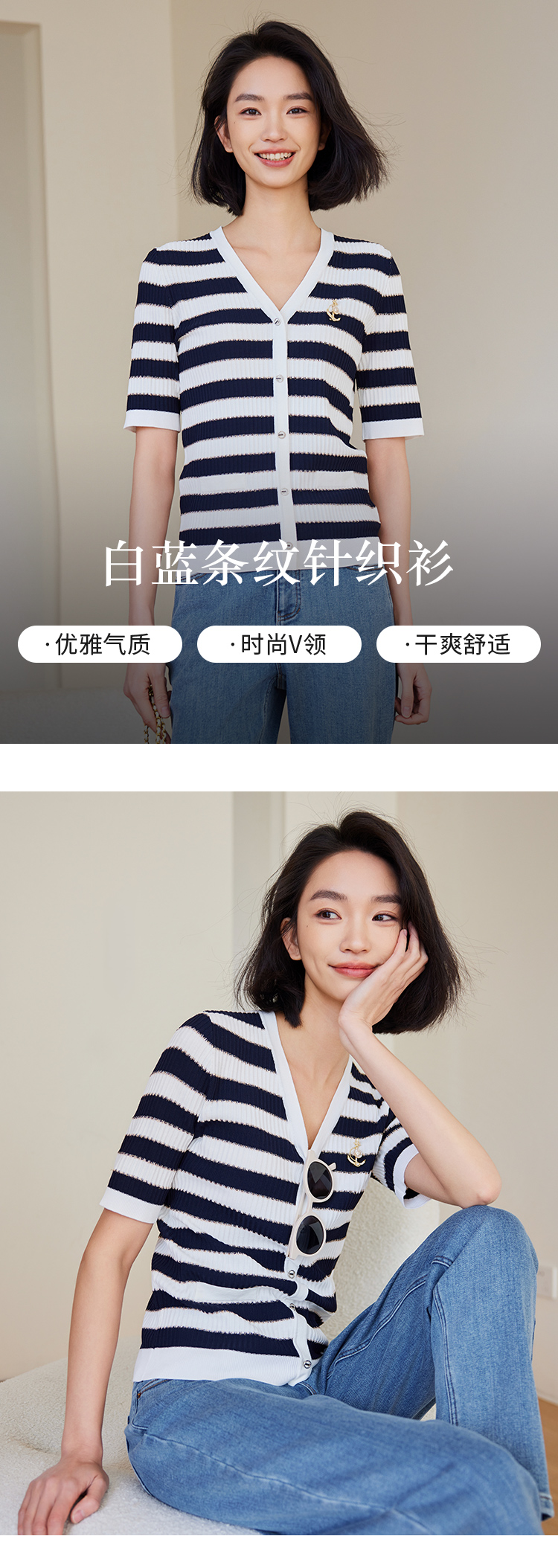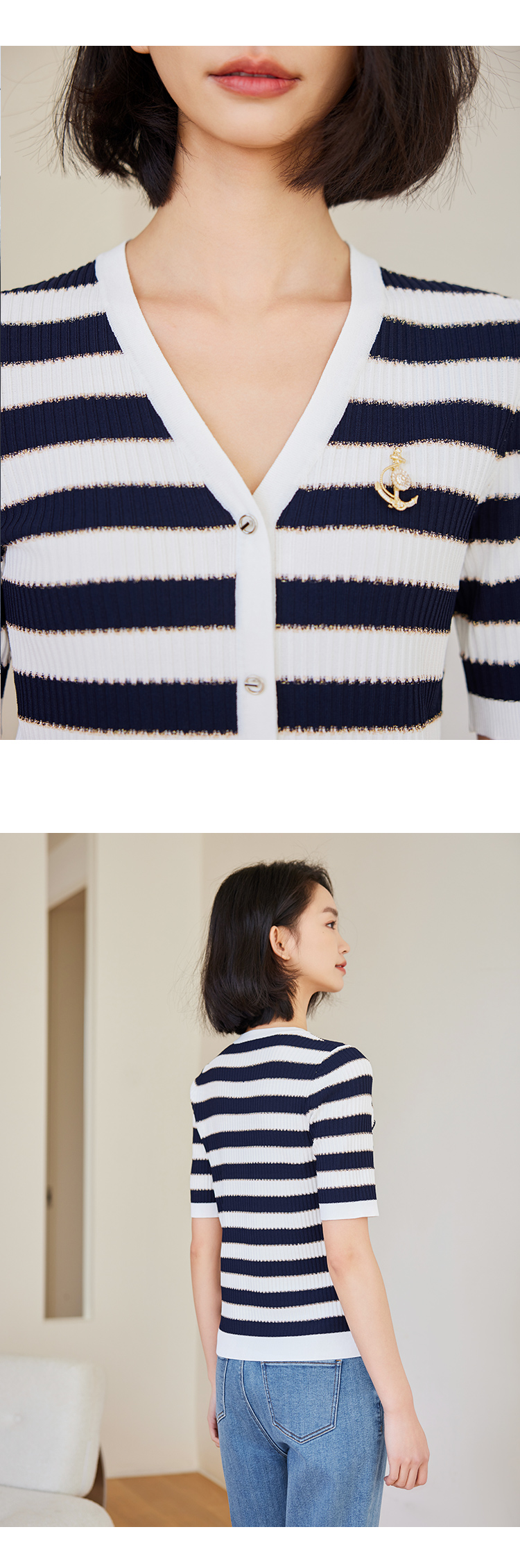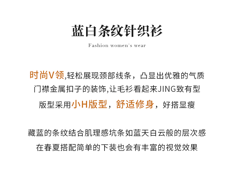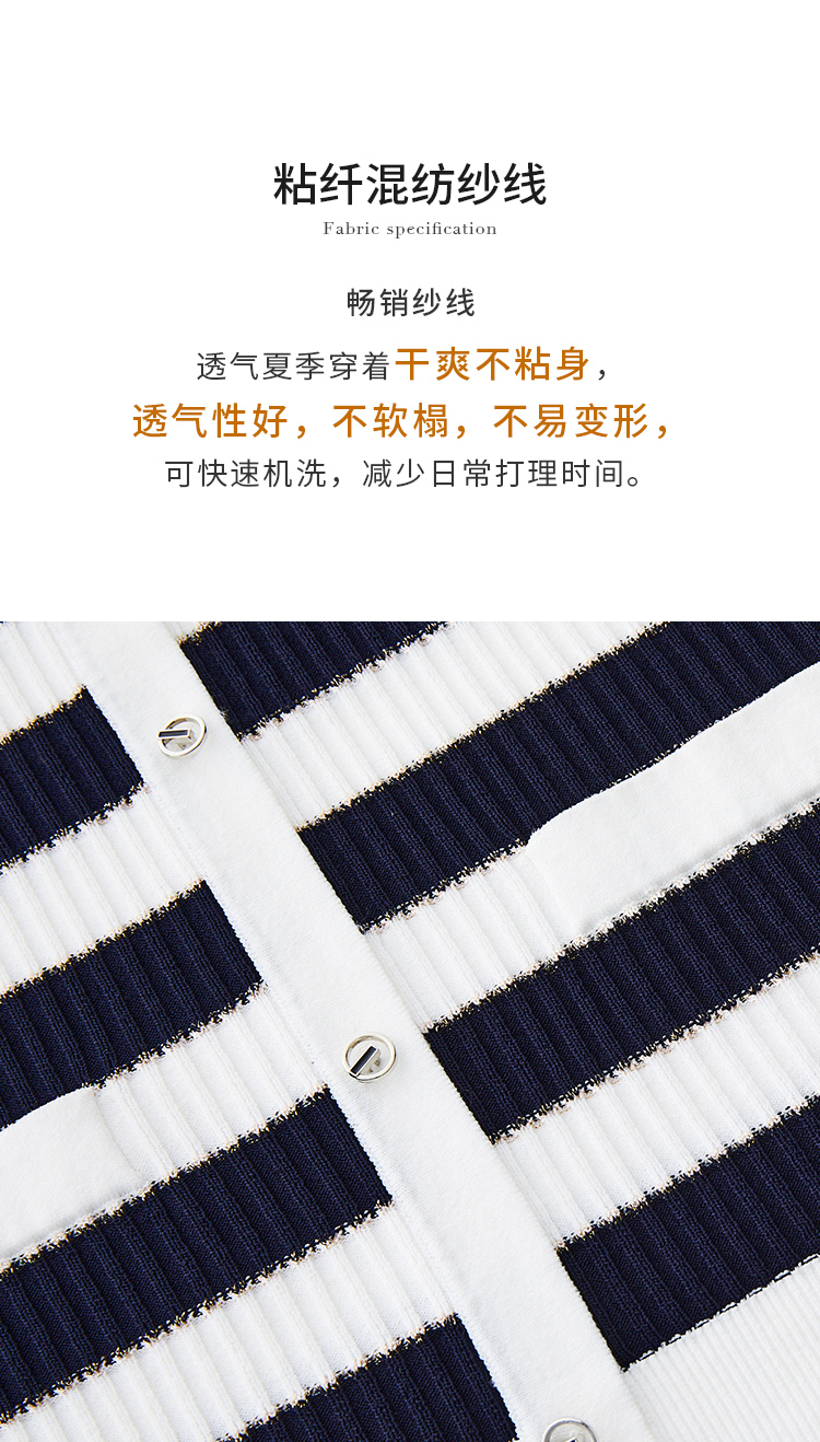 【商场同款】CNK4381 宽条纹黏胶锦纶 藏蓝色条纹 V领针织衫