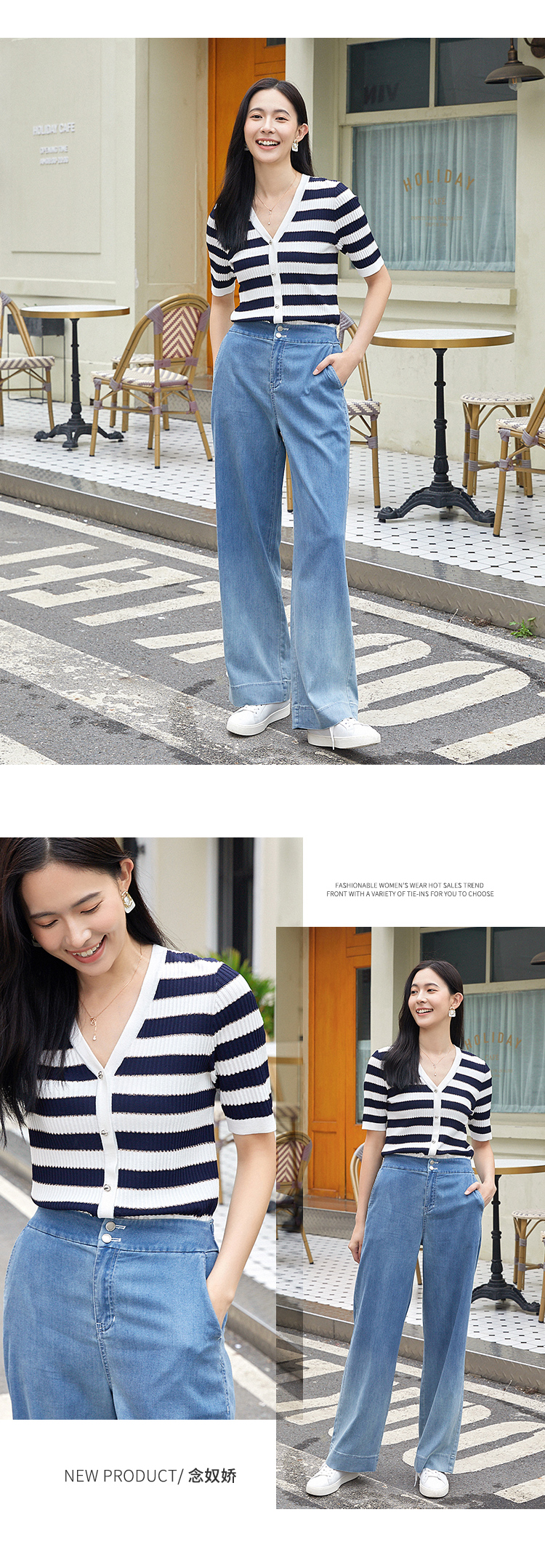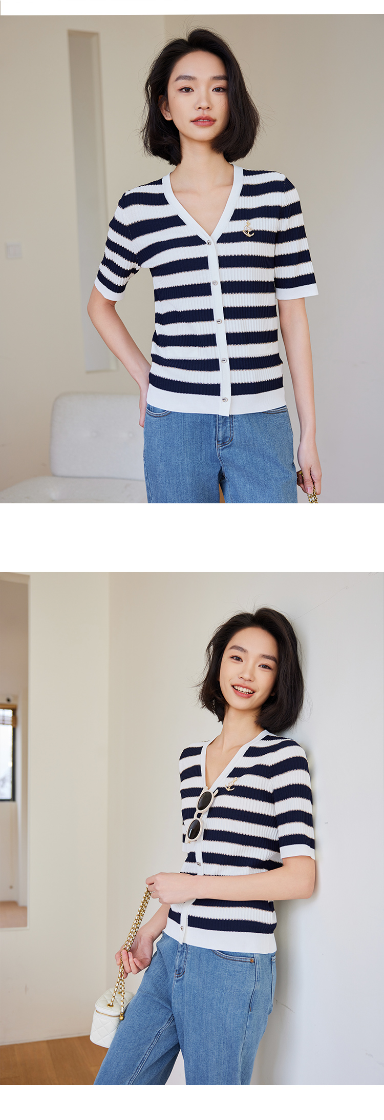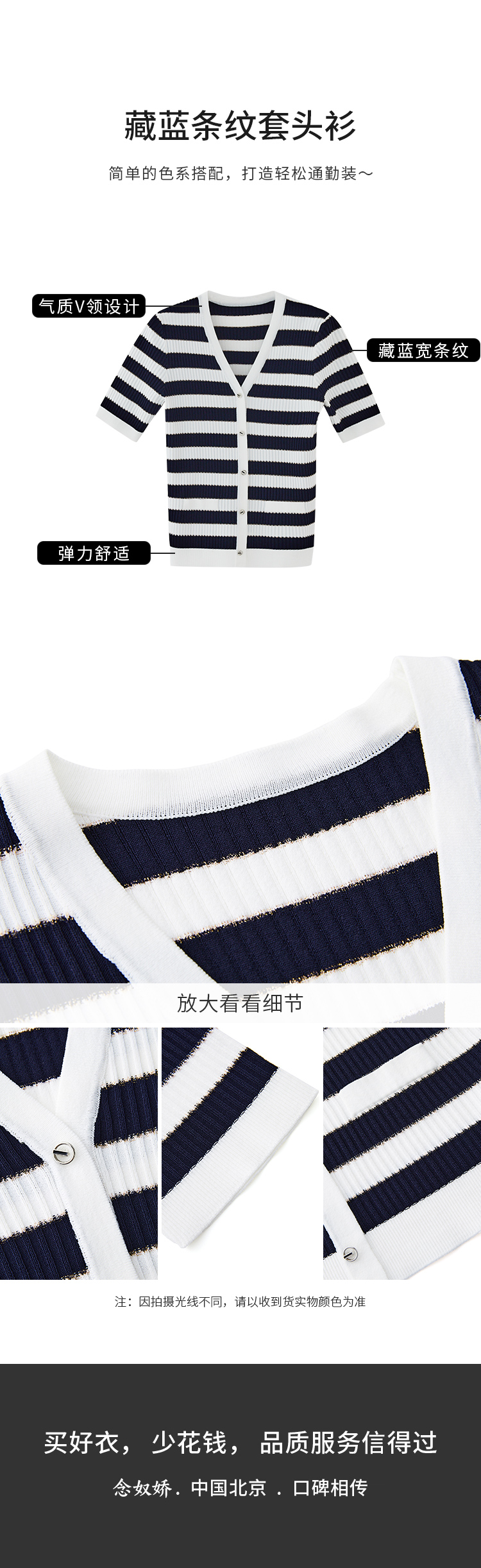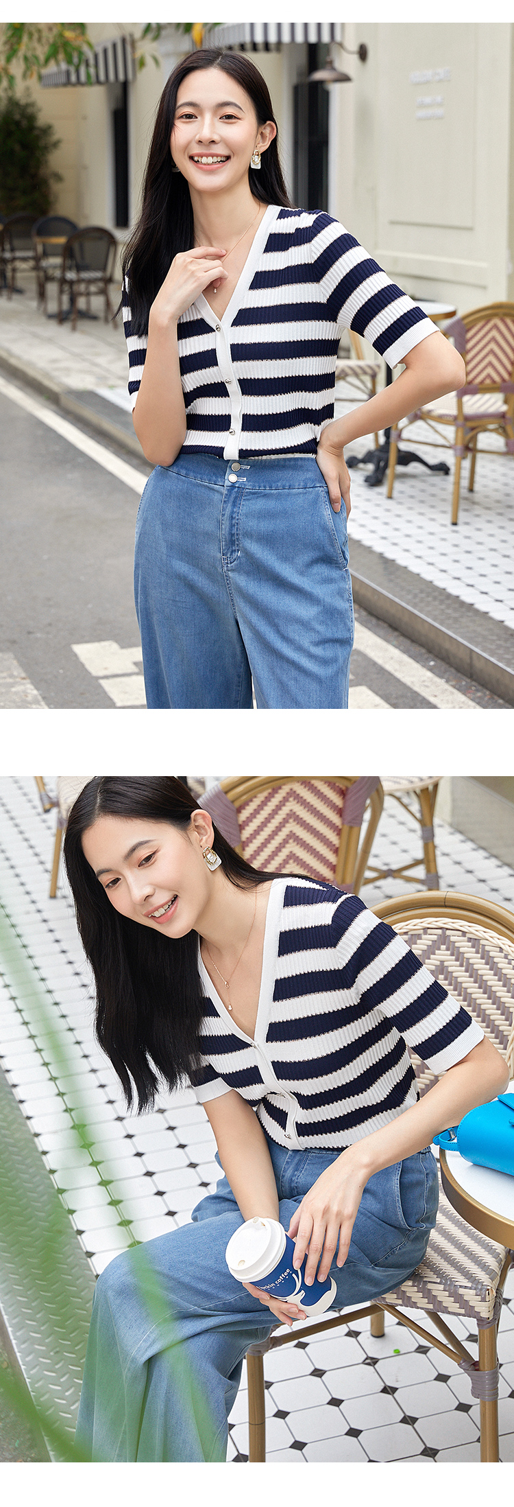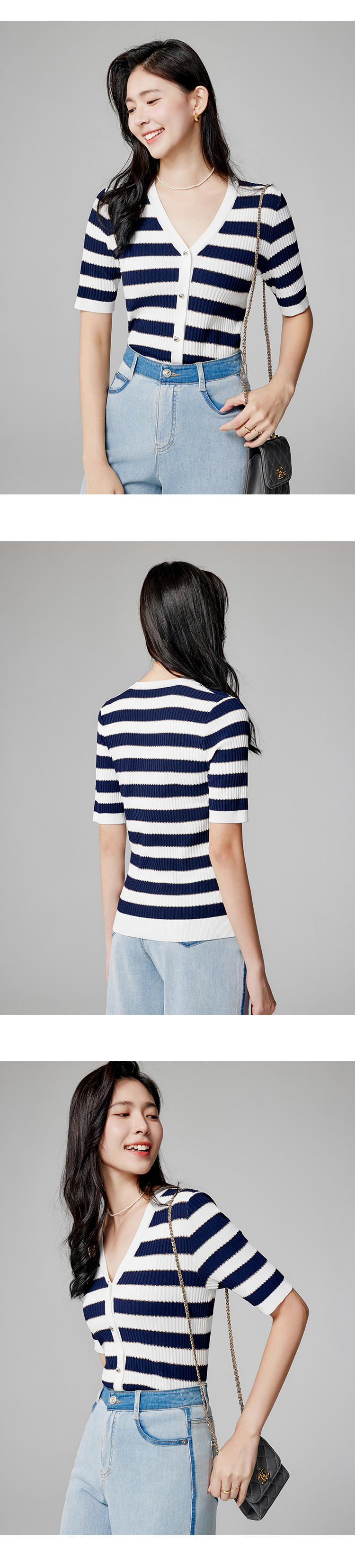 【商场同款】CNK4381 宽条纹黏胶锦纶 藏蓝色条纹 V领针织衫
