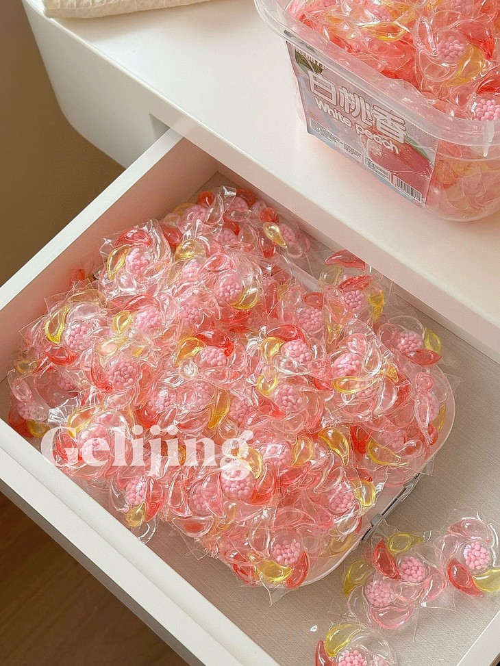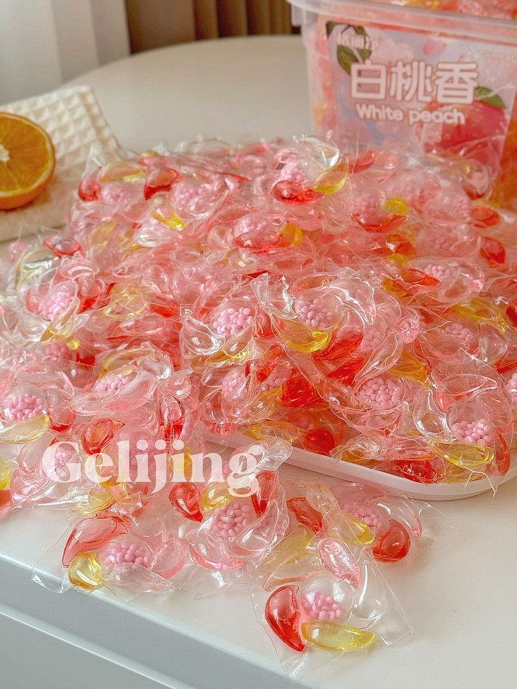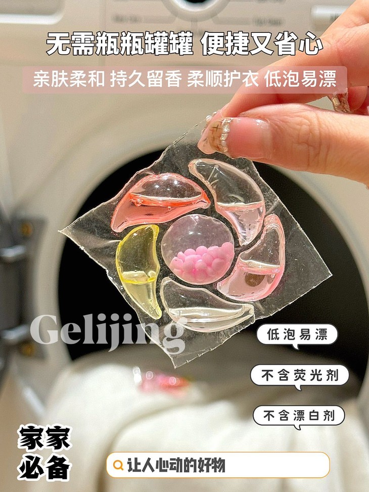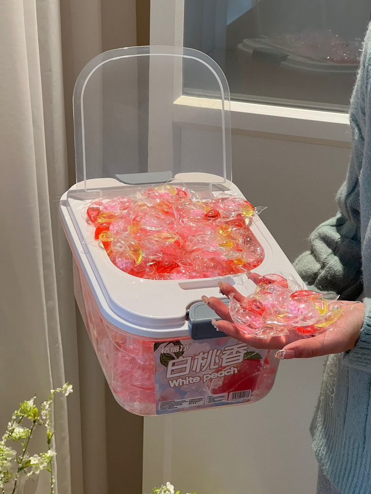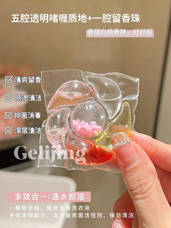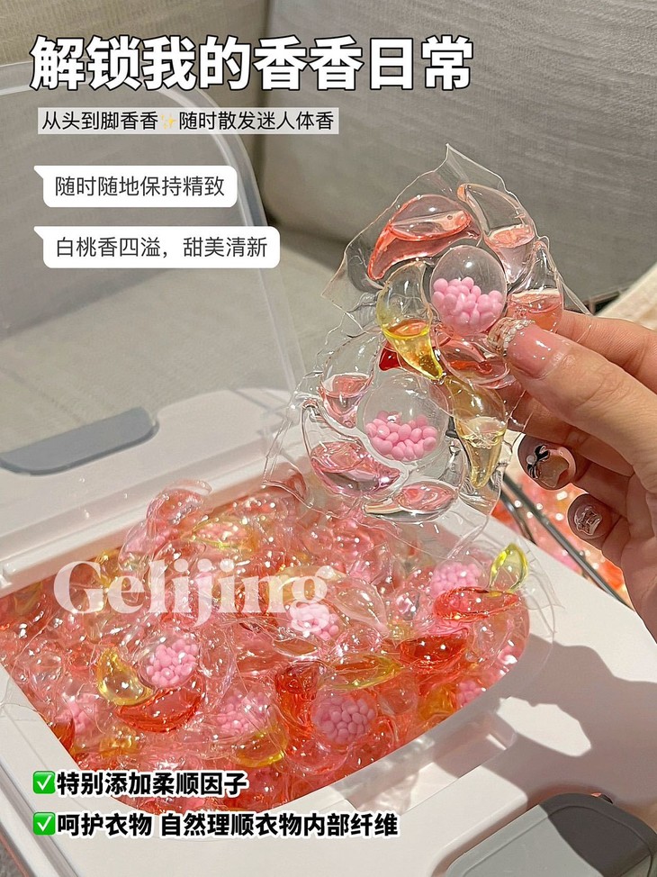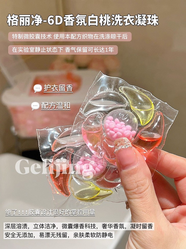 洗衣新宠来袭!格丽净-6D香氛白桃洗衣凝珠,让我爱上每次洗衣时光~💖 每次打开洗衣机的那一刻,都像拆盲盒一样惊喜!这颗凝珠藏着满满的白桃香氛,仿佛咬下一口鲜嫩多汁的桃子🍑,甜蜜气息瞬间包围整个房间~ 而且超级方便哦,一颗搞定清洁+柔顺+留香,告别瓶瓶罐罐的繁琐,懒人必备神器!低泡易漂,妈妈再也不用担心洗涤剂残留啦!