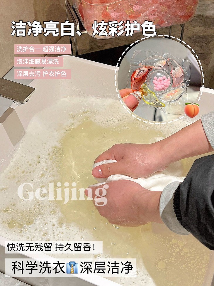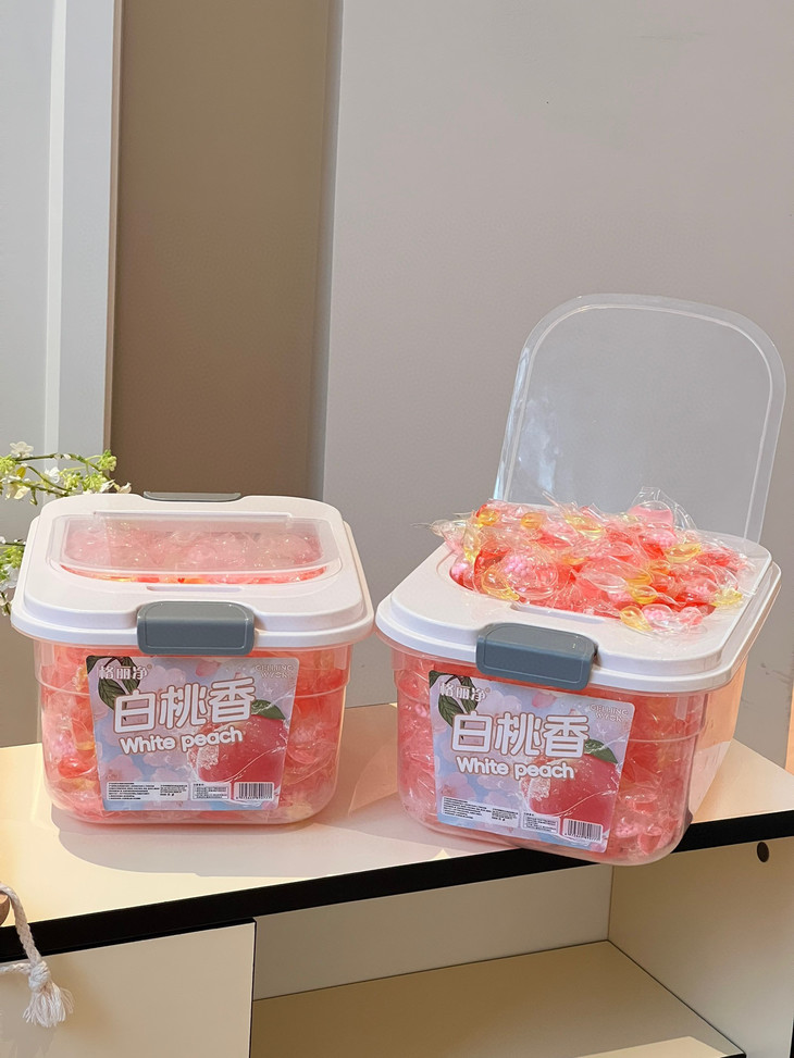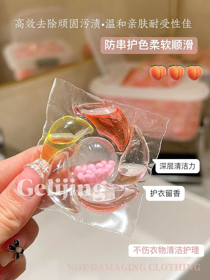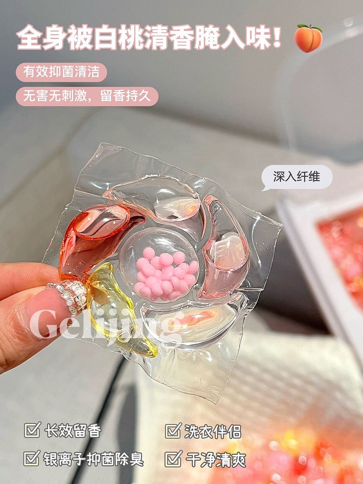 💖「格丽净-6D香氛白桃洗衣凝珠」,简直是家居小仙女的必备神器! 每次洗衣服都像在给衣物做SPA,一颗凝珠=洗衣液+柔顺剂+留香珠,省时省力又省心! 🍑打开包装,瞬间被那清新的白桃香氛包围,仿佛咬下了一口多汁蜜桃,甜蜜感爆棚!😋 洗后可以让衣物持久散发迷人香气,穿上它,你就是行走的白桃女孩,走到哪里都是焦点!