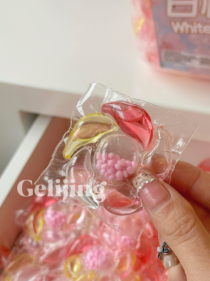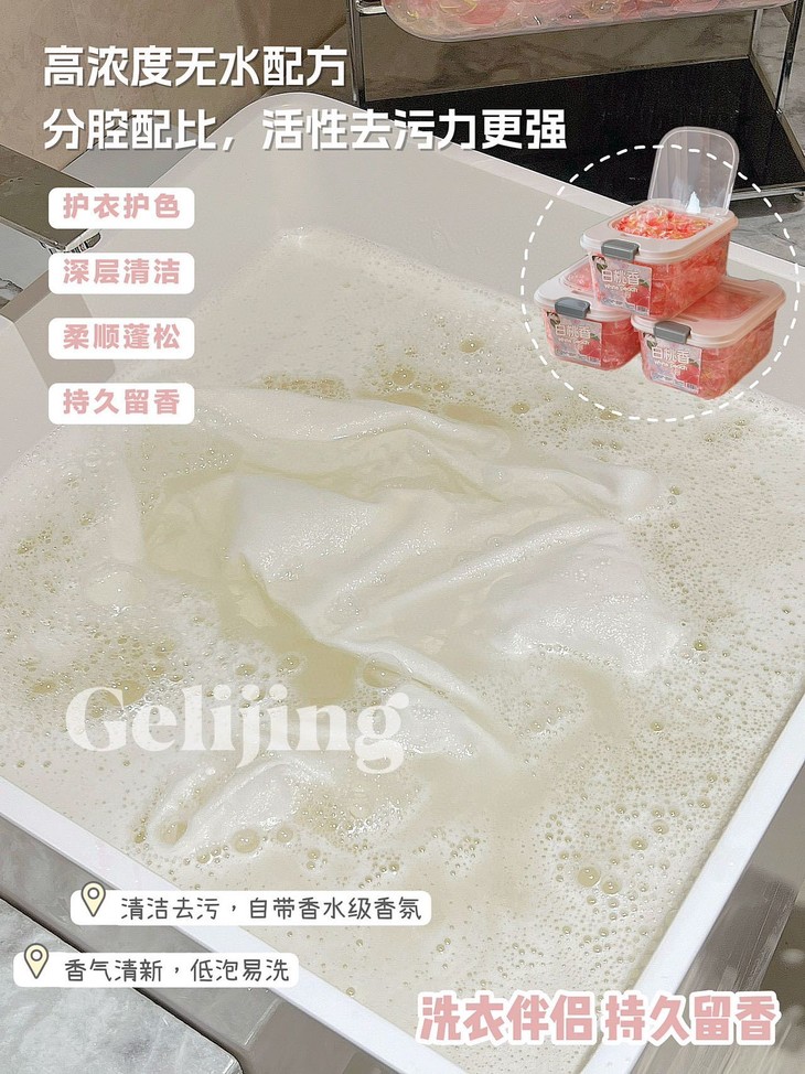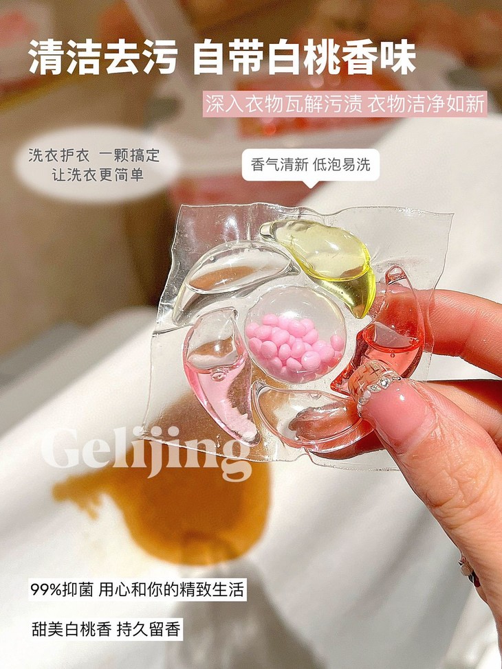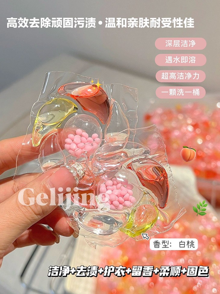 格丽净-6D香氛白桃洗衣凝珠 深层洁净 持久留香 给衣物最温柔的呵护 白桃香氛 洁净如新、每颗凝珠蕴含6D香氛技术,让衣物散发持久清新桃香 轻轻一颗 溶解迅速🫧无论是机洗还是手洗 都能带来深层洁净效果 细腻泡沫 温柔呵护,保护衣物纤维 延长衣物寿命,适合追求生活品质的你,让每次穿着都成为享受