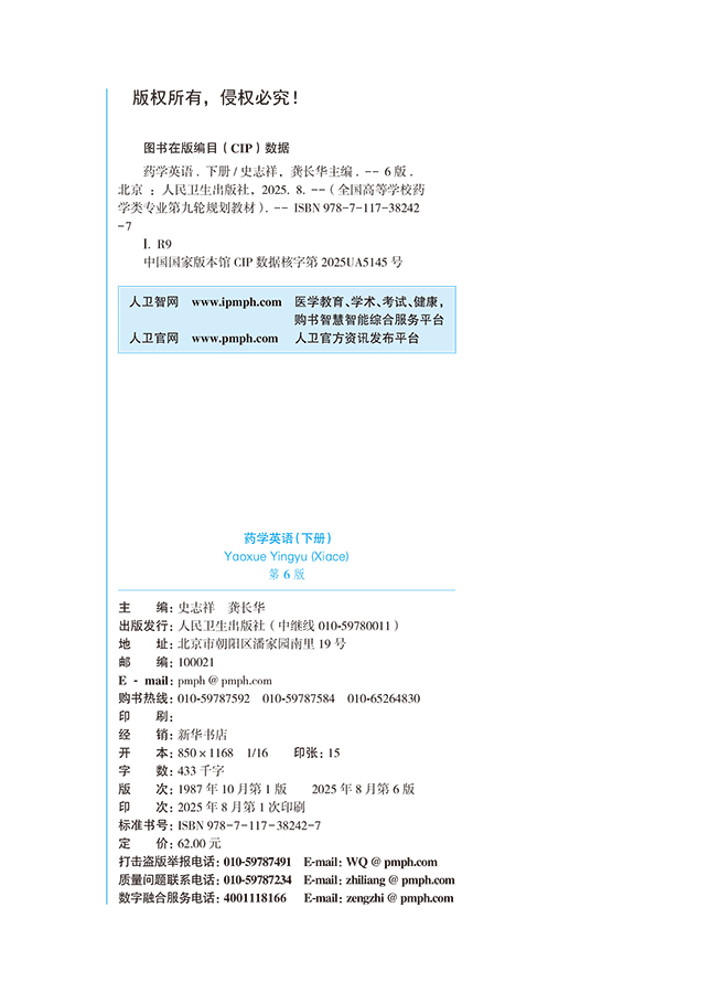 书名:药学英语(下册)(第6版/学历教育教材/本科/药学专业)