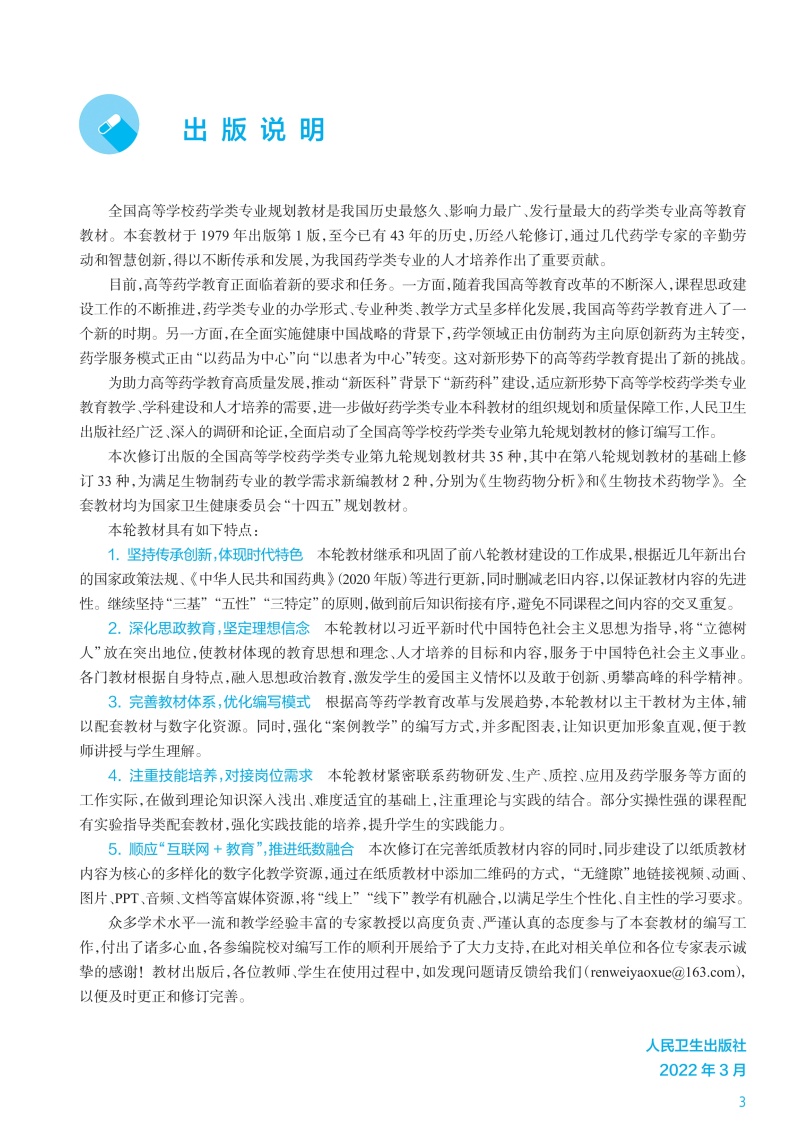 第九轮规划教材将从以下几个方面进行提升与优化:一是内容上传承创新,将经得起时间检验的知识点写入教材,同时根据新出台的国家政策法规、《中国药典》等对教材进行更新,保证教材内容的先进性;二是继续坚持“三基”“五性”“三特定”的原则,进一步优化主体框架设计,做到前后知识衔接有序,避免不同课程直接内容的交叉重复;三是理实结合,培养学生的创新能力和新药研发能力,注重学生实践能力的提升;四是将思想政治教育纳入教材,激发学生的爱国主义情怀以及敢于创新、勇攀高峰的科学精神。