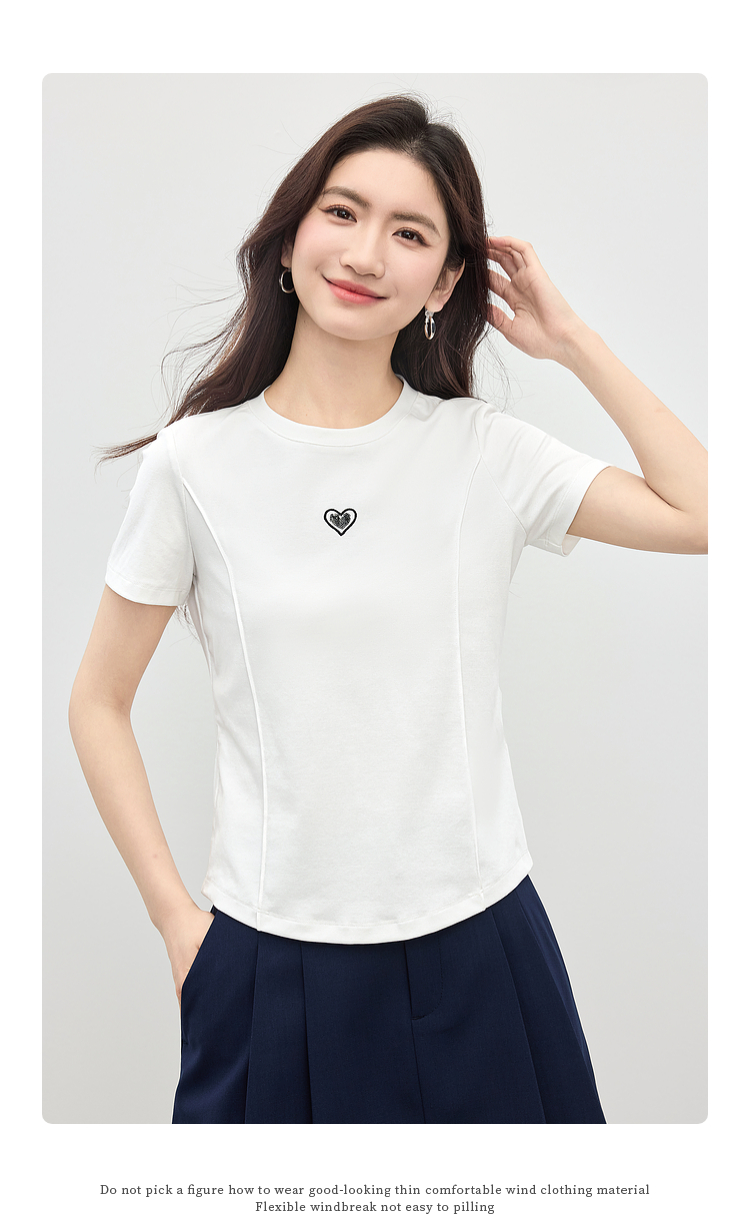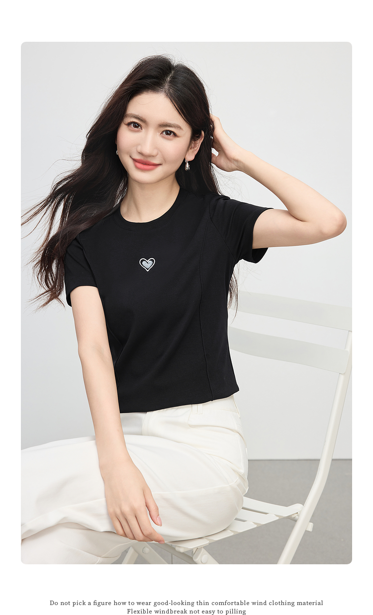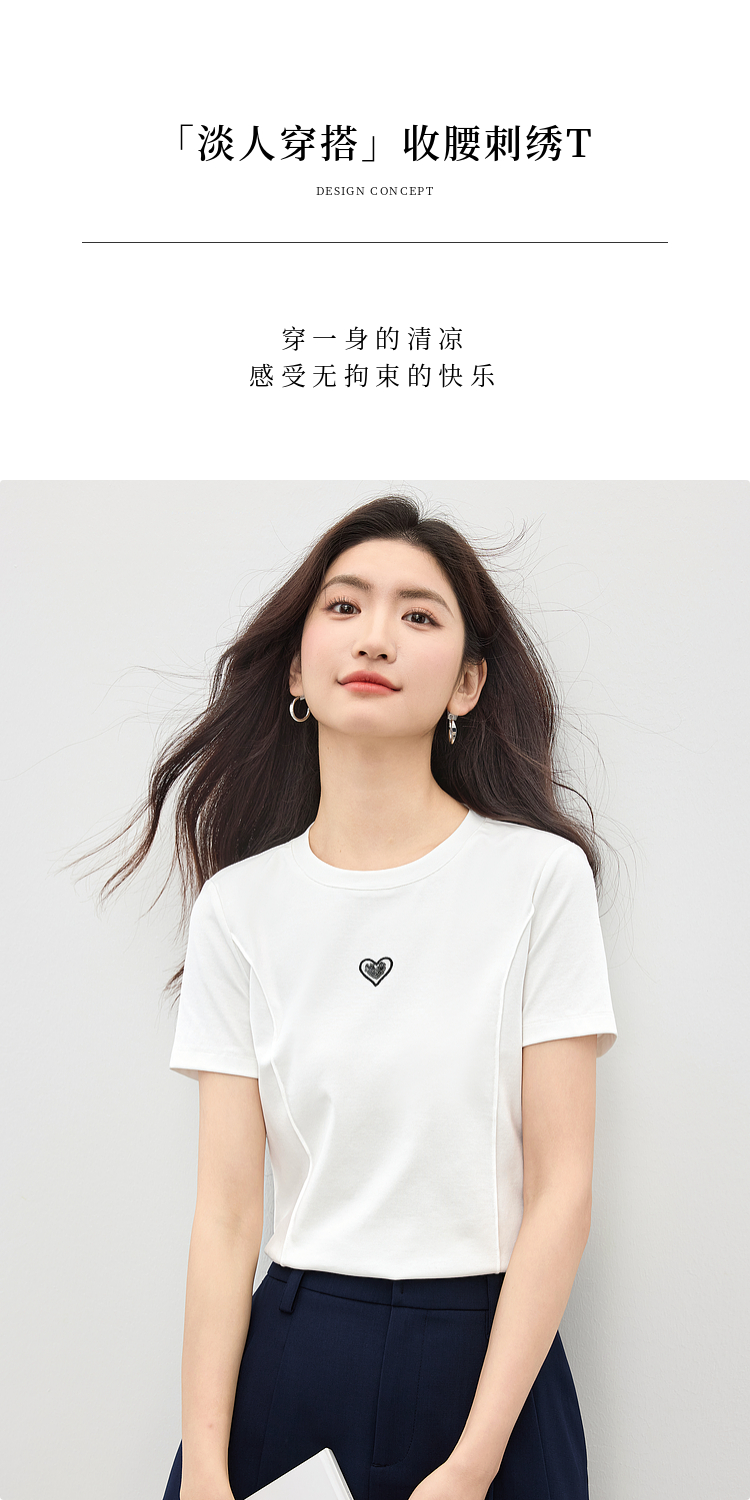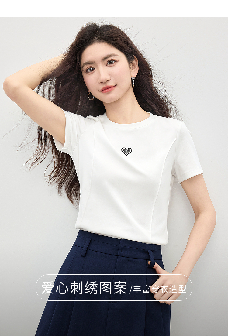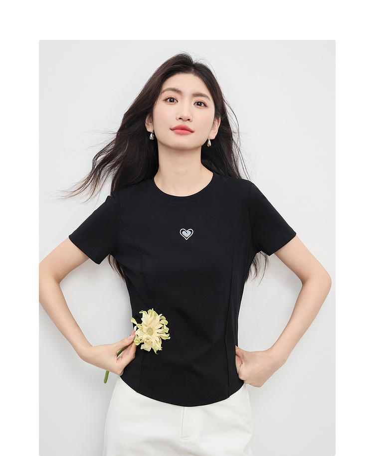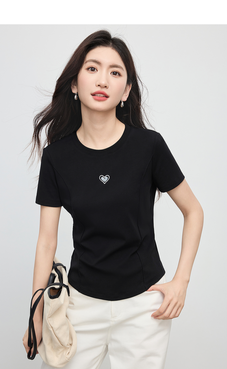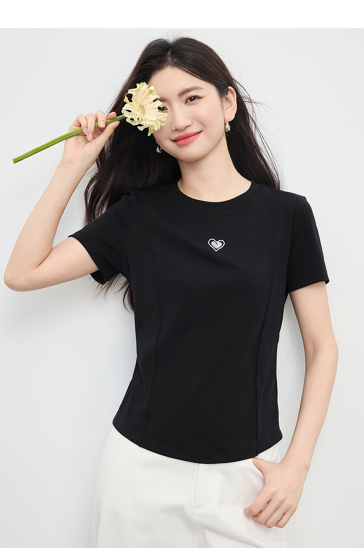 【07/16新品】熙世界爱心刺绣正肩T恤女2025夏季新款百搭修身短袖收腰显瘦上衣
