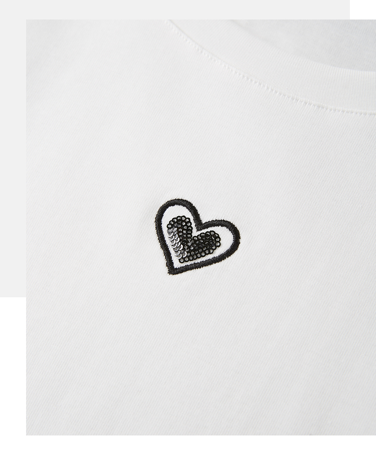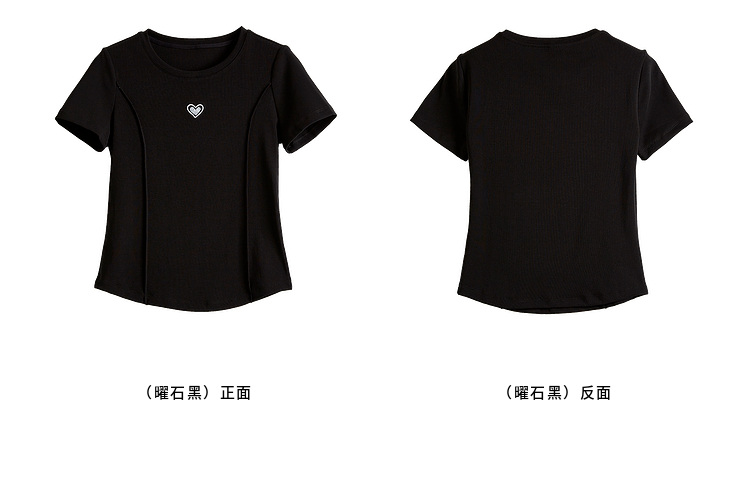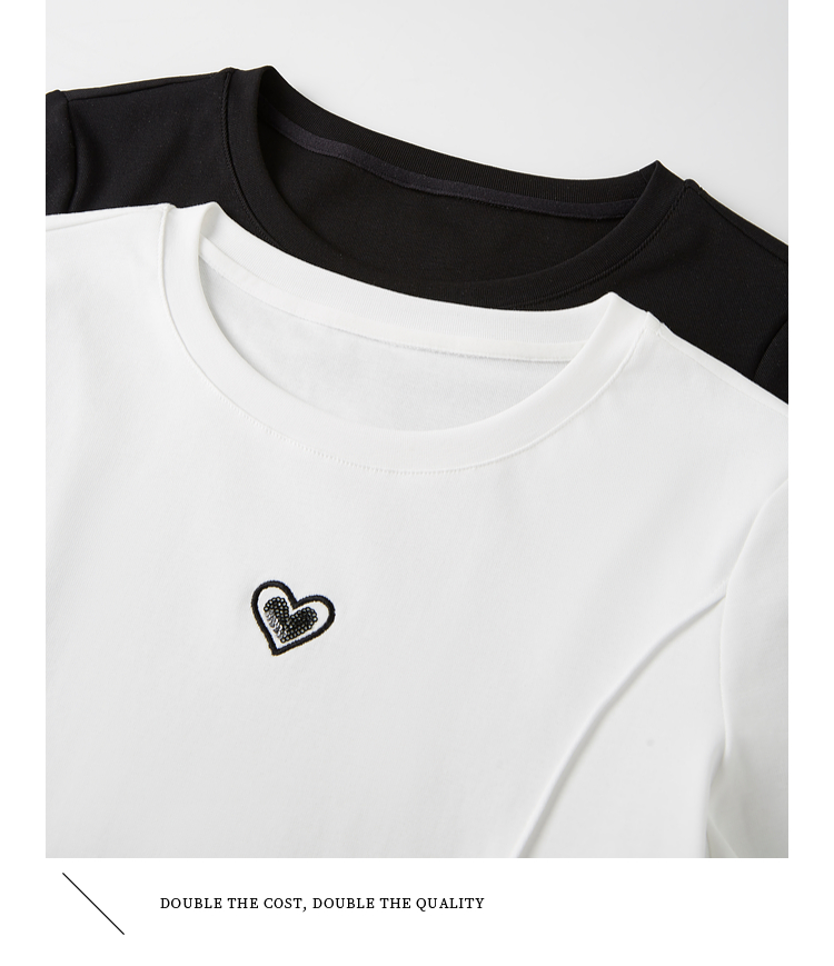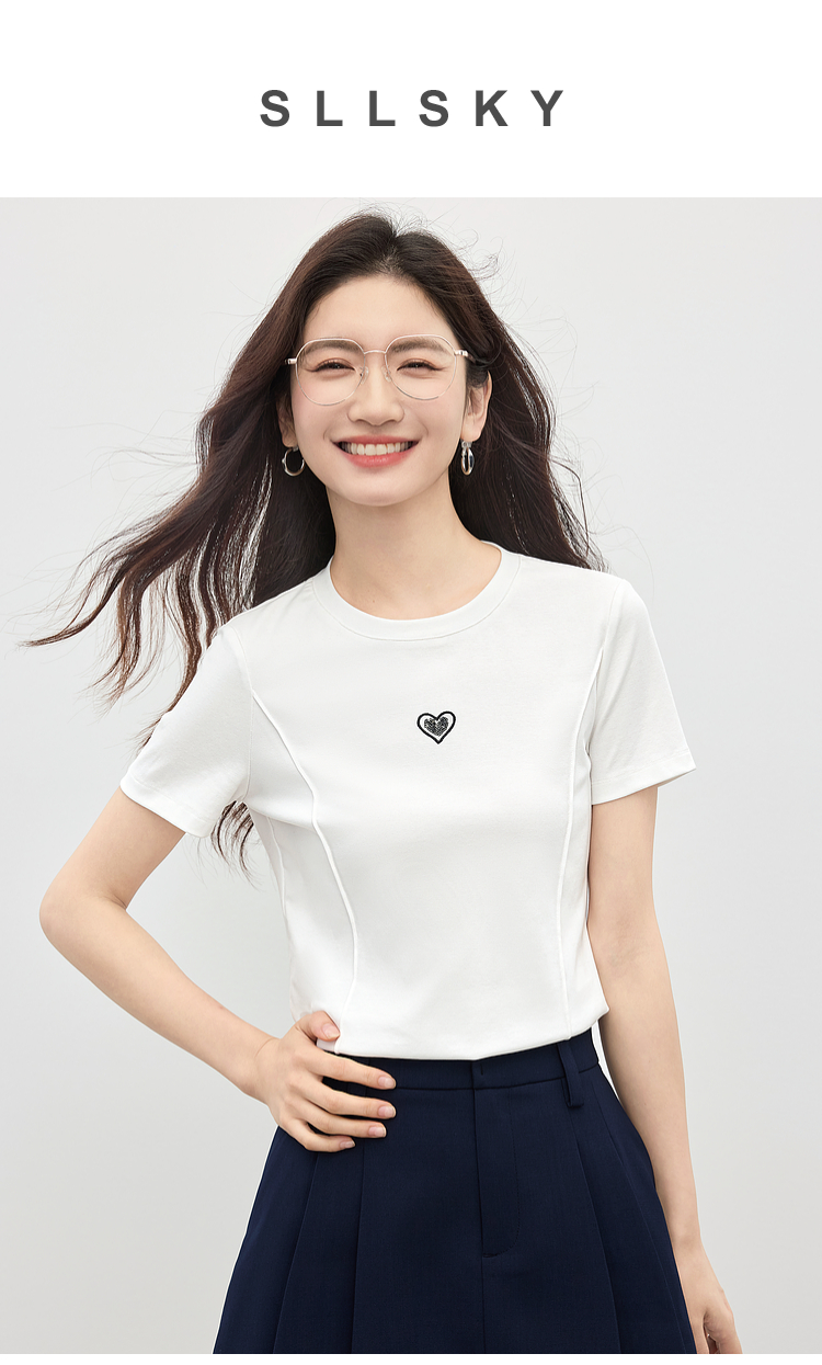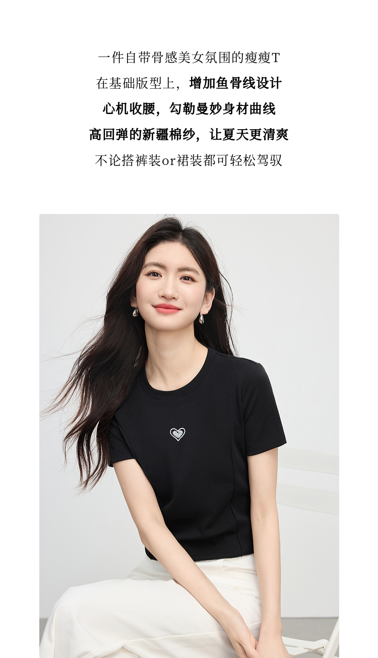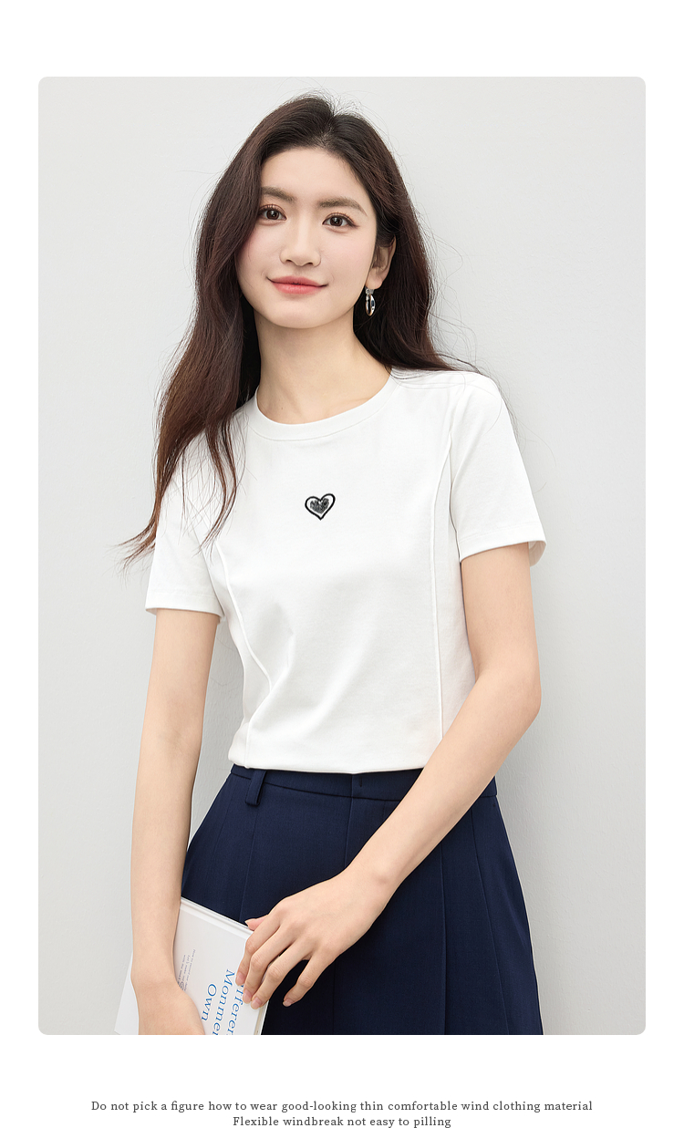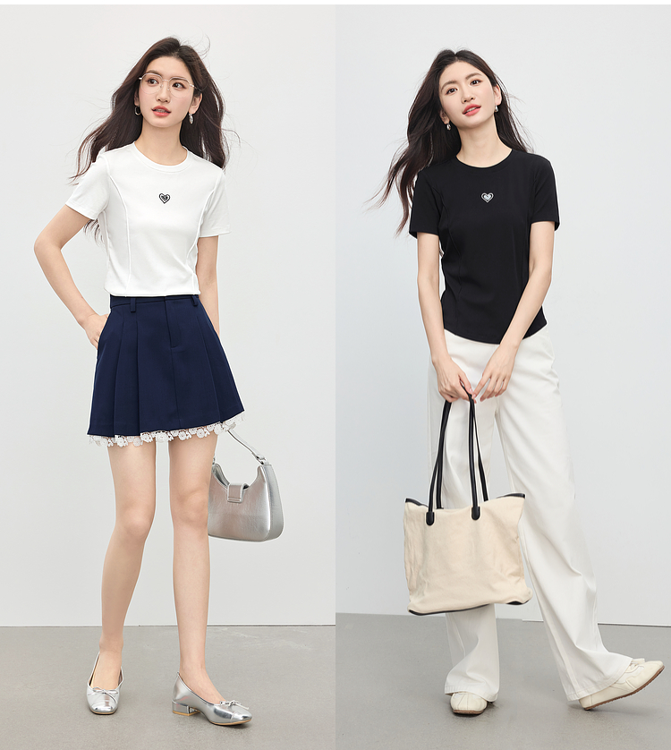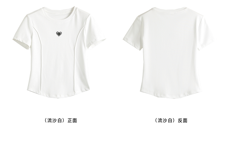 【07/16新品】熙世界爱心刺绣正肩T恤女2025夏季新款百搭修身短袖收腰显瘦上衣