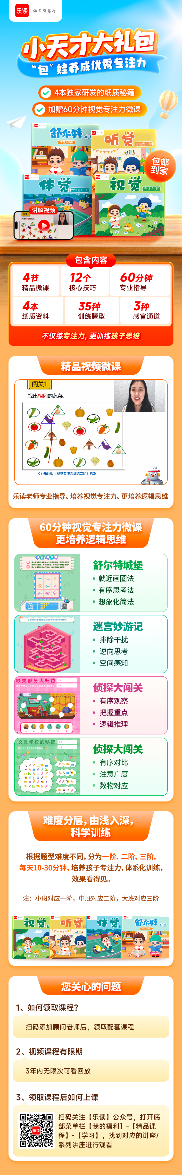 【广州学而思乐读】小天才大礼包4册【注意:必须扫码填写指定幼儿园名称信息才发货】独家研发专注力书籍《视觉、听觉、体觉、舒尔特专注力训练》+60分钟视觉专注力微课