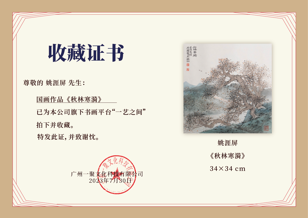 姚涯屏《秋林寒漪》国画34CM×34CM 约1平尺手绘纸本宣纸作品【原作编号GH0400】
