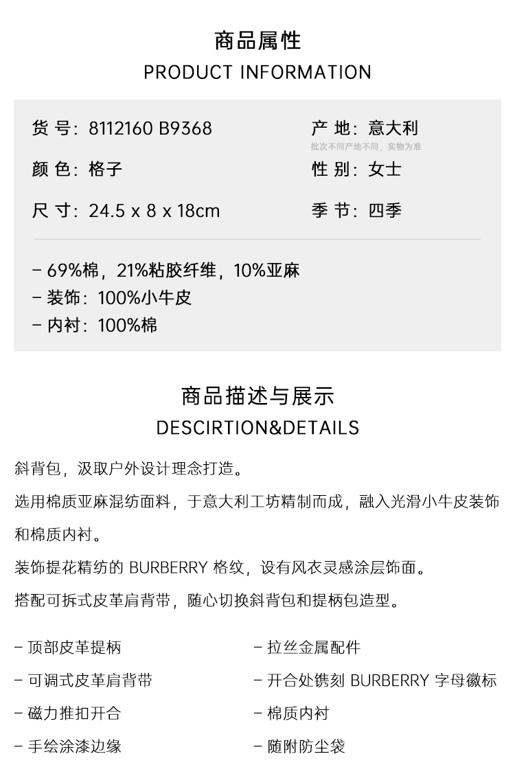BURBERRY 巴宝莉 女士字母徽标刻字 Highlands 提挎包 格子 8112160 B9368
