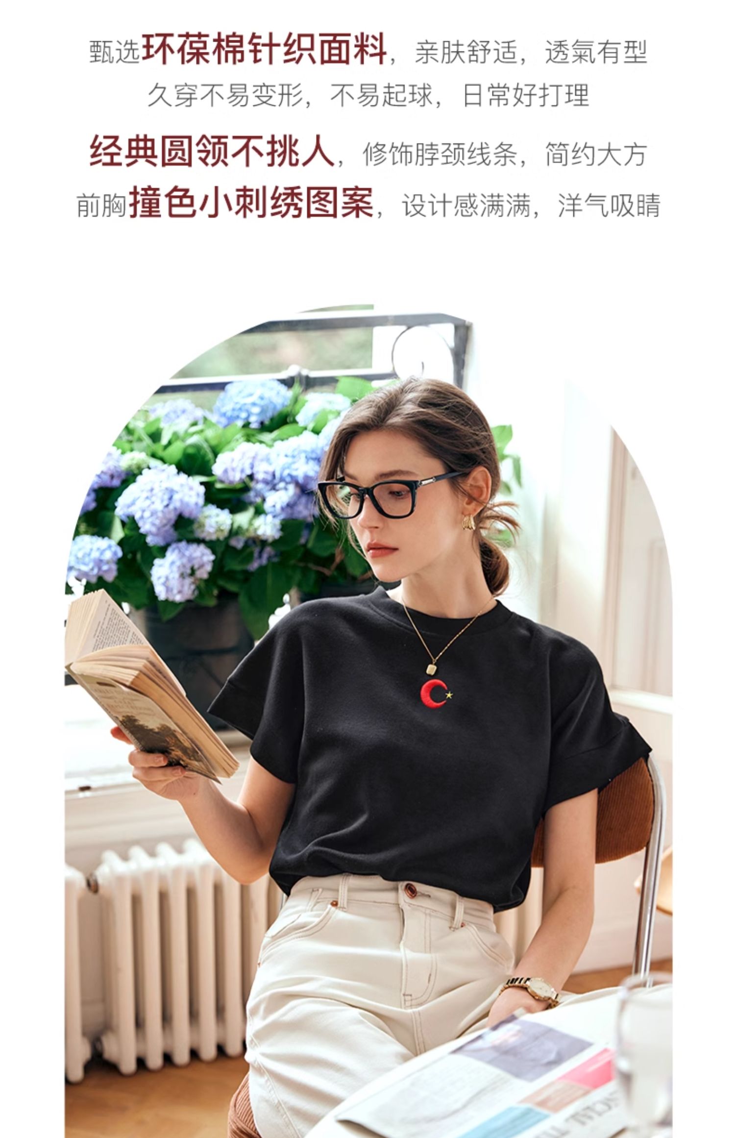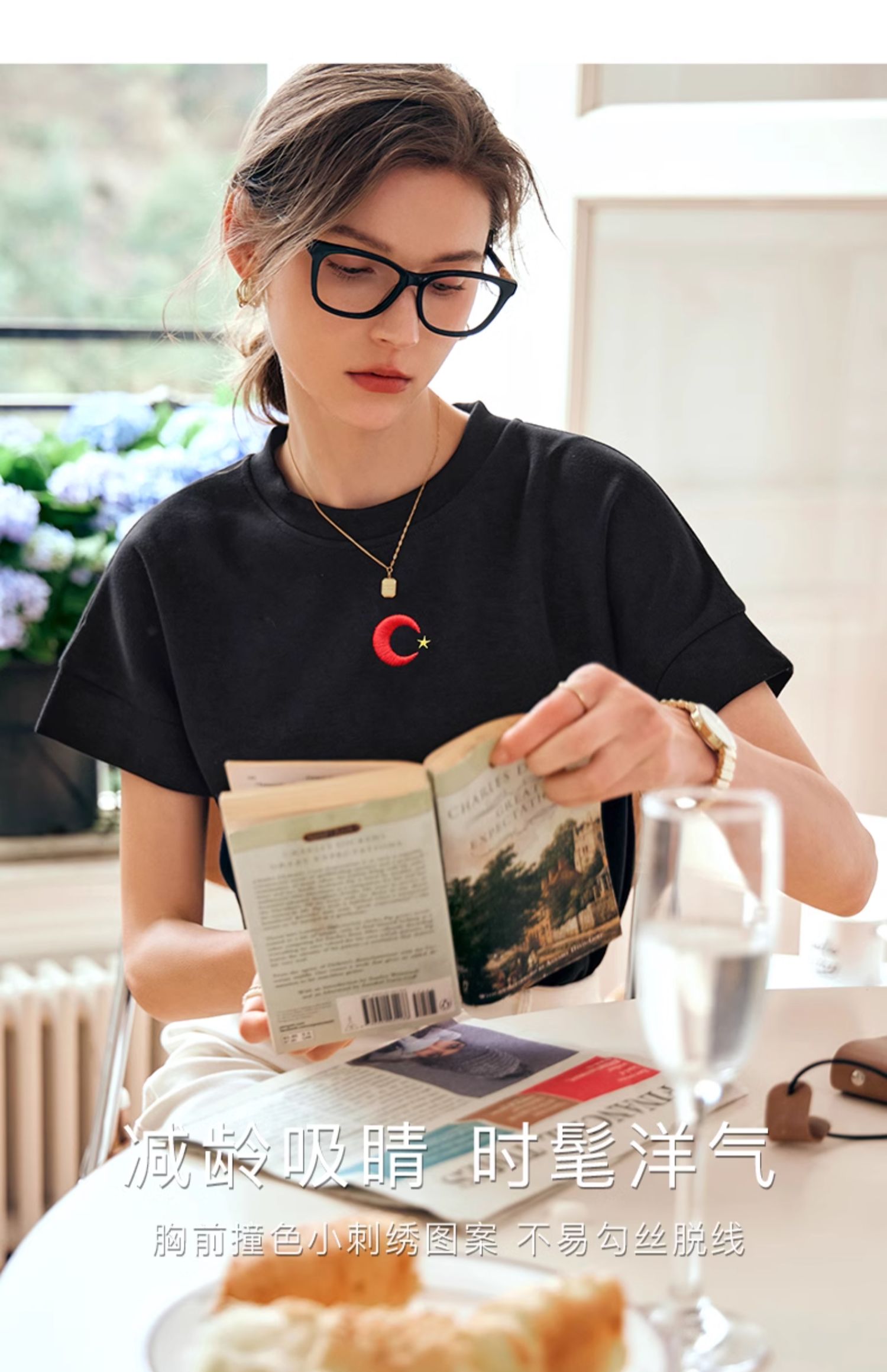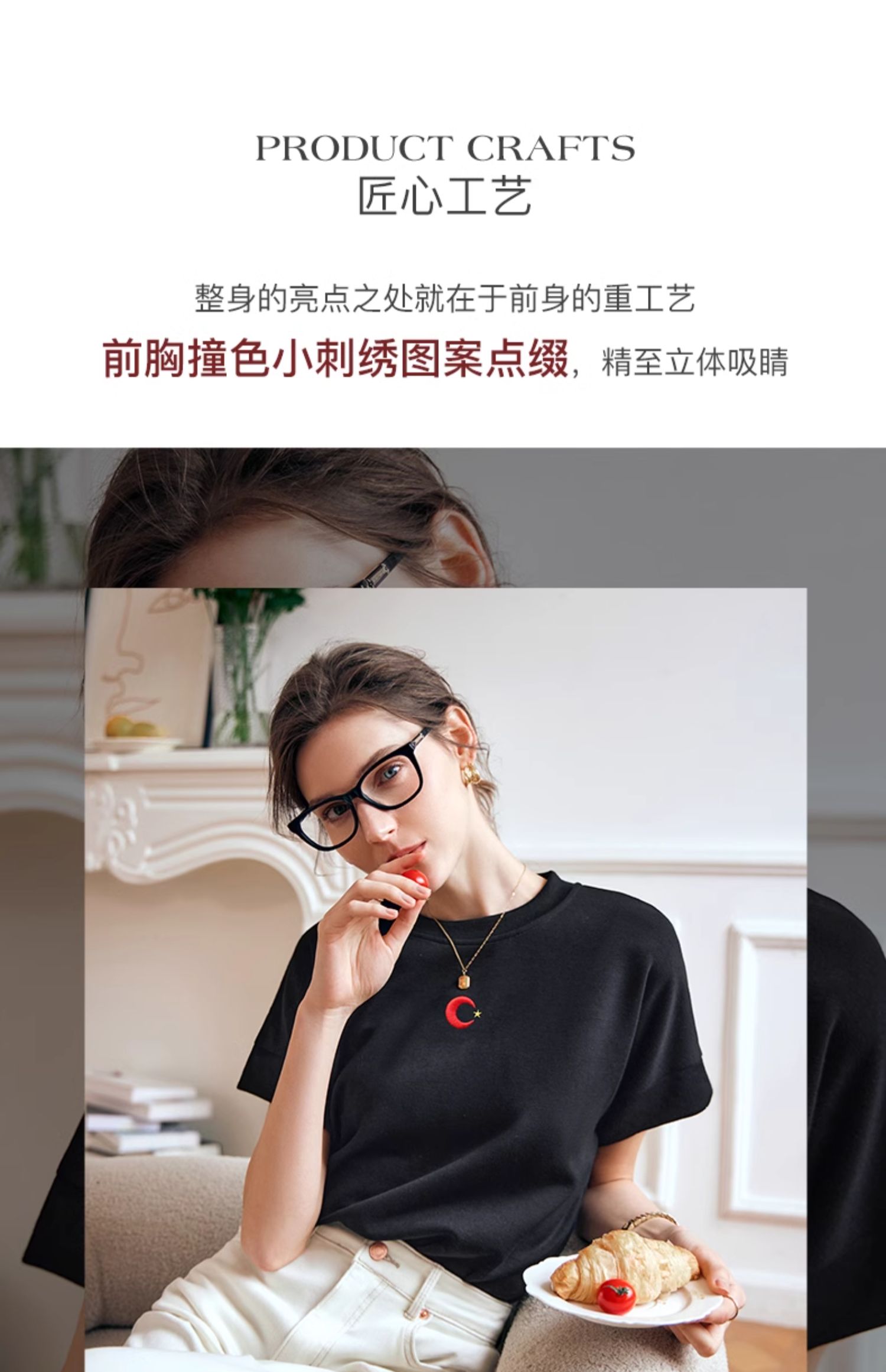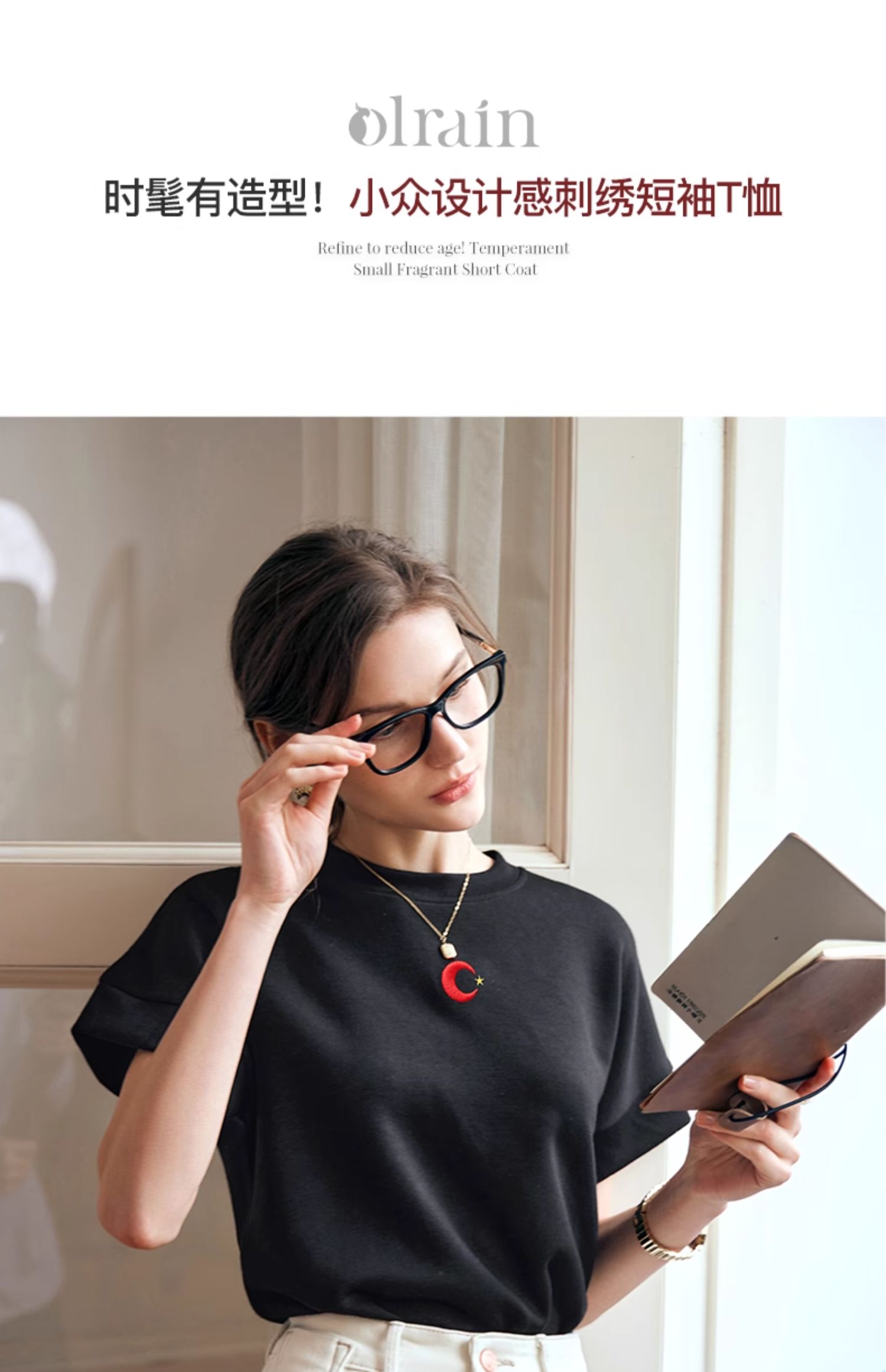 OLrain欧芮儿黑色T恤女春季2024新款小众宽松设计感刺绣短袖上衣