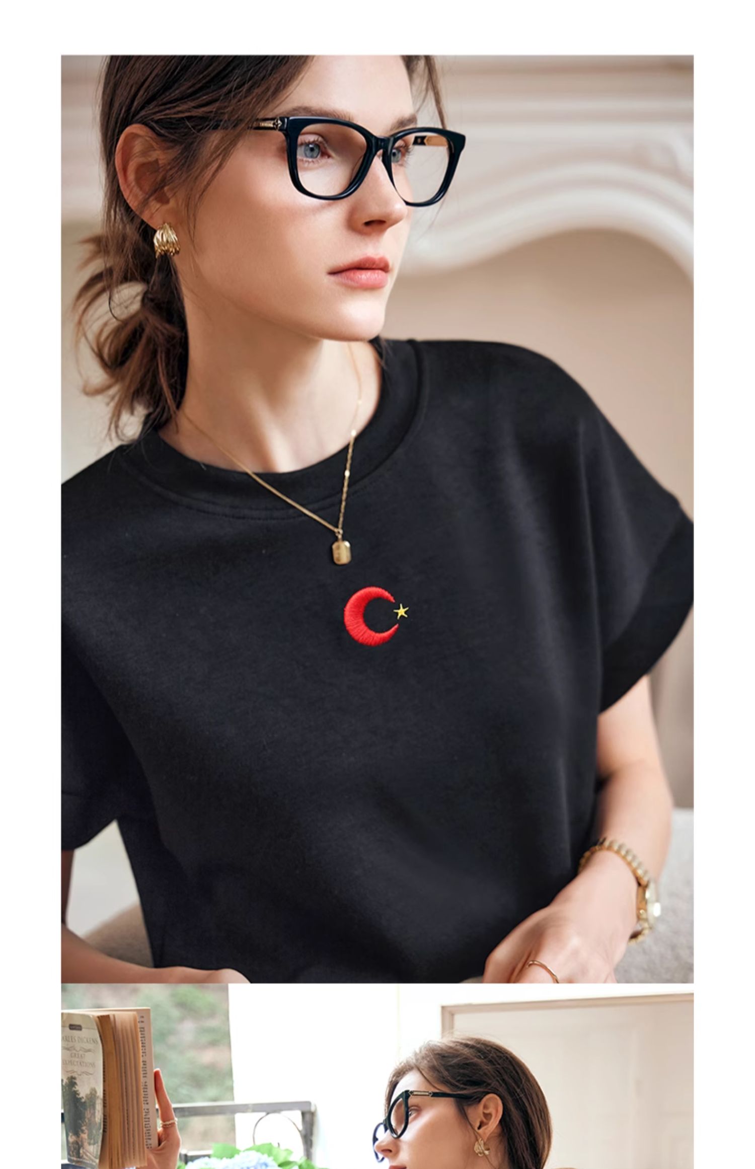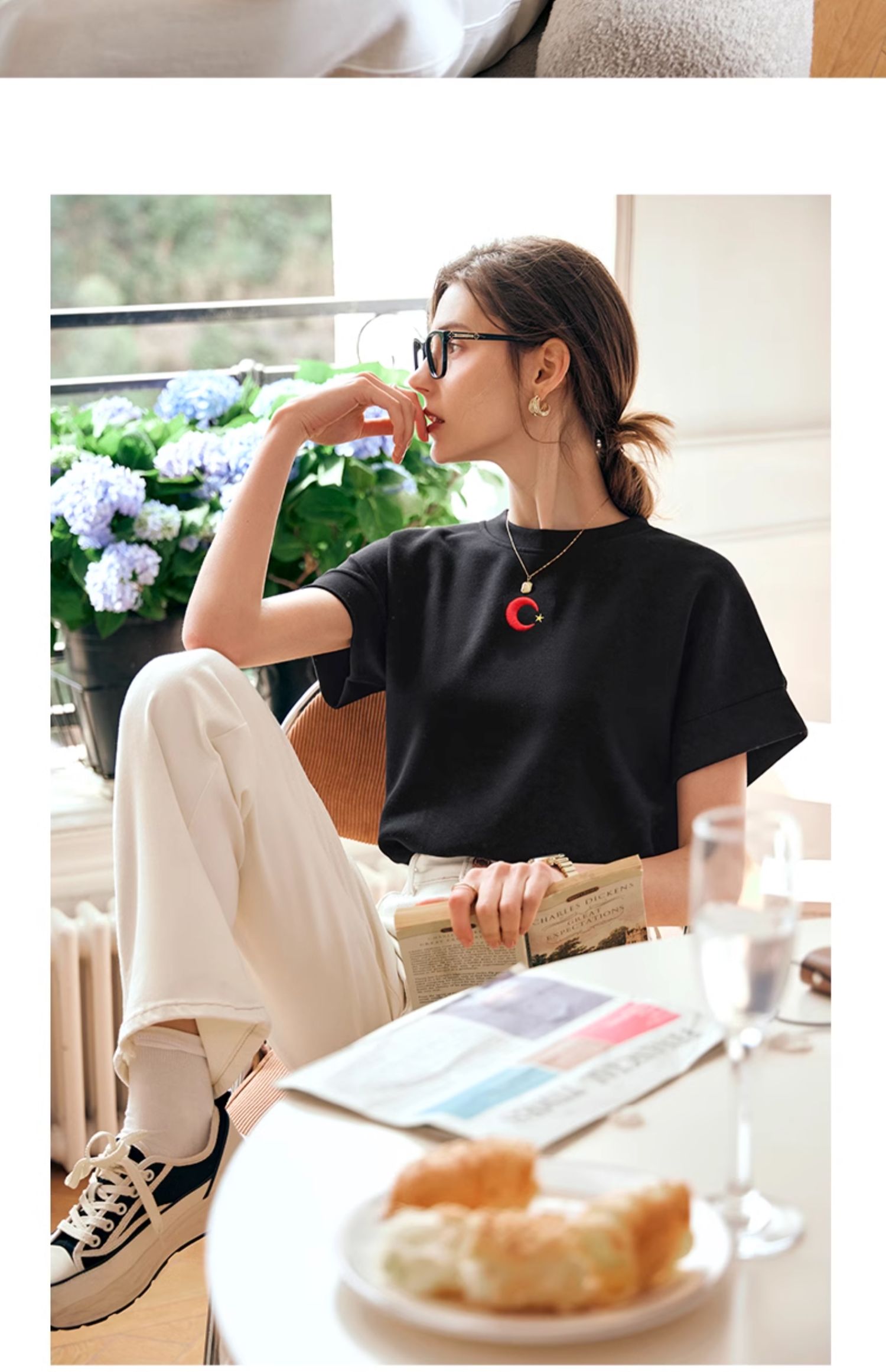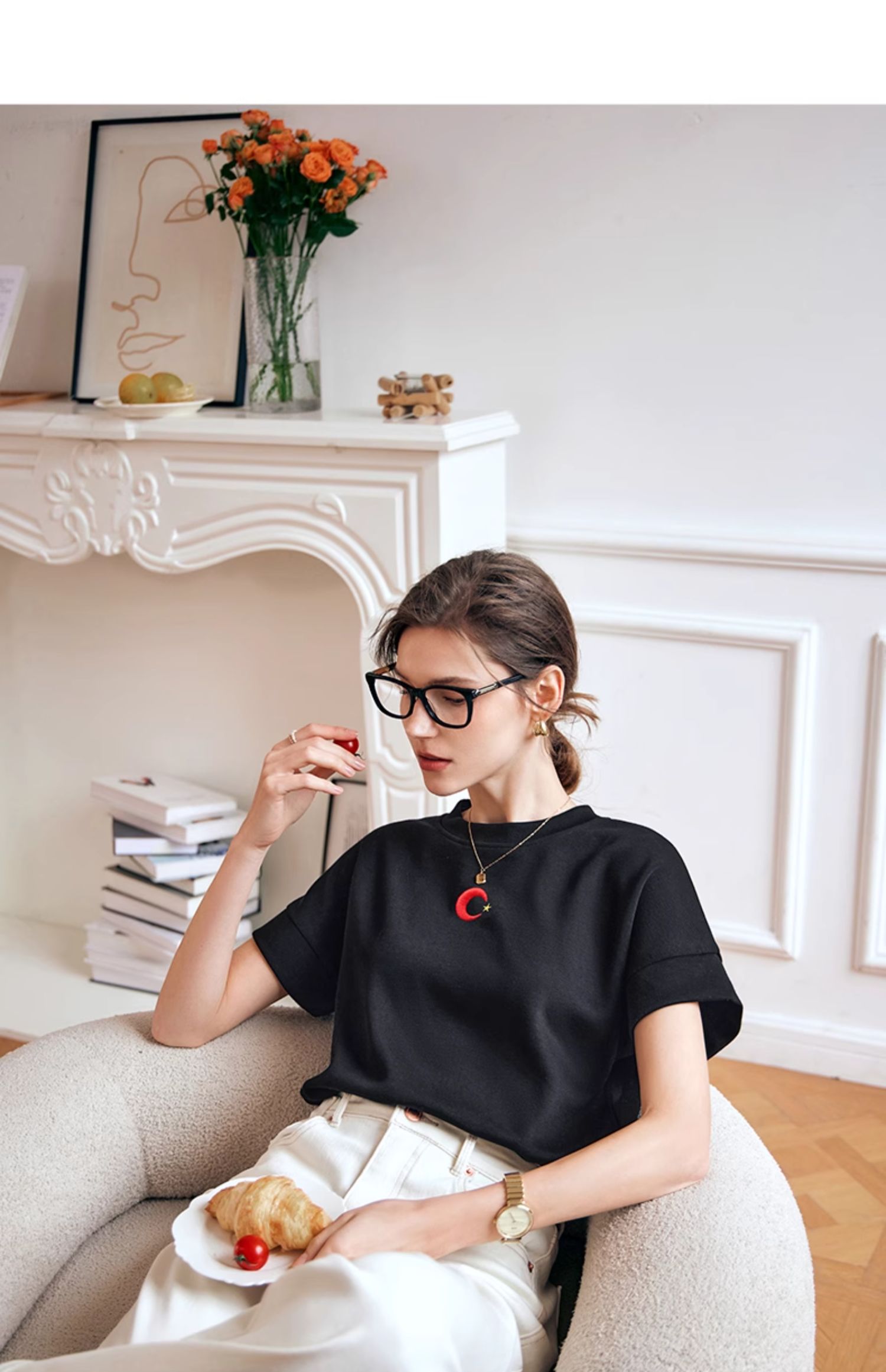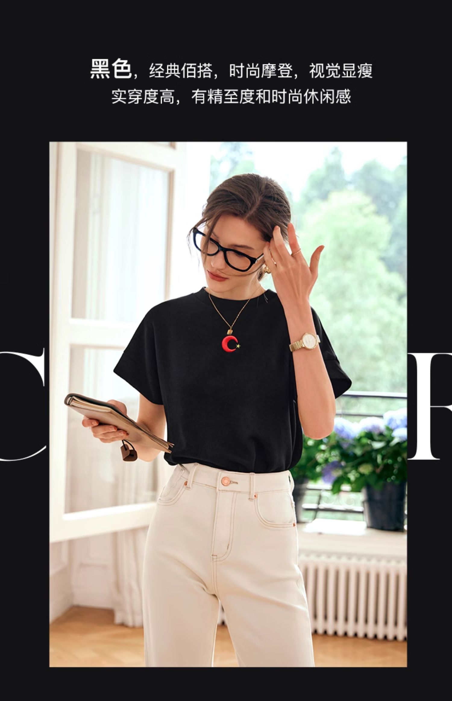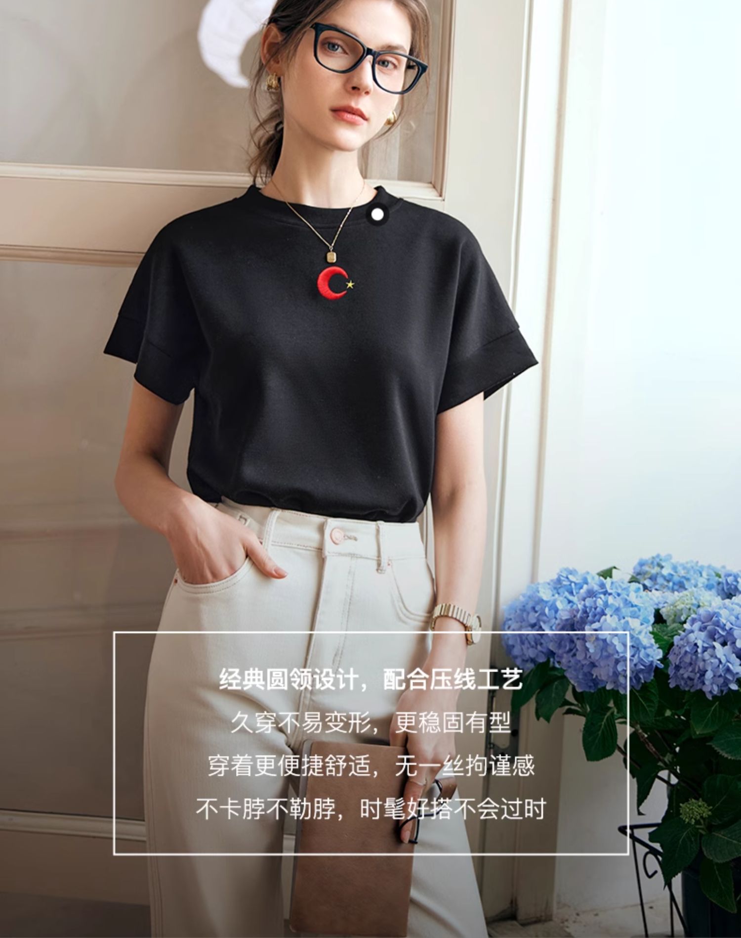 OLrain欧芮儿黑色T恤女春季2024新款小众宽松设计感刺绣短袖上衣
