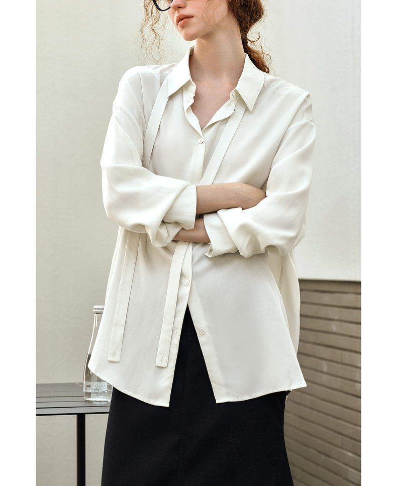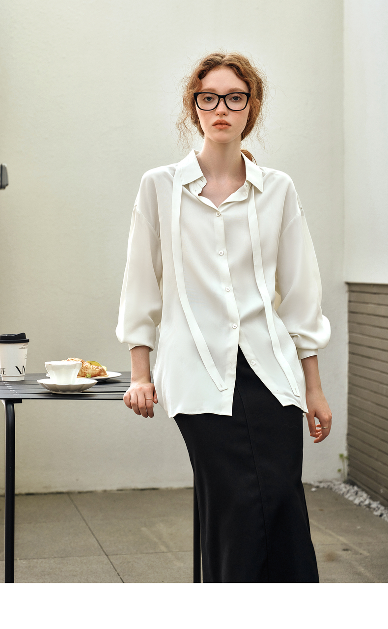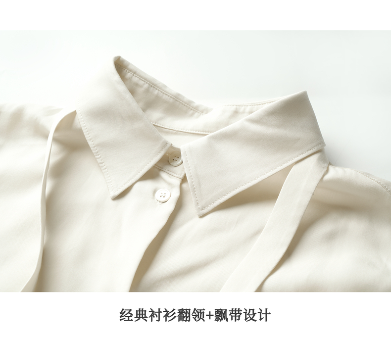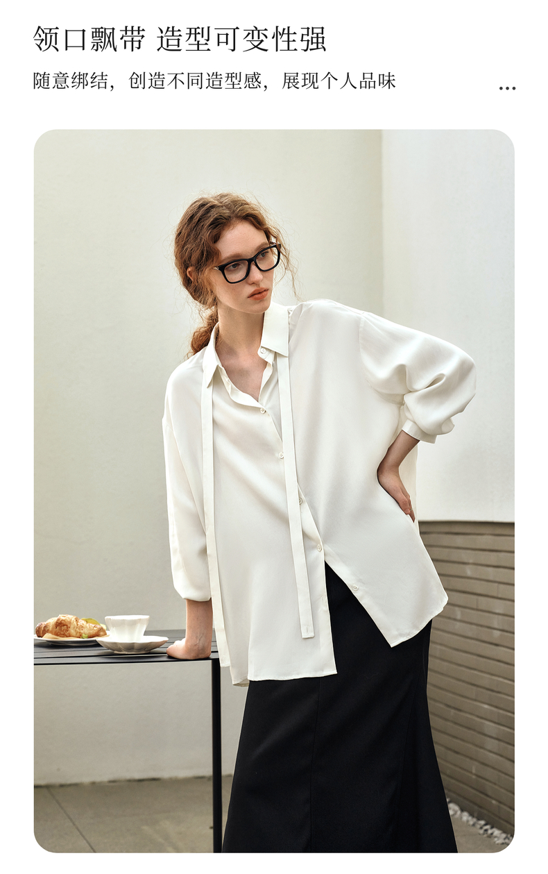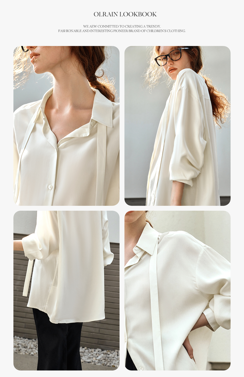 OLrain欧芮儿白色长袖衬衫女春季2025新款通勤气质飘带慵懒风衬衣