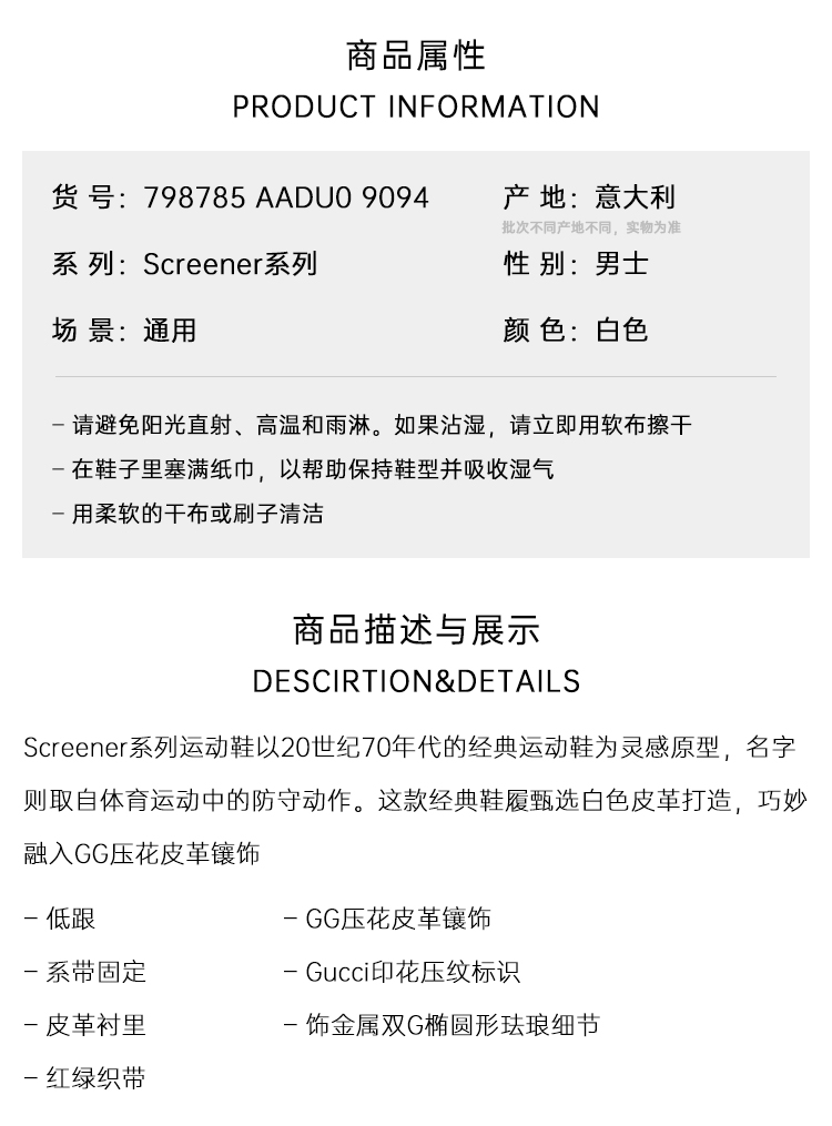GUCCI 古驰 男士Screener系列休闲运动鞋 白色 798785 AADU0 9094