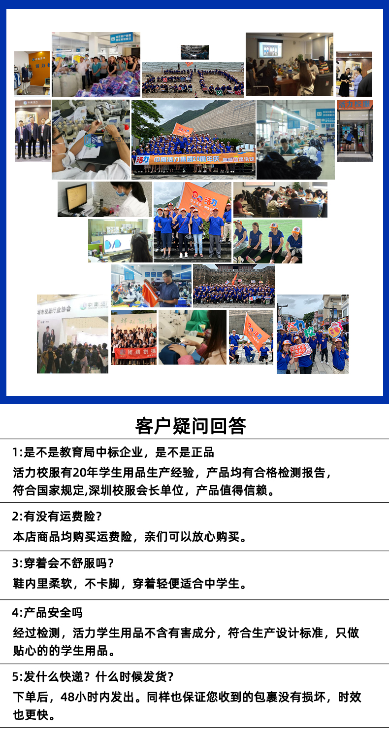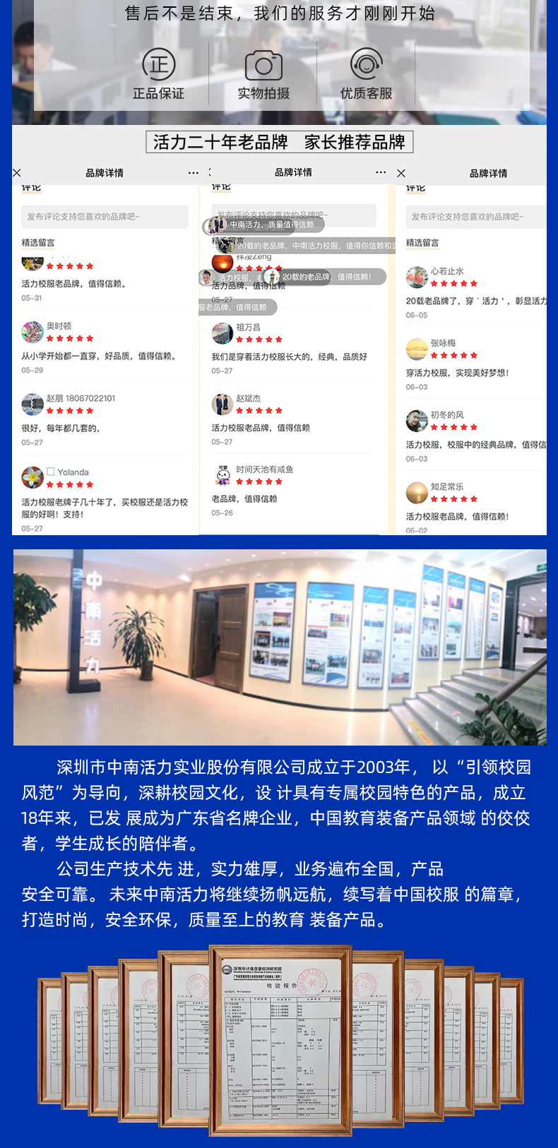 活力校服由深圳市中南活力实业股份有限公司创建的品牌,深圳二十一年老品牌,教育局中标企业;主营深圳校服、广州校服、东莞校服、佛山校服、肇庆校服、江苏校服、鞋袜、学生床上用品等学生课桌椅一站式教育领域产品