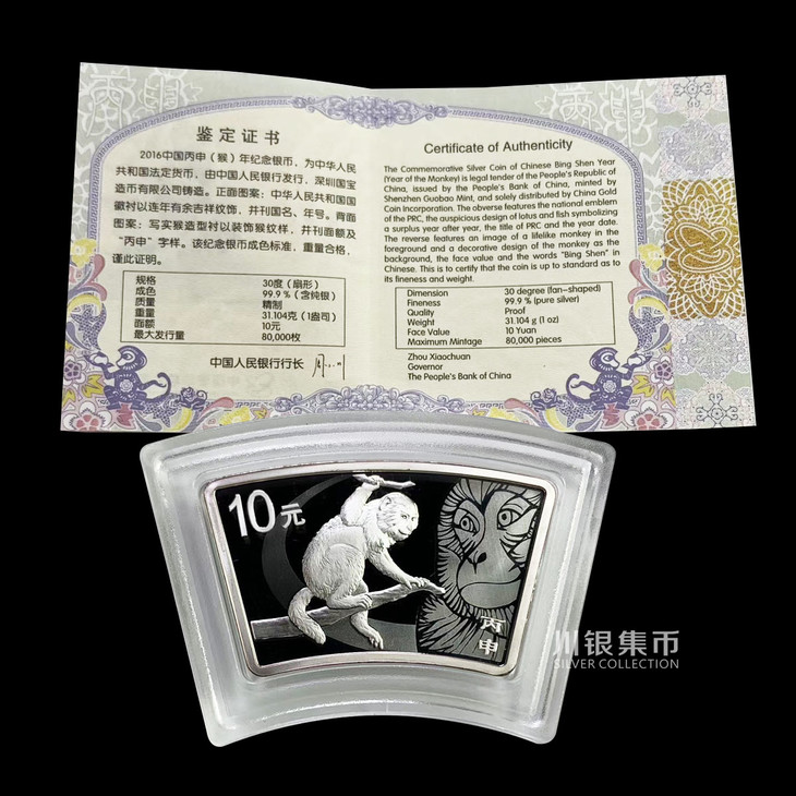 2016猴年扇形银质纪念币为精制币,含纯银31.104克(1盎司),外圆半径85毫米,内圆半径60毫米,圆心角30度,面额10元,成色99.9%,最大发行量80000枚。