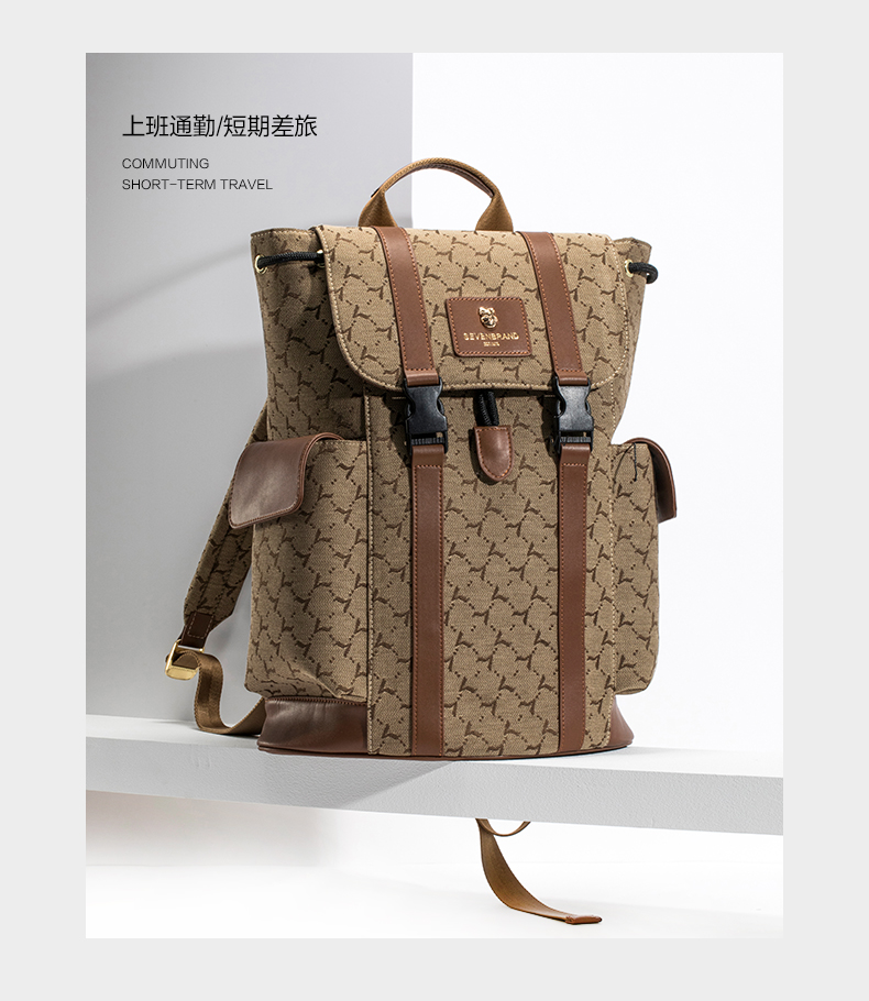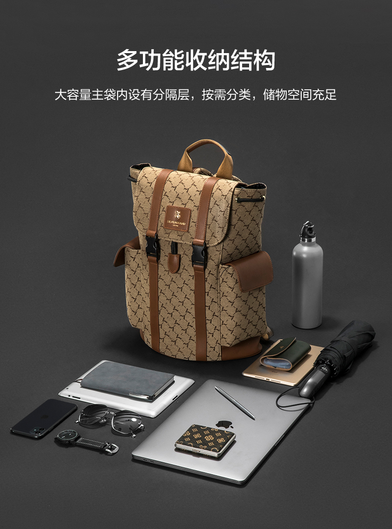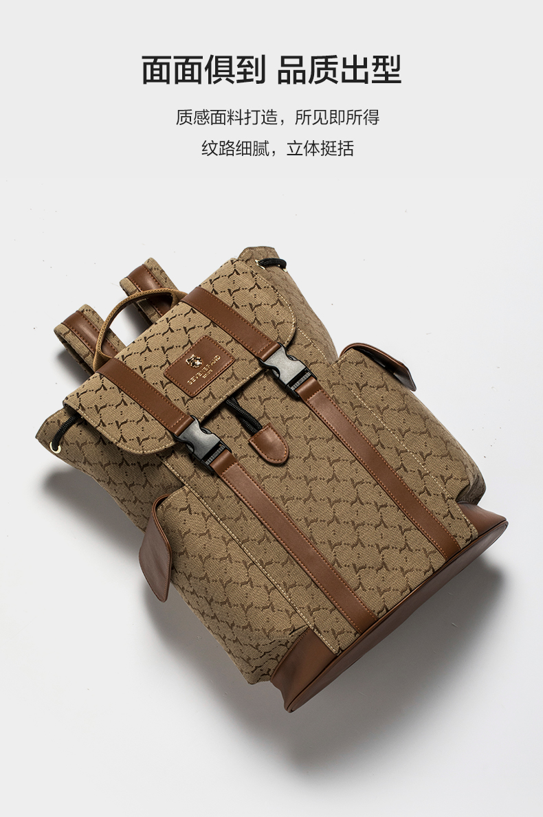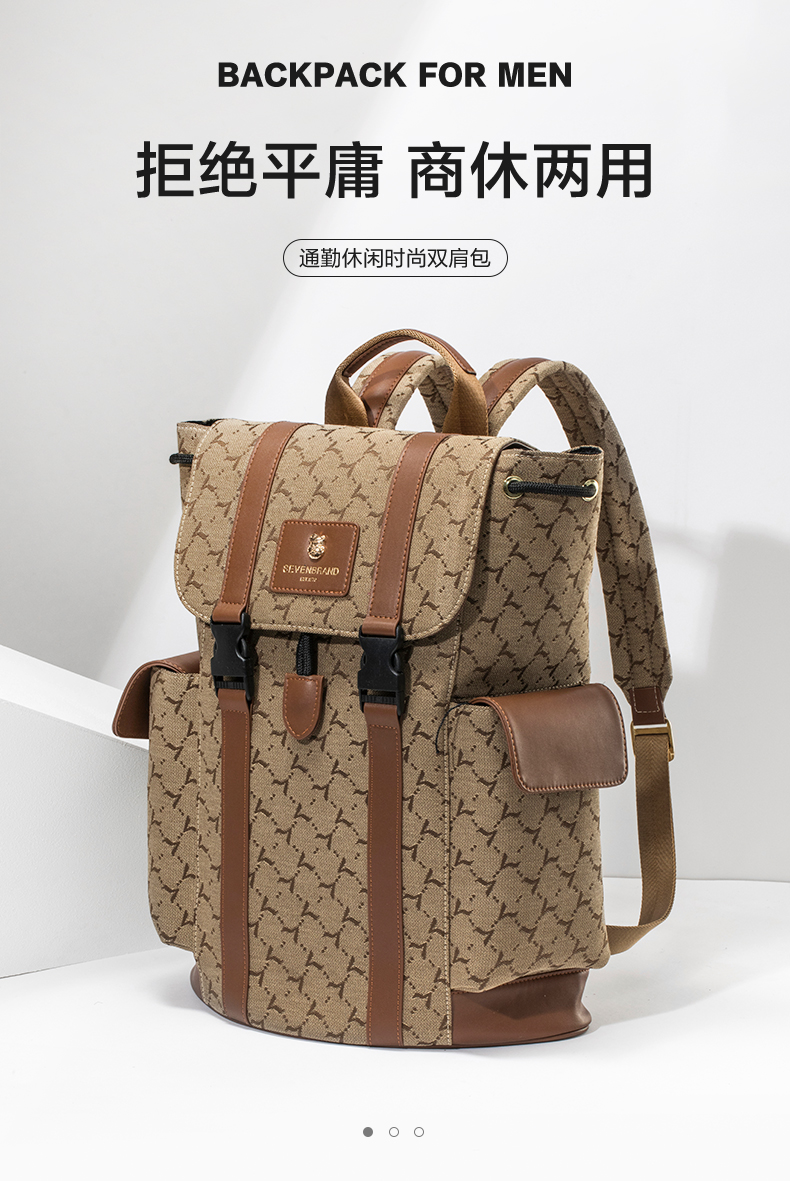 柒牌男包年新款商务通勤复古时尚休闲百搭卡其色插扣双肩背包 124P70120