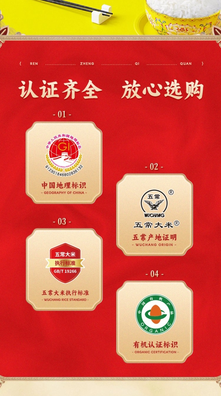 2、有身份的稻花香:执行标准GB/T 19266、国家地理标识产品、五常产地证明;