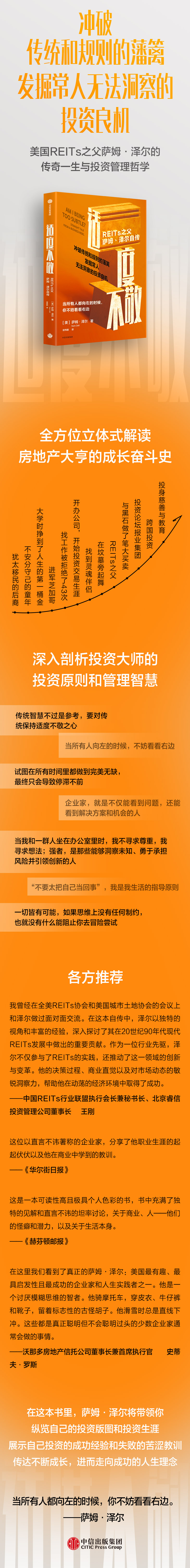 1.一书读懂“REITs之父”的财富人生。从移民的儿子到成为美国亿万富豪,从找工作面试屡屡被拒到成为成功的企业家之一,从一套房子做起到成为美国REITs之父,萨姆·泽尔将自己毕生的投资智慧和管理哲学凝结于此书中。通过这本书,你将深入了解一代地产大亨、传奇投资人跌宕精彩、引人入胜的成长故事。2.严谨创新的投资原则和独树一帜的管理原则。比如:流动性等于价值;传统智慧不过是参考;当有人向左的时候,不妨看看右边;试图在有时间里都做到美无缺,终只会导致停滞不前;企业家,就是不仅能看到问题,还能看到解决方案和机会的人;当我和一群人坐在办公室里时,我不寻求尊重,我寻求想法;强者,是那些能够洞察未知、勇于承担风险并引领创新的人。