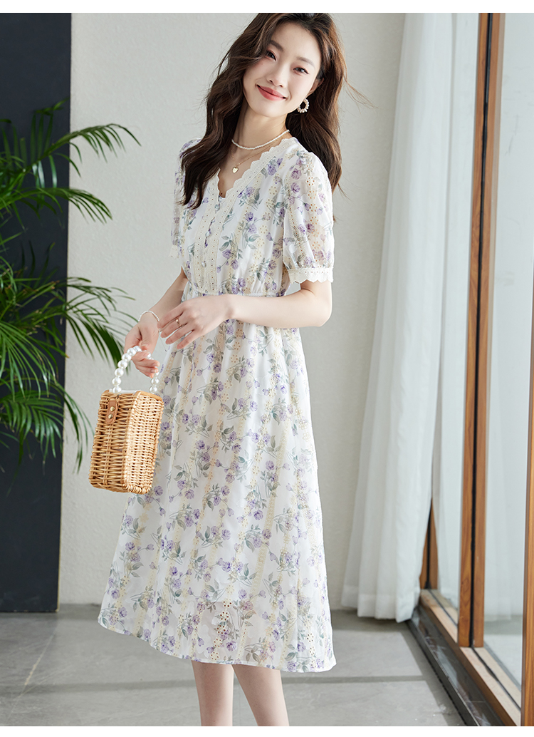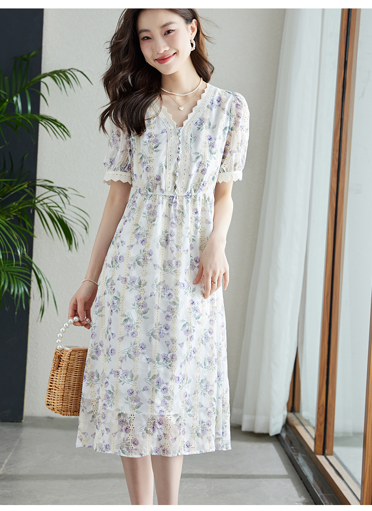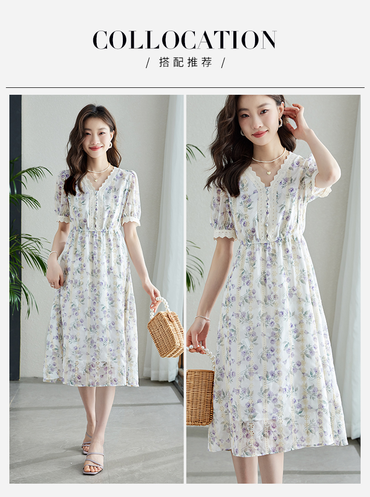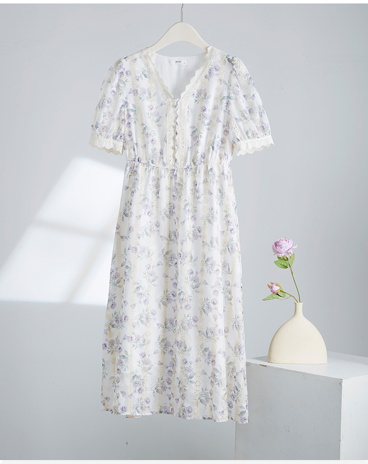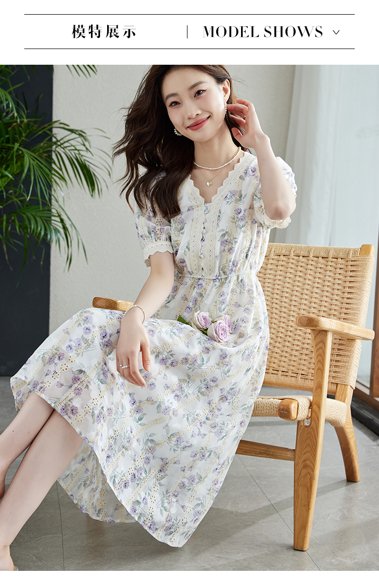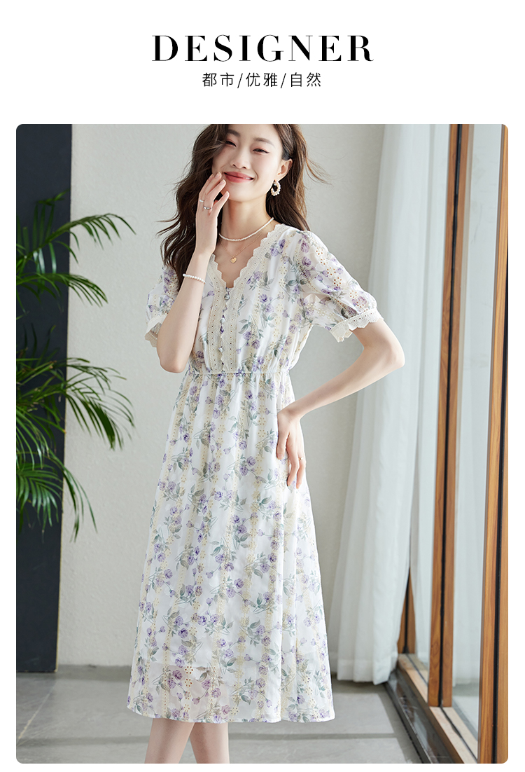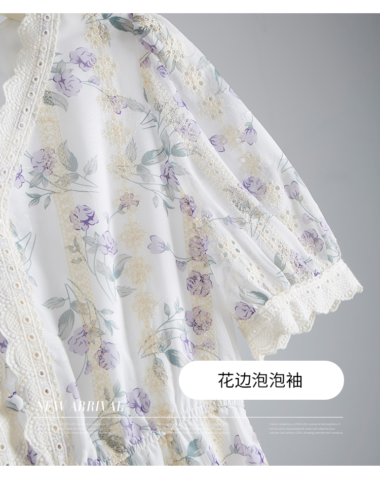 【专属特价】熙世界轻奢重工蕾丝花边V领连衣裙女夏季短袖收腰刺绣雪纺碎花裙