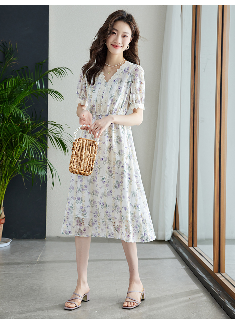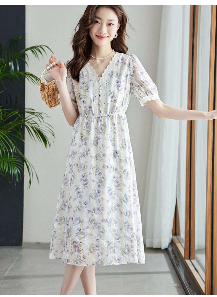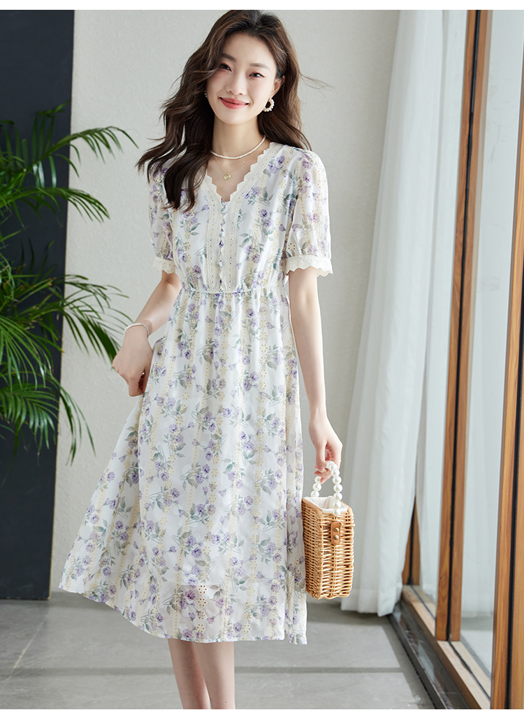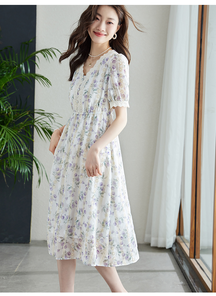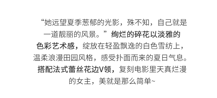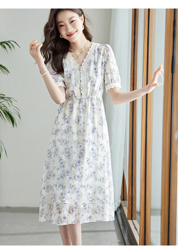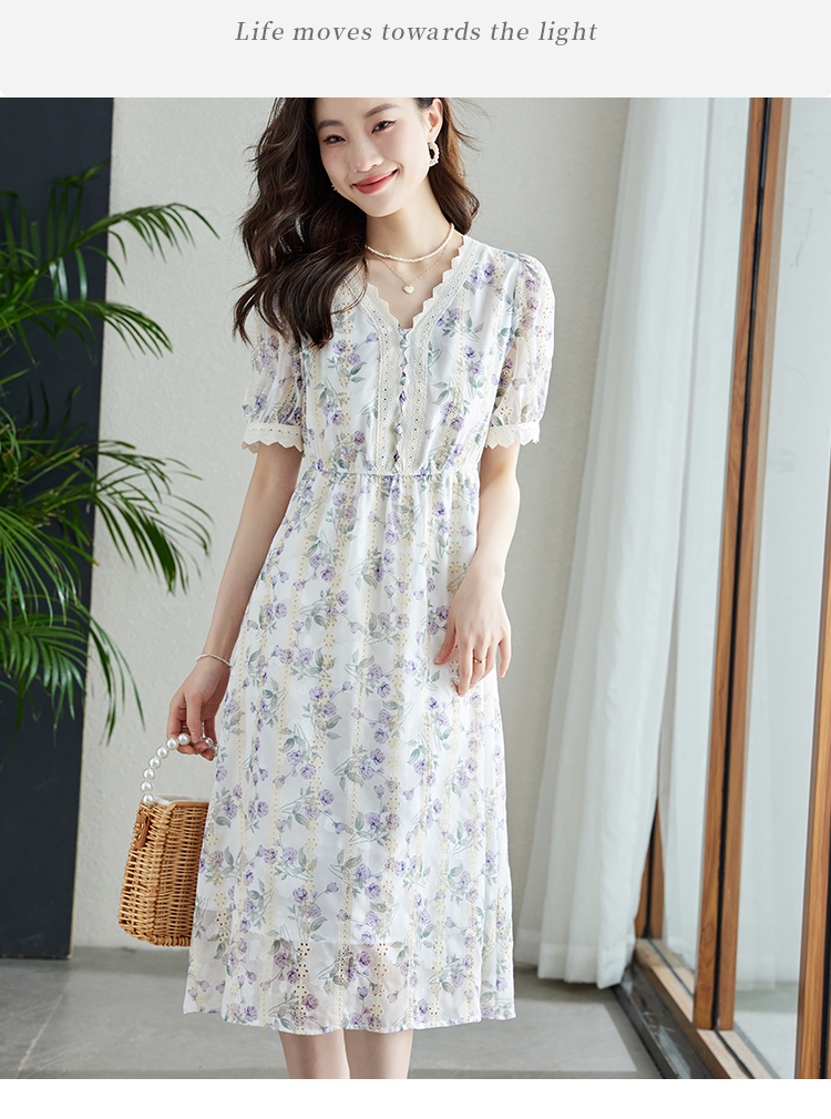 【专属特价】熙世界轻奢重工蕾丝花边V领连衣裙女夏季短袖收腰刺绣雪纺碎花裙