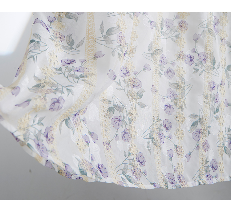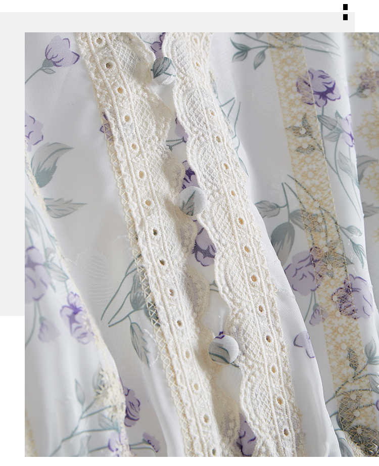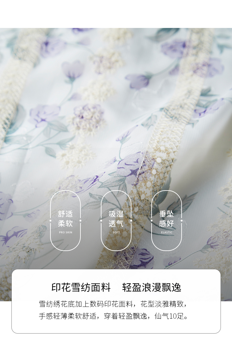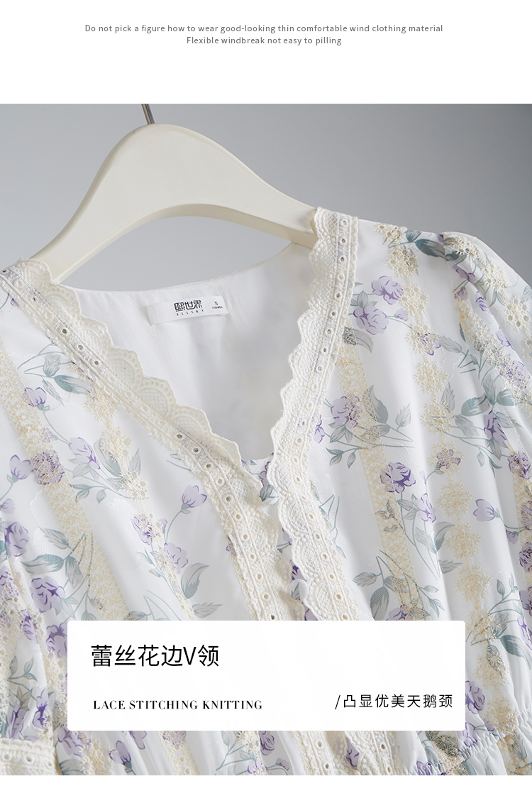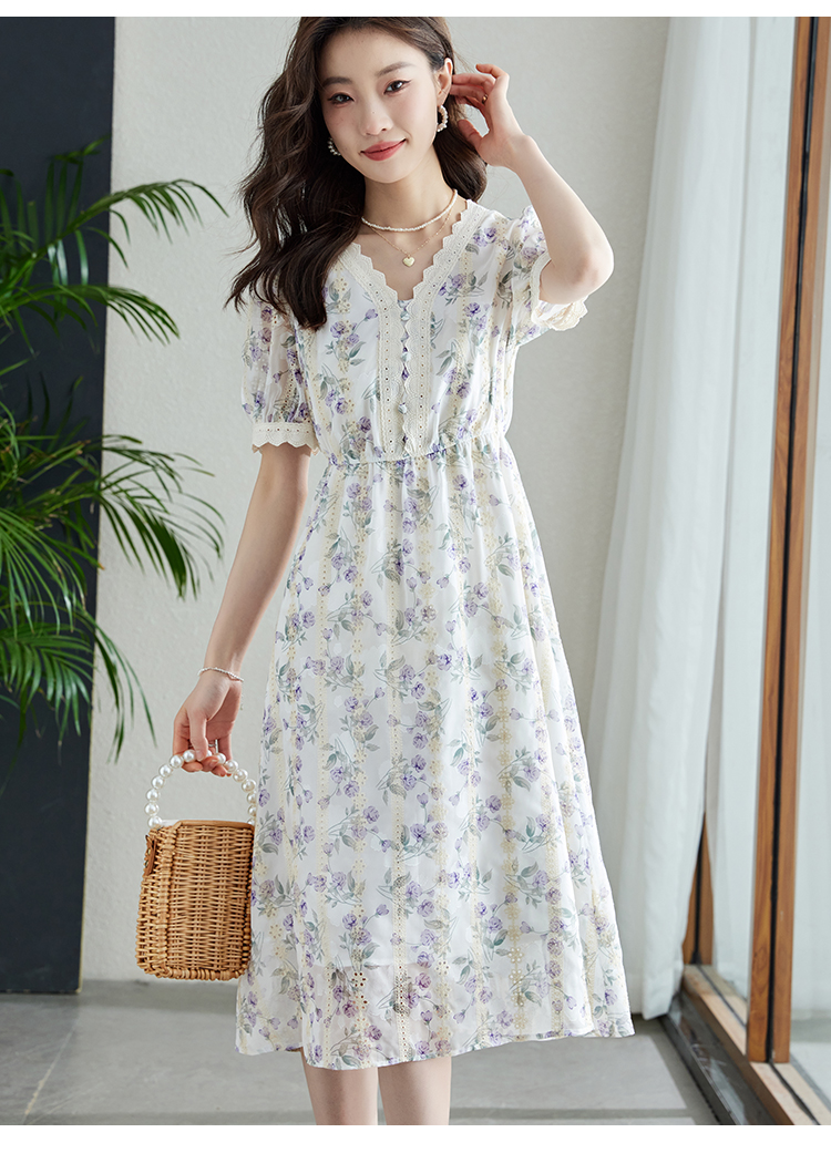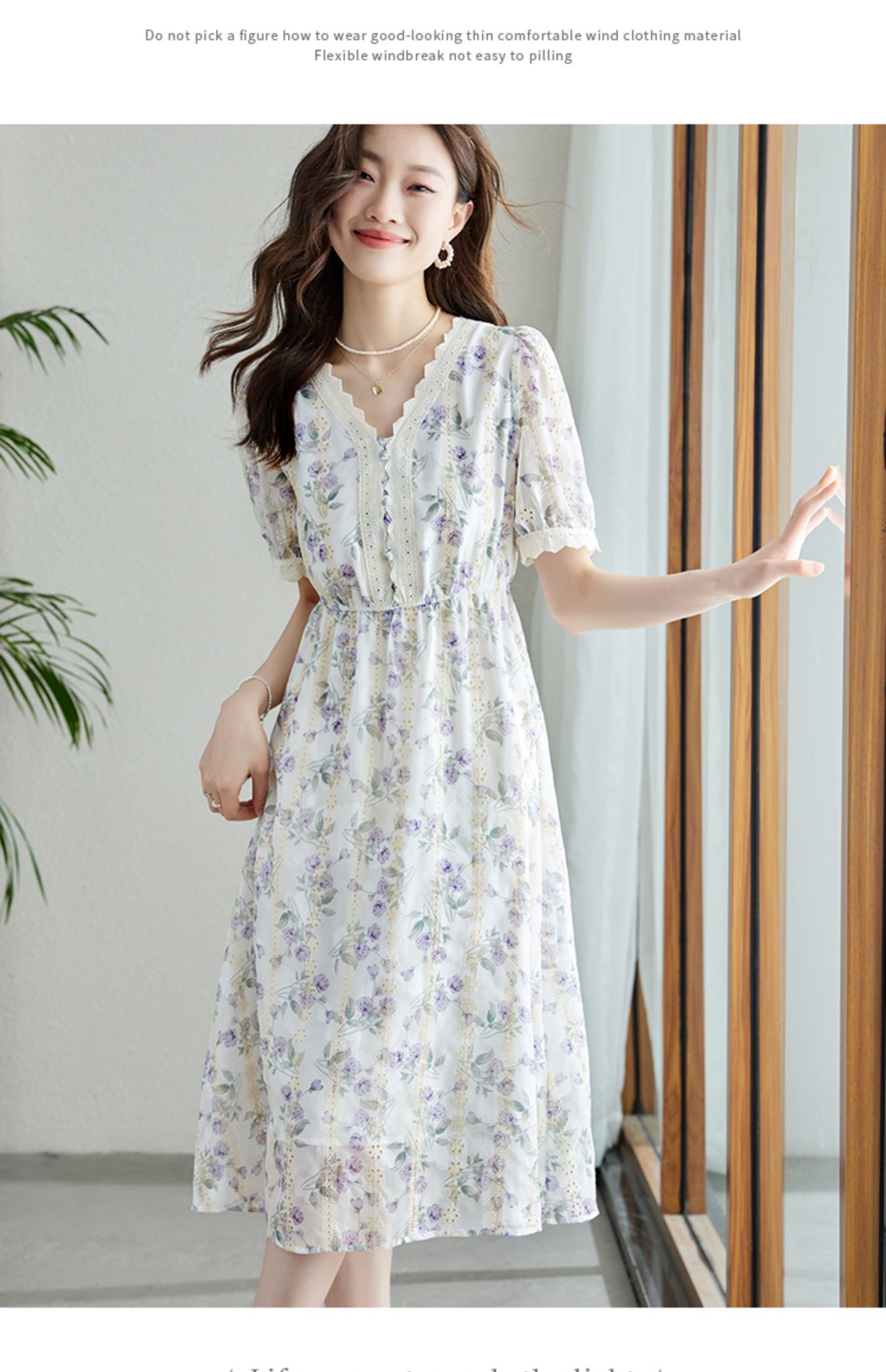 【专属特价】熙世界轻奢重工蕾丝花边V领连衣裙女夏季短袖收腰刺绣雪纺碎花裙