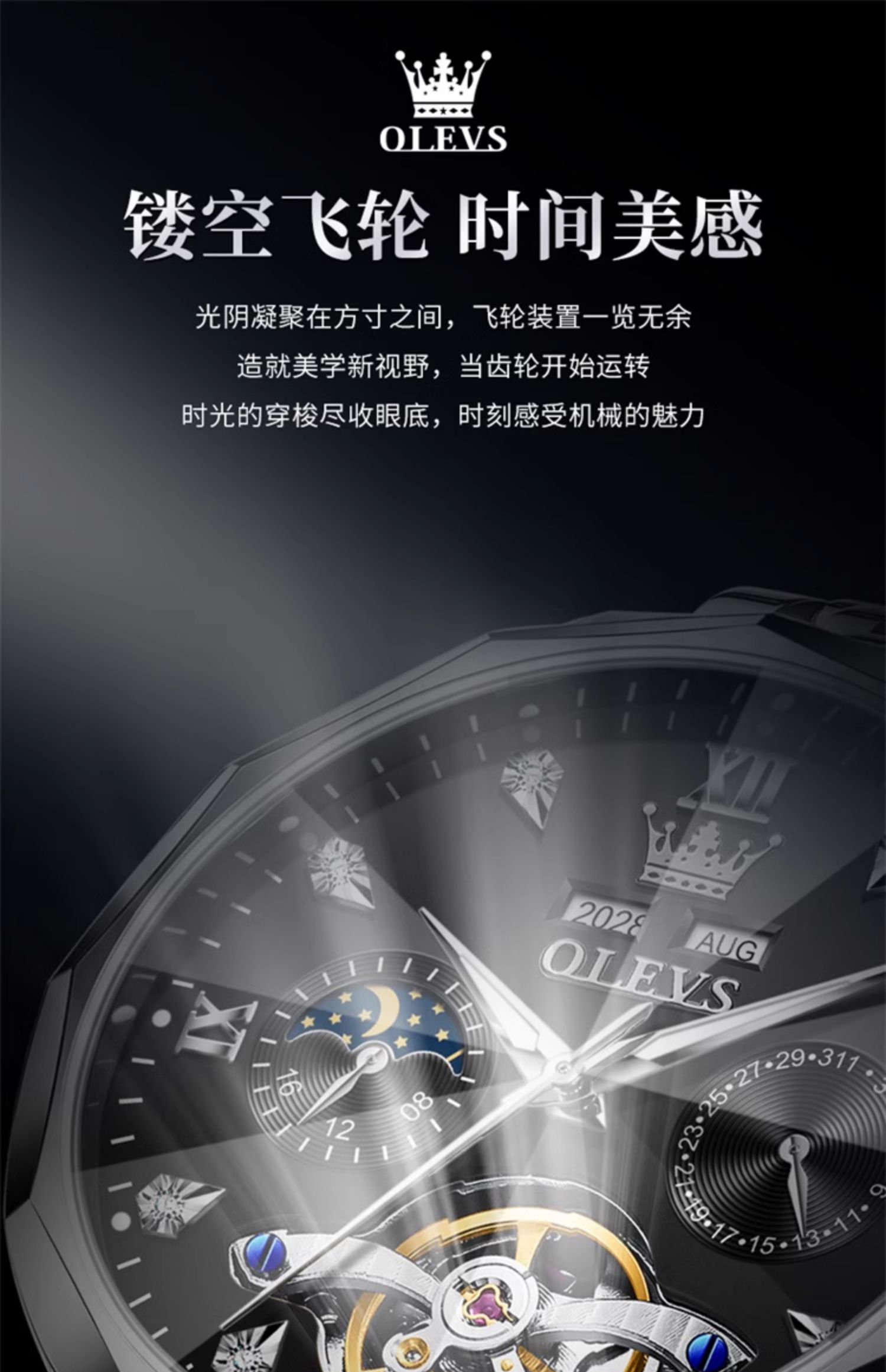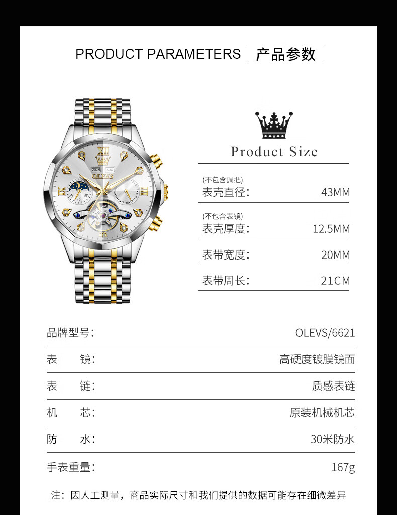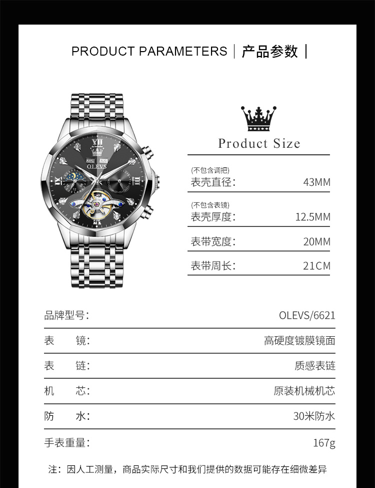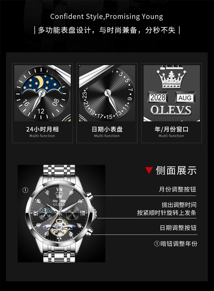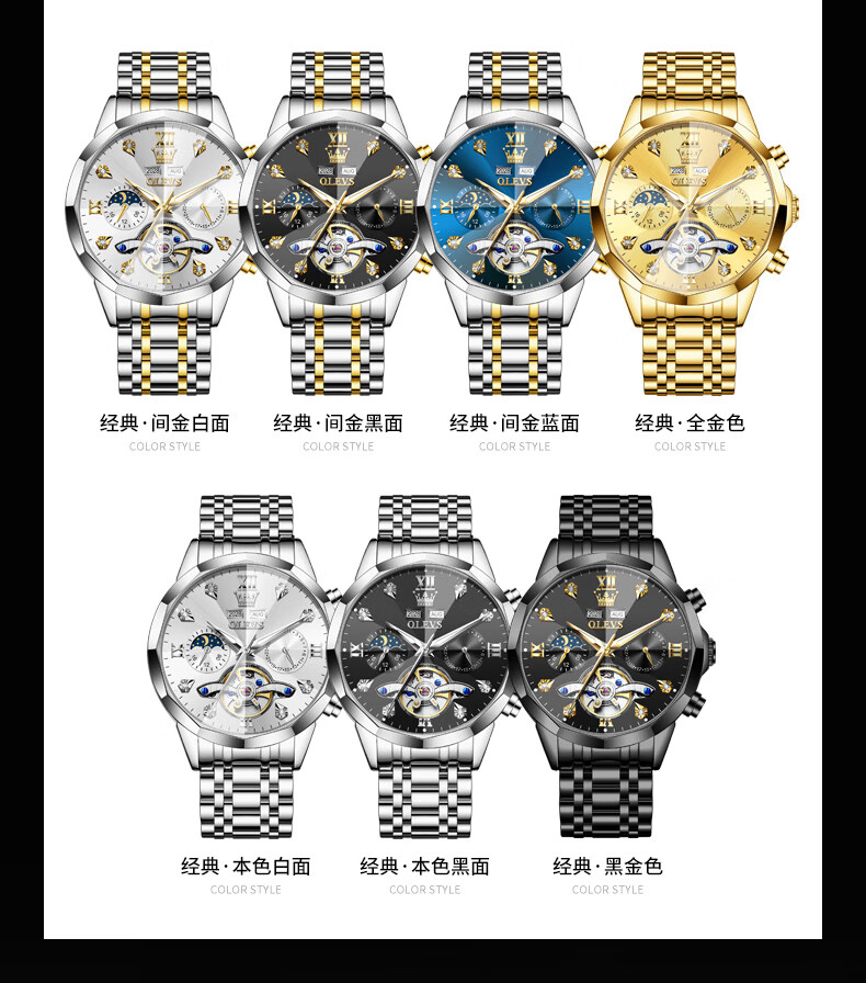 欧利时OLEVS 机械表 6621系列 瑞士认证品牌多功能全自动夜光防水机械手表