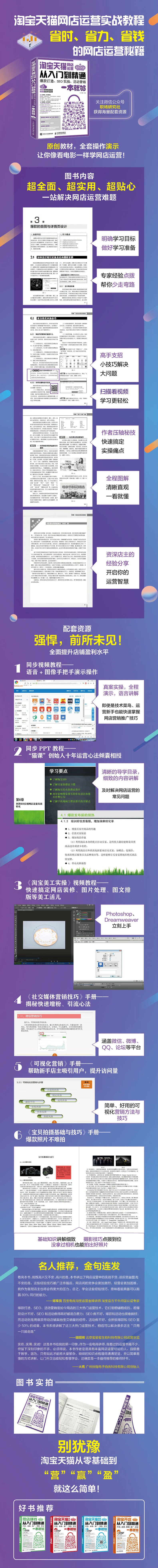 《淘宝天猫网店运营从入门到精通 爆款打造、SEO实战、活动营销一本就够》可作为电商从业者全面了解淘宝天猫网店运营各个细节的参考书,还可作为各类院校或培训机构电子商务相关专业的教学辅导书。