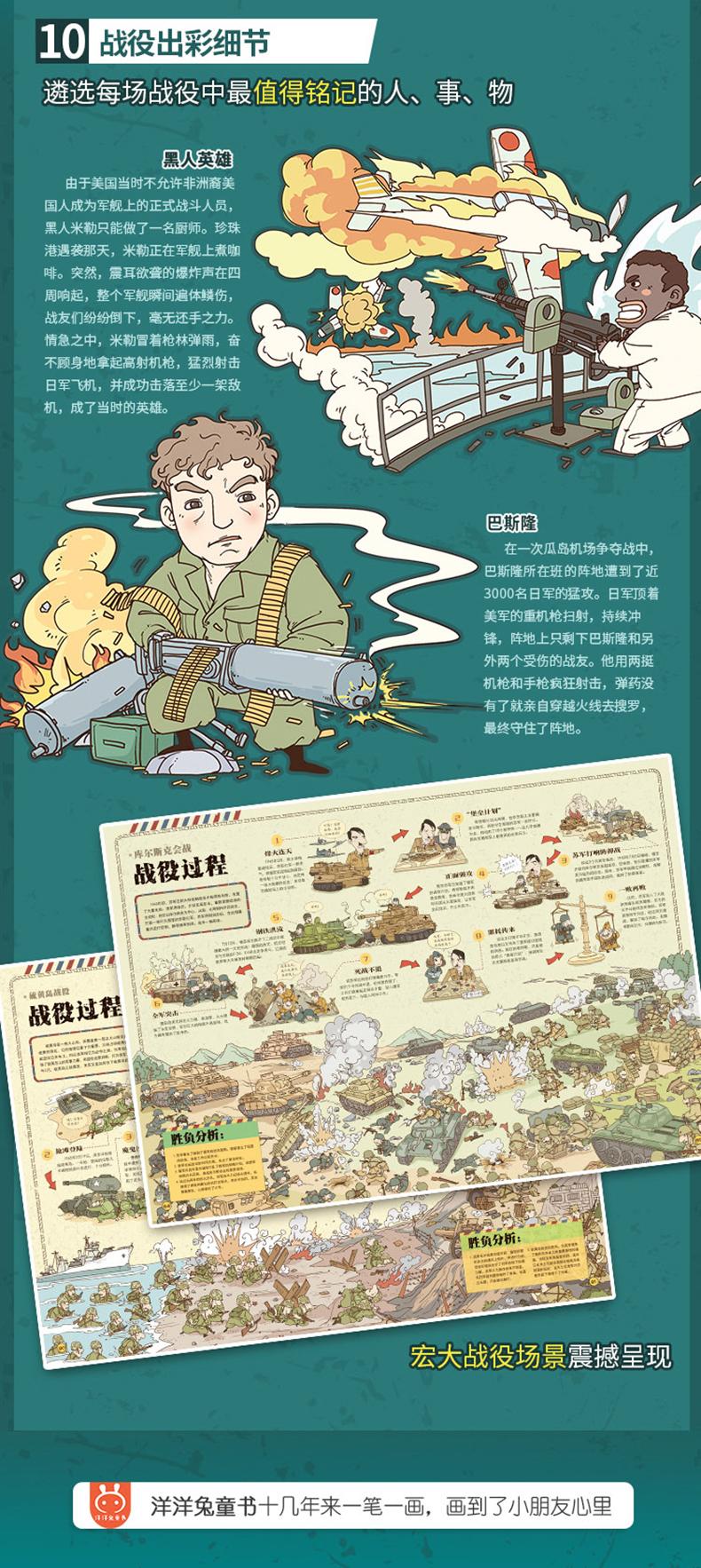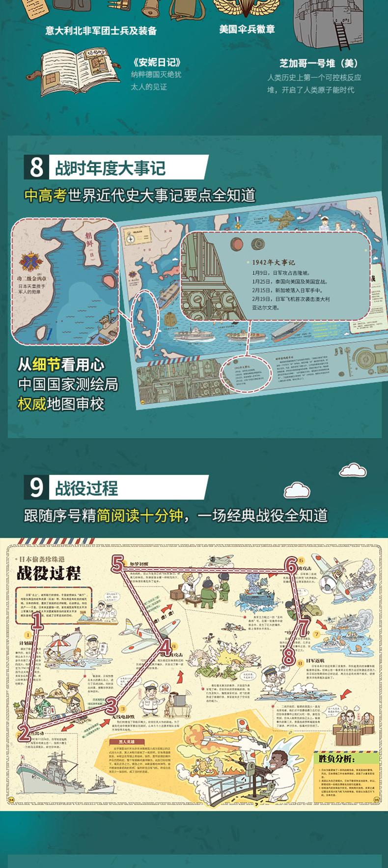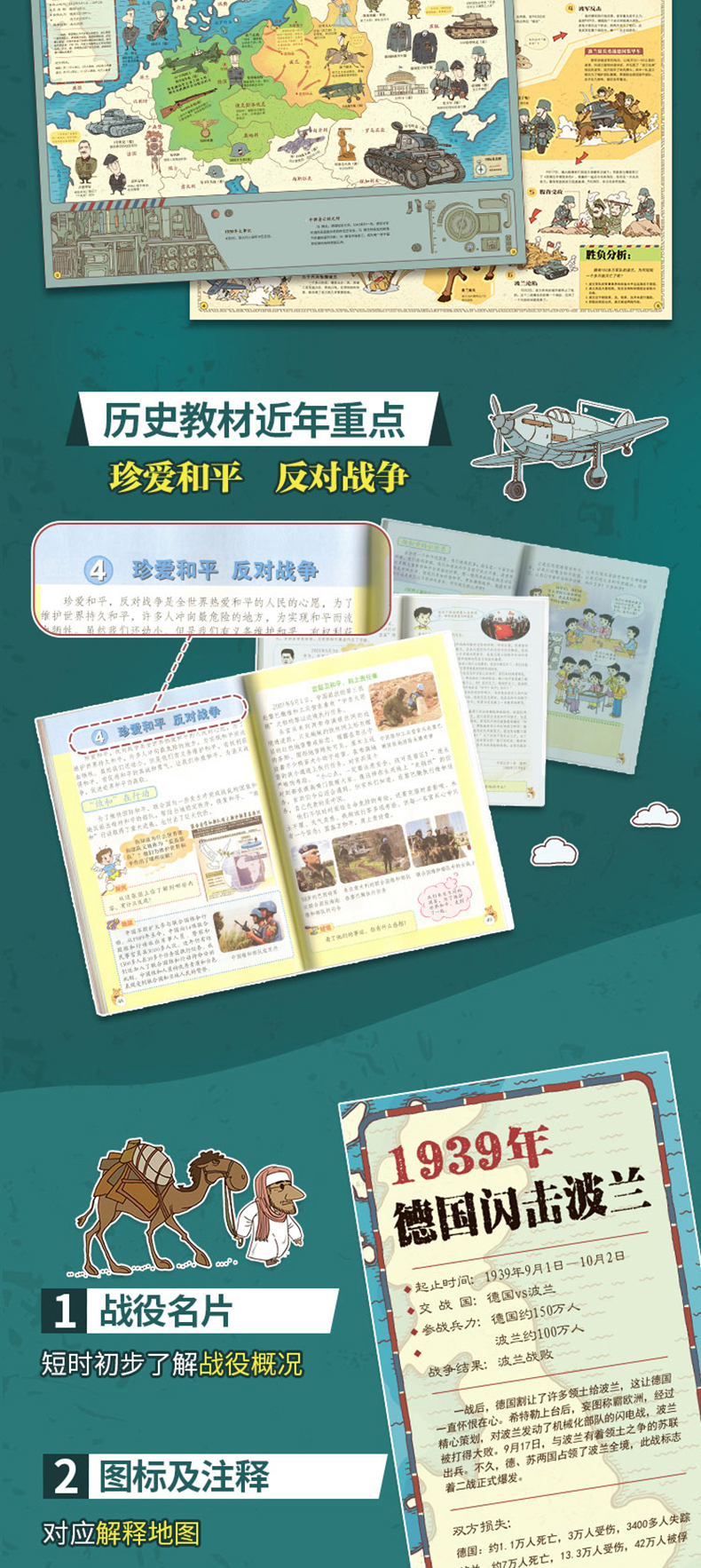 适读人群 :7-10岁 1.通过地图配合文字直观呈现战局。本书中没有沉重的战争,也没有枯燥的历史,只有趣味十足的漫画和风趣的解说,迅速拉近高冷二战与小读者之间的距离。 2.通过22个二战经典战役将整个二战历史串联起来,知识量丰富,知识点有趣。在高考历史分数占比逐年增加的趋势下,孩子的二战史薄弱环节,我们帮您解决! 3.每个战役下方的知识板块内,罗列总结了历年的战争大事件,掌握历史、丰富学识,一个也不落。