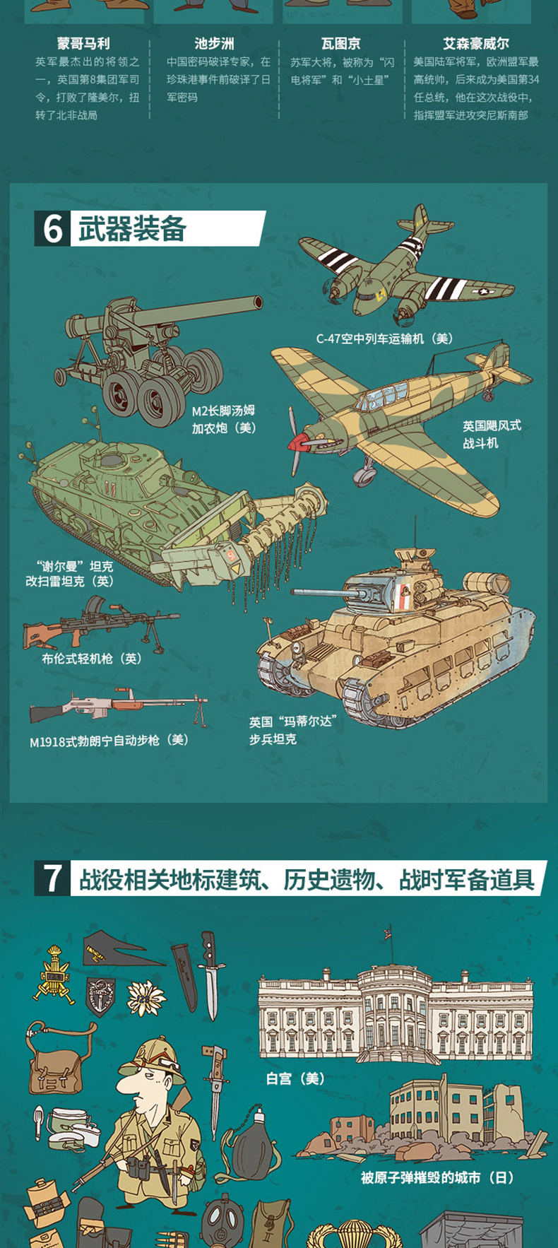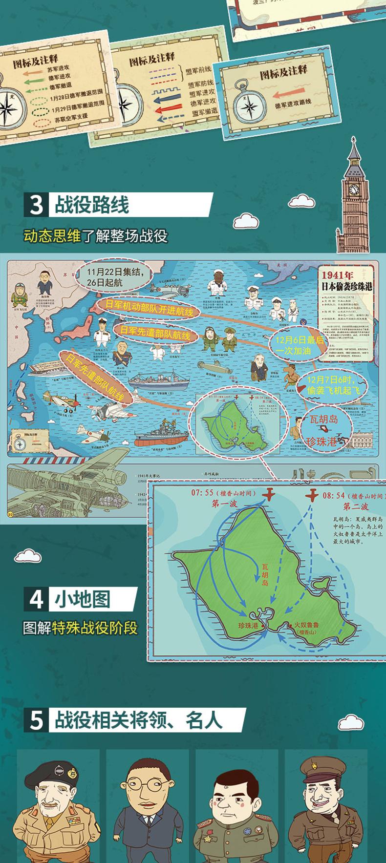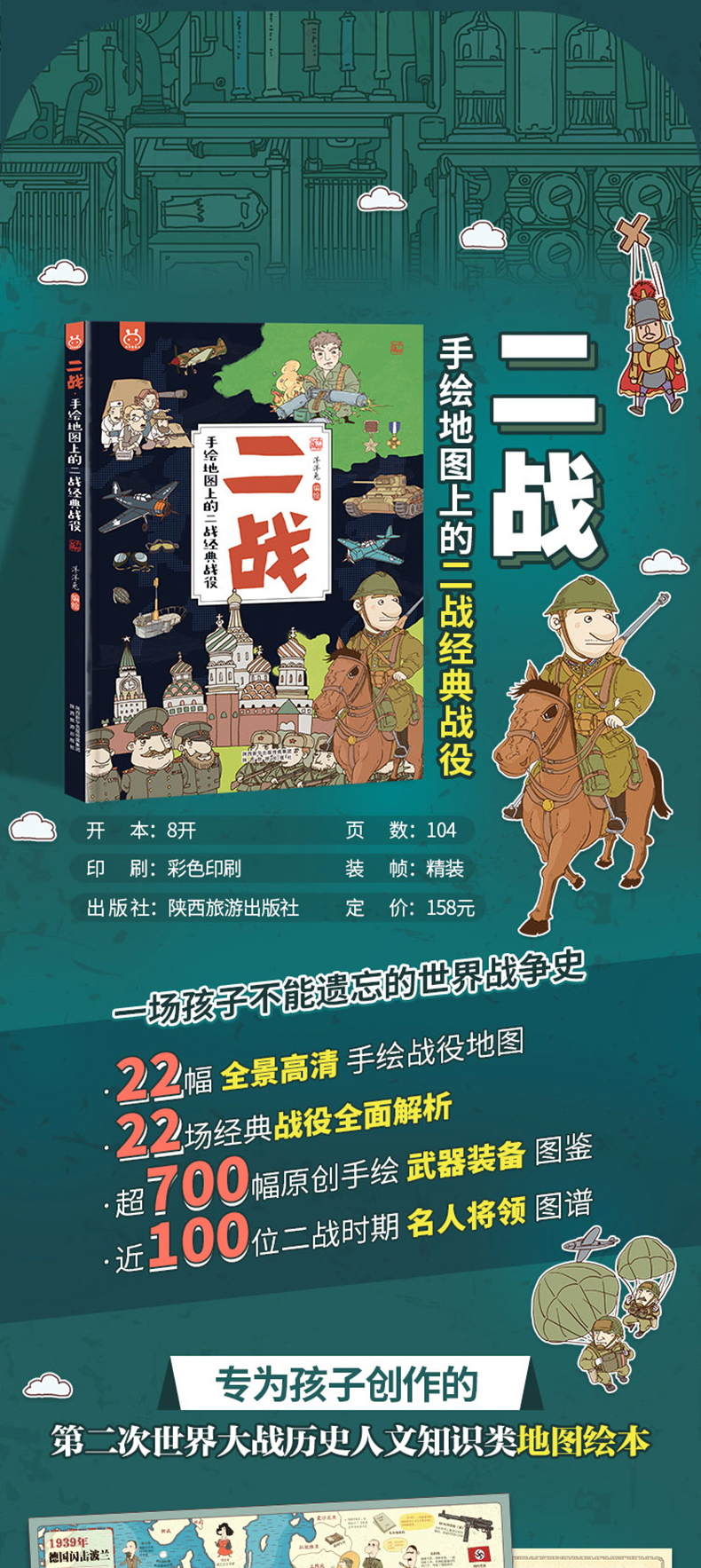 《二战·手绘地图上的二战经典战役》是一本关于第二次世界大战的人文知识类地图绘本,我们从欧洲、非洲、亚洲、太平洋、大西洋这五个重要战场上,主要选取了22个经典战役,以小朋友便于理解的口吻,对其战役地图、进攻路线、战役过程等做了简要的介绍及剖析。 在每个战役欧中,小朋友都能从战役地图部分,认识到与本次战役相关的军事将领、武器装备、重大历史事件、重要地标、历史名人等等。而战役过程部分,则会将整个战役的要点进行梳理,再深入浅出地讲给小朋友。